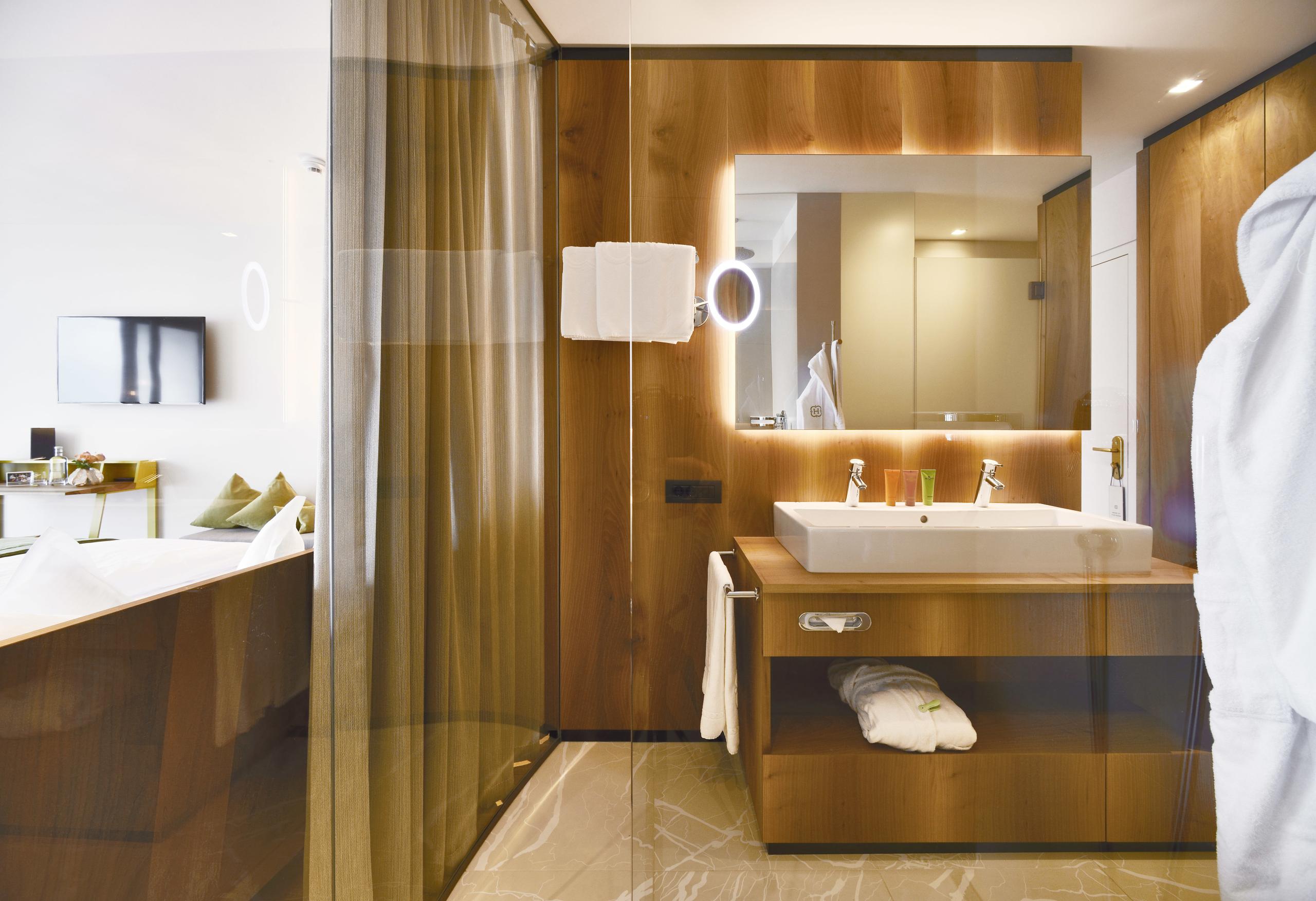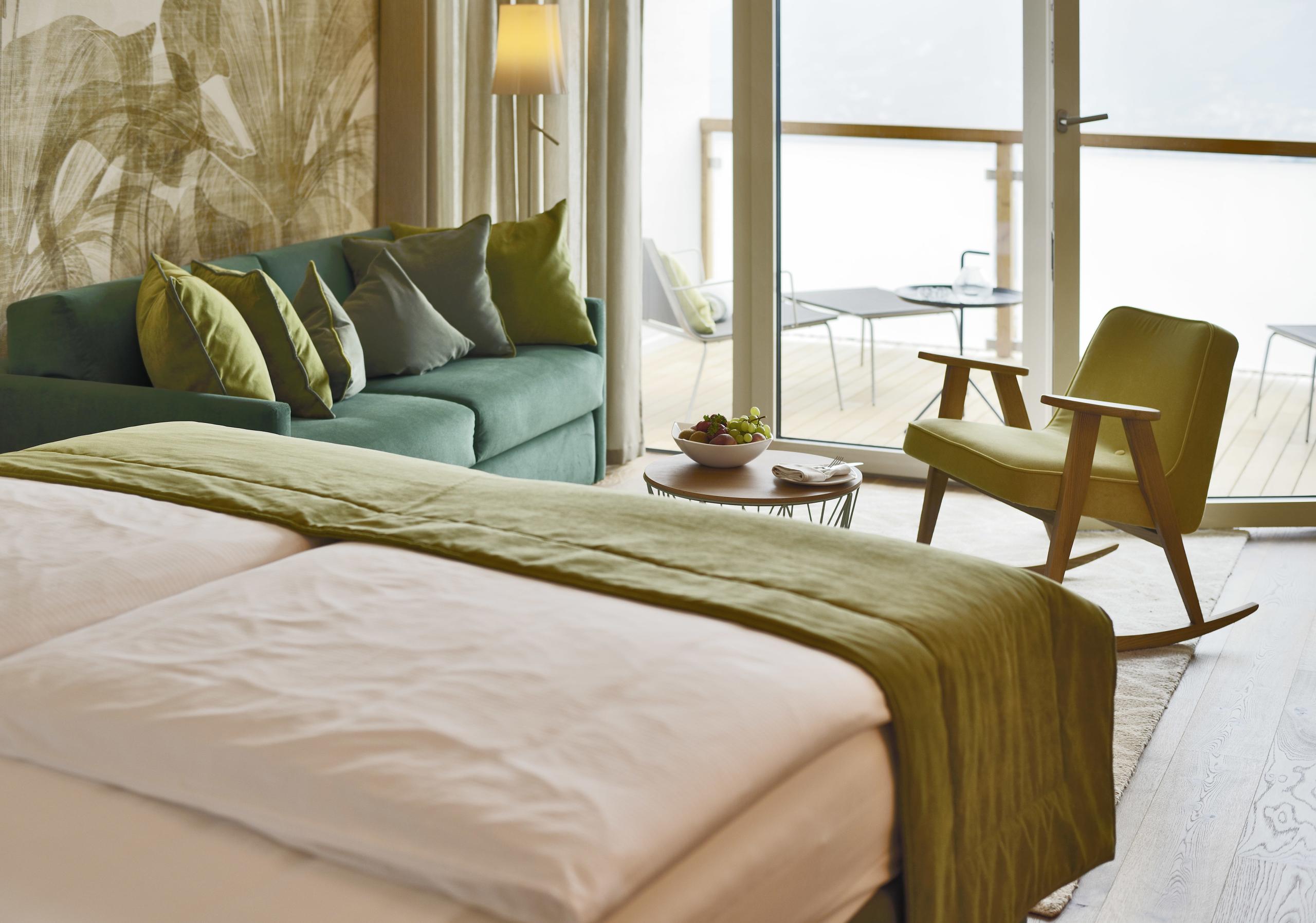 The combined living room and bedroom stands out with modern green tones, high-quality furniture and fine wooden floors. Large balconies with stylish sun loungers round off the interior experience. The bathroom with double washbasin and large window looks out over the surrounding mountains. Modern climate ceilings ensure cosy temperatures in the chilly season and pleasant freshness in summer. Dogs are not allowed in this room.