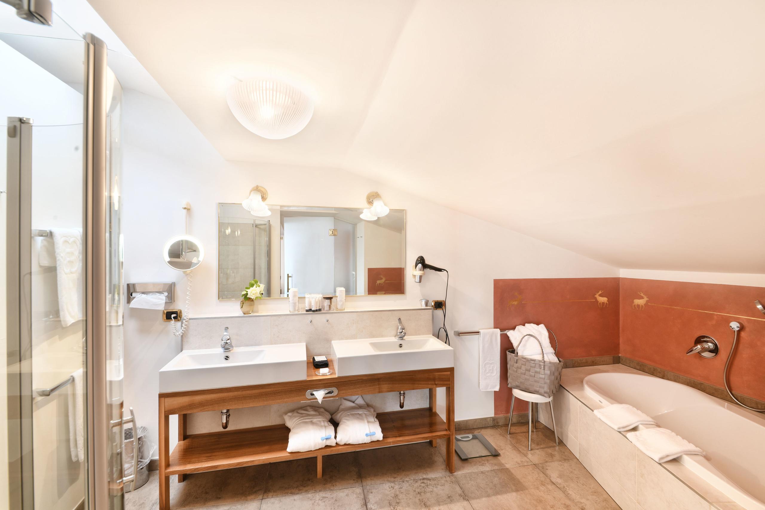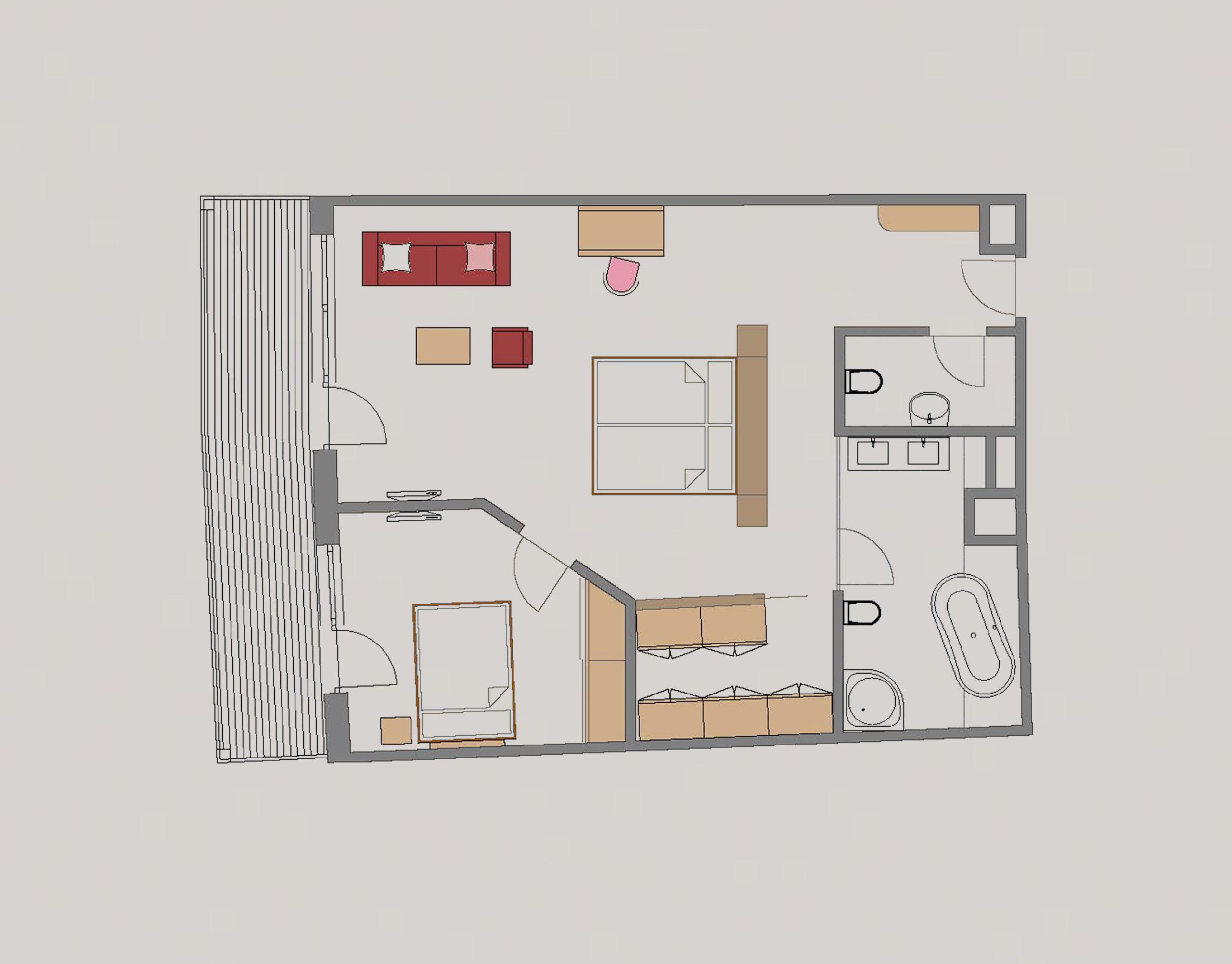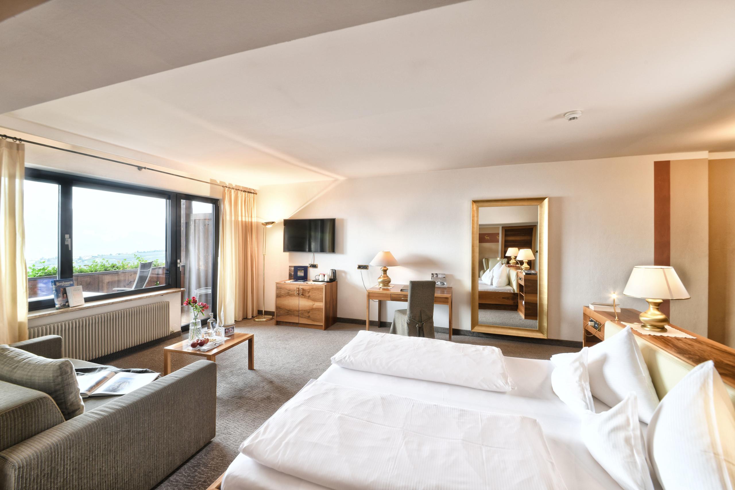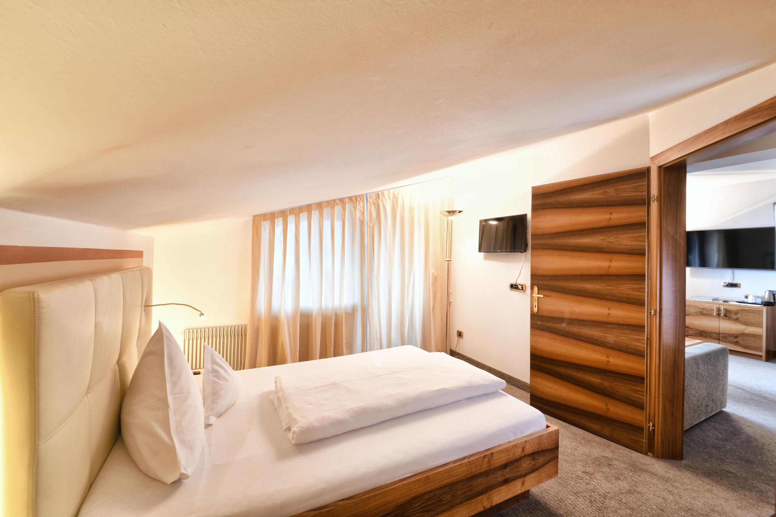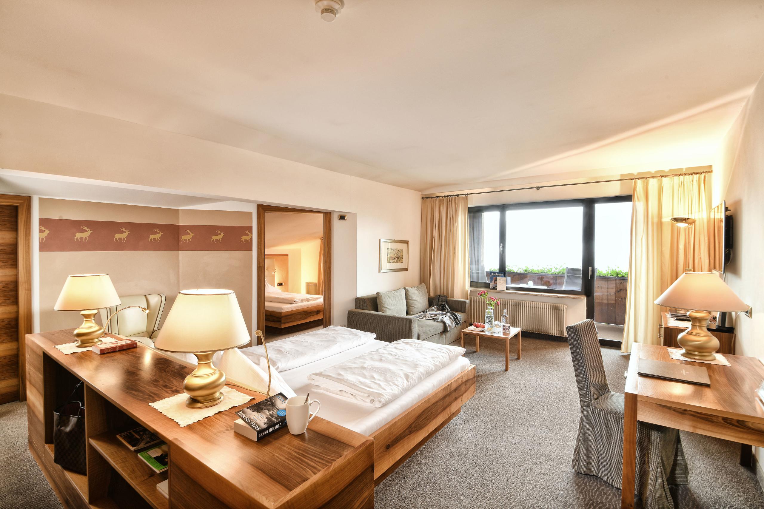 The extremely spacious Rubein Suite is located on the top floor of the Main House and invites you to enjoy the far-reaching views from its balcony. Walnut wood, warm, earthy fabrics and the ergonomic layout give the suite an alluring elegance. Equipped with a double bed in the main bedroom, a spacious walk-in wardrobe and an adjoining room with a queen-size bed, the suite offers space for mountains of relaxation!