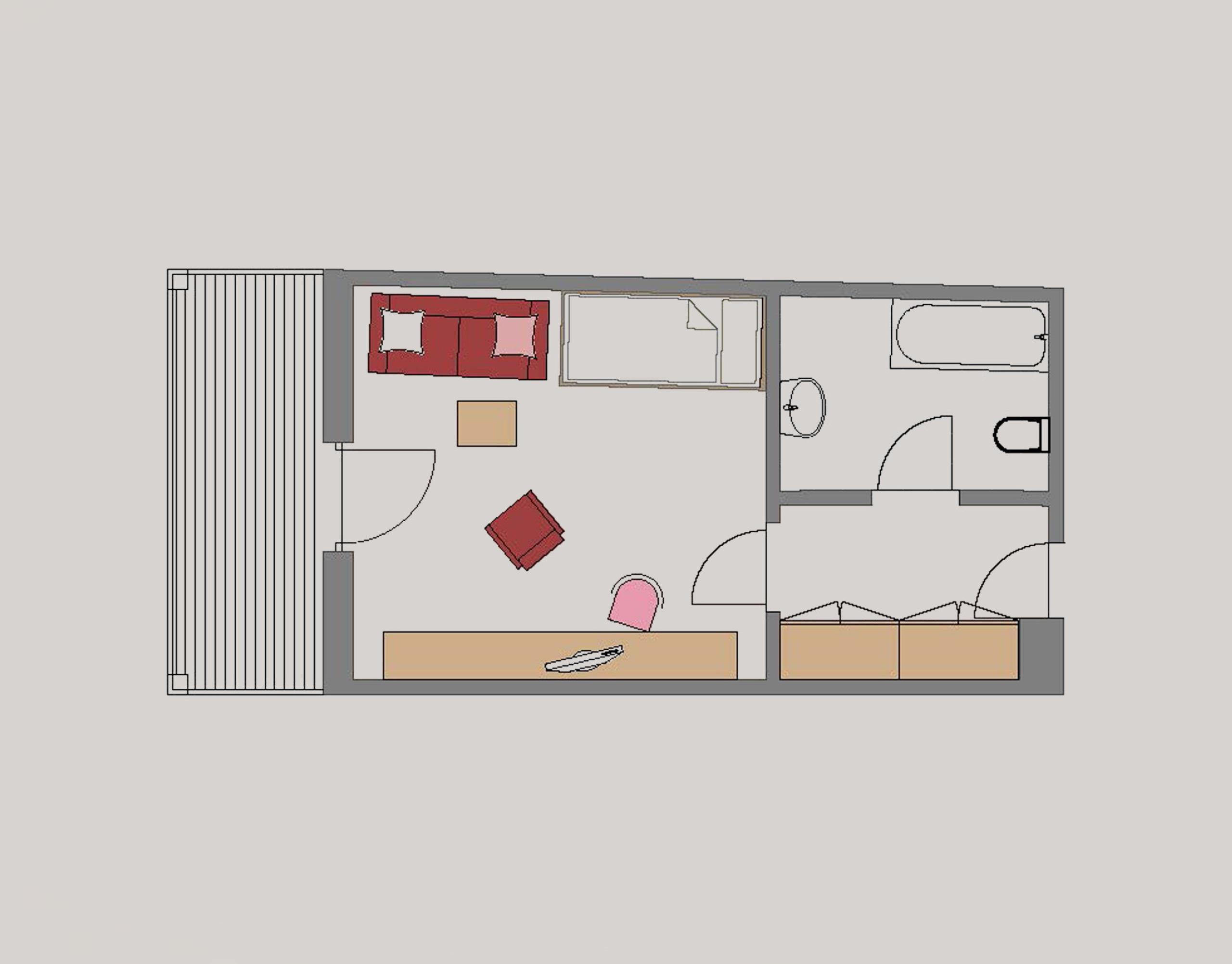 traditional wooden balcony with seating area | bathroom with bathtub | hair dryer & cosmetic mirror | living area with sofa | desk with LAN connection | telephone, safe & Wi-Fi | flat-screen TV | minibar | carpeted floor