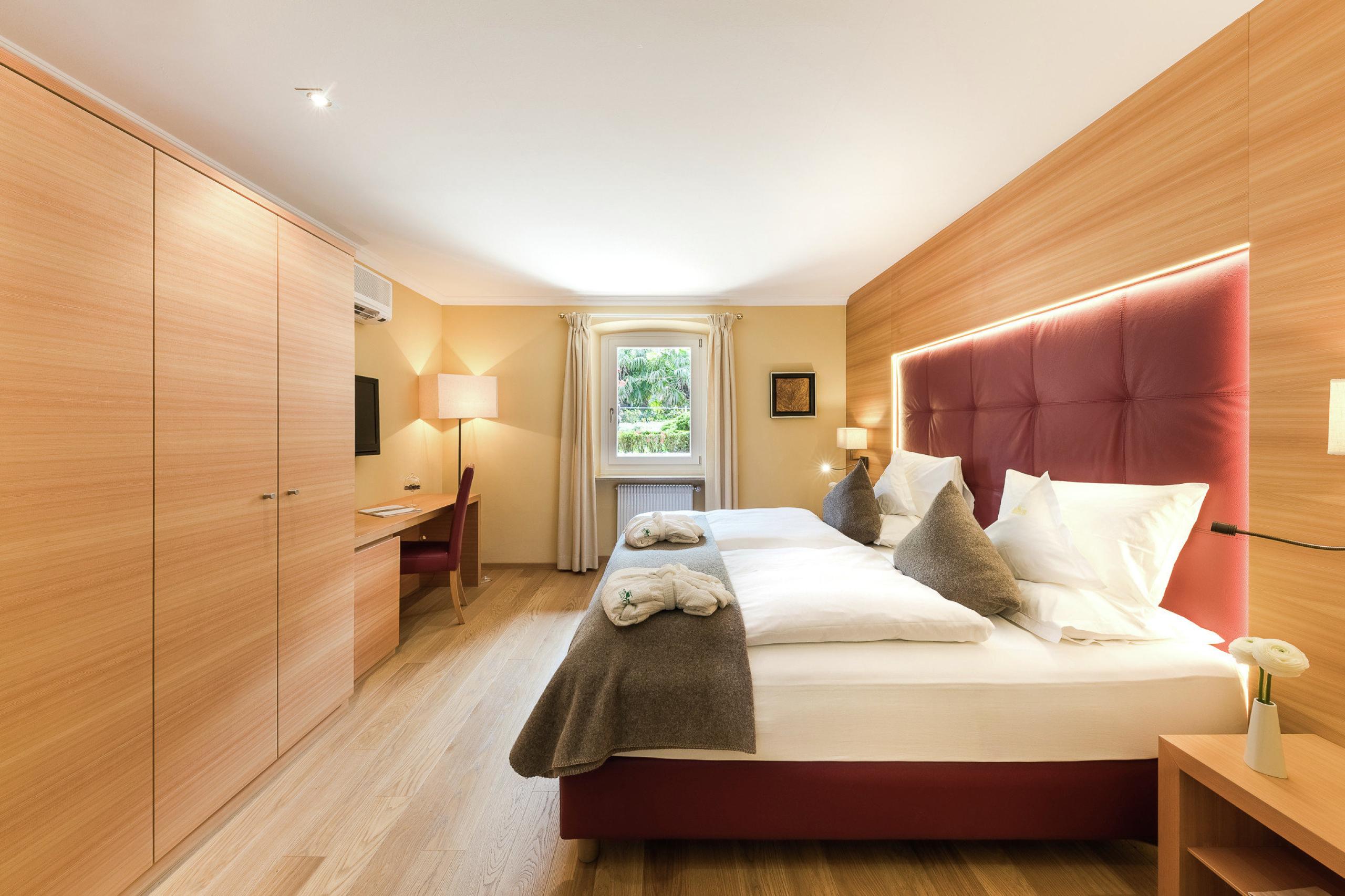 King-size bed | Separate living area | Two bathrooms | Hot tub | Steam sauna | Oak parquet floor | High-quality L'Occitane care products | Bidet | Hairdryer | Makeup mirror | Large terrace | Flat screen TV | Telephone | WiFi | Radio | Air conditioning | Safe in room | Kettle with selection of teas | Nespresso machine | Minibar | Trekking backpack | South Tyrolean apples as a welcome gift | Fresh flowers from our garden
