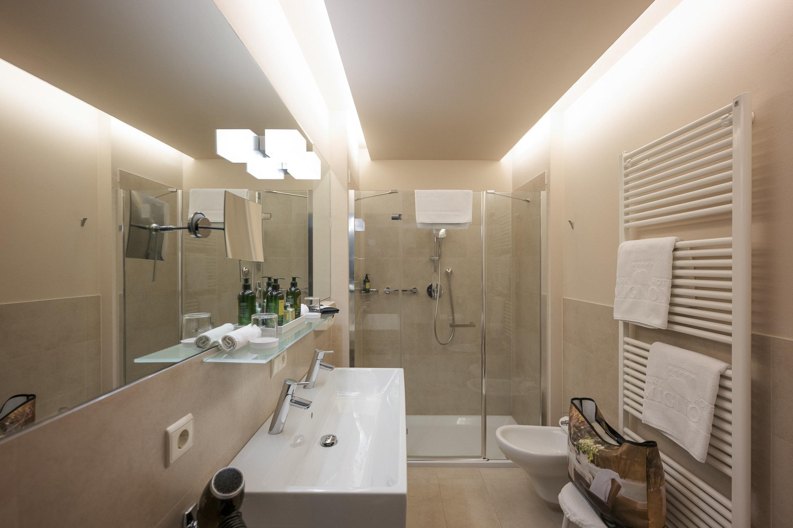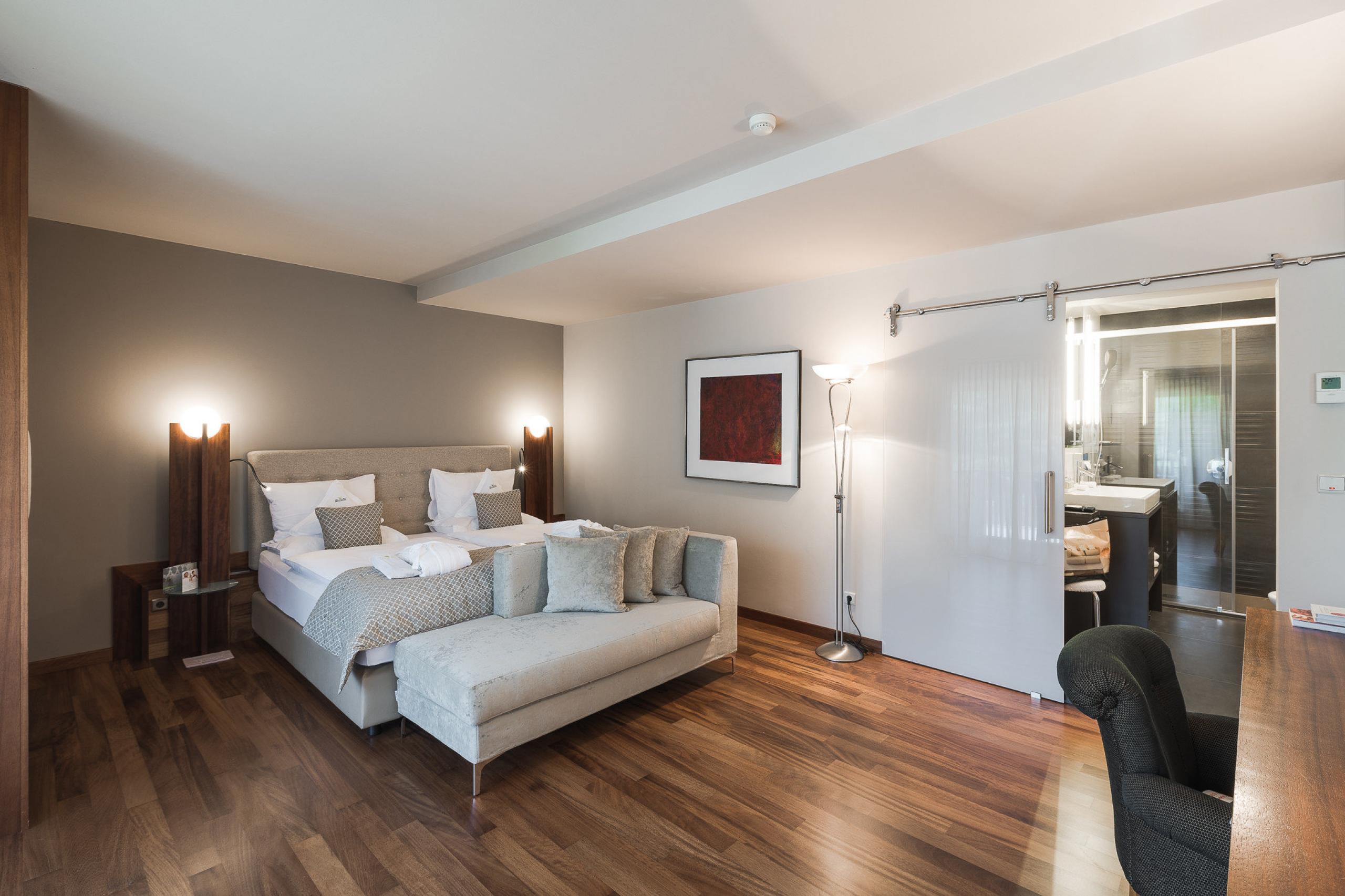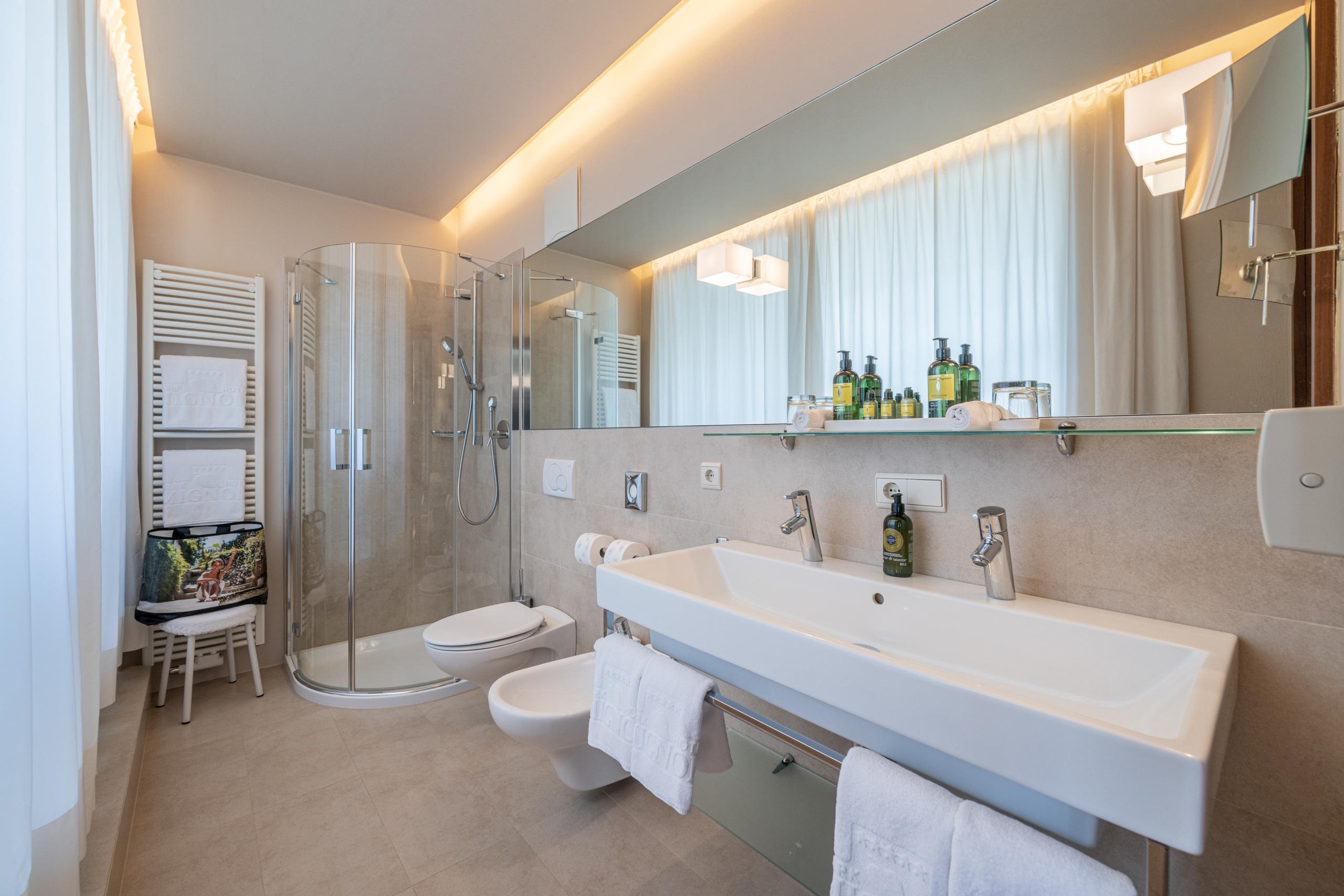 King-size bed with memory foam| big balcony | wooden floors | shower | bidet | hairdryer | makeup mirror | exclusive high-quality L'Occitane care products | living room area | Flat screen TV | WiFi | phone | radio | AC | kettle with selection of teas | minibar | trekking backpack | possibility of an additional bed | South Tyrolean apples as a welcome gift | Fresh flowers from our garden | Loacker treats