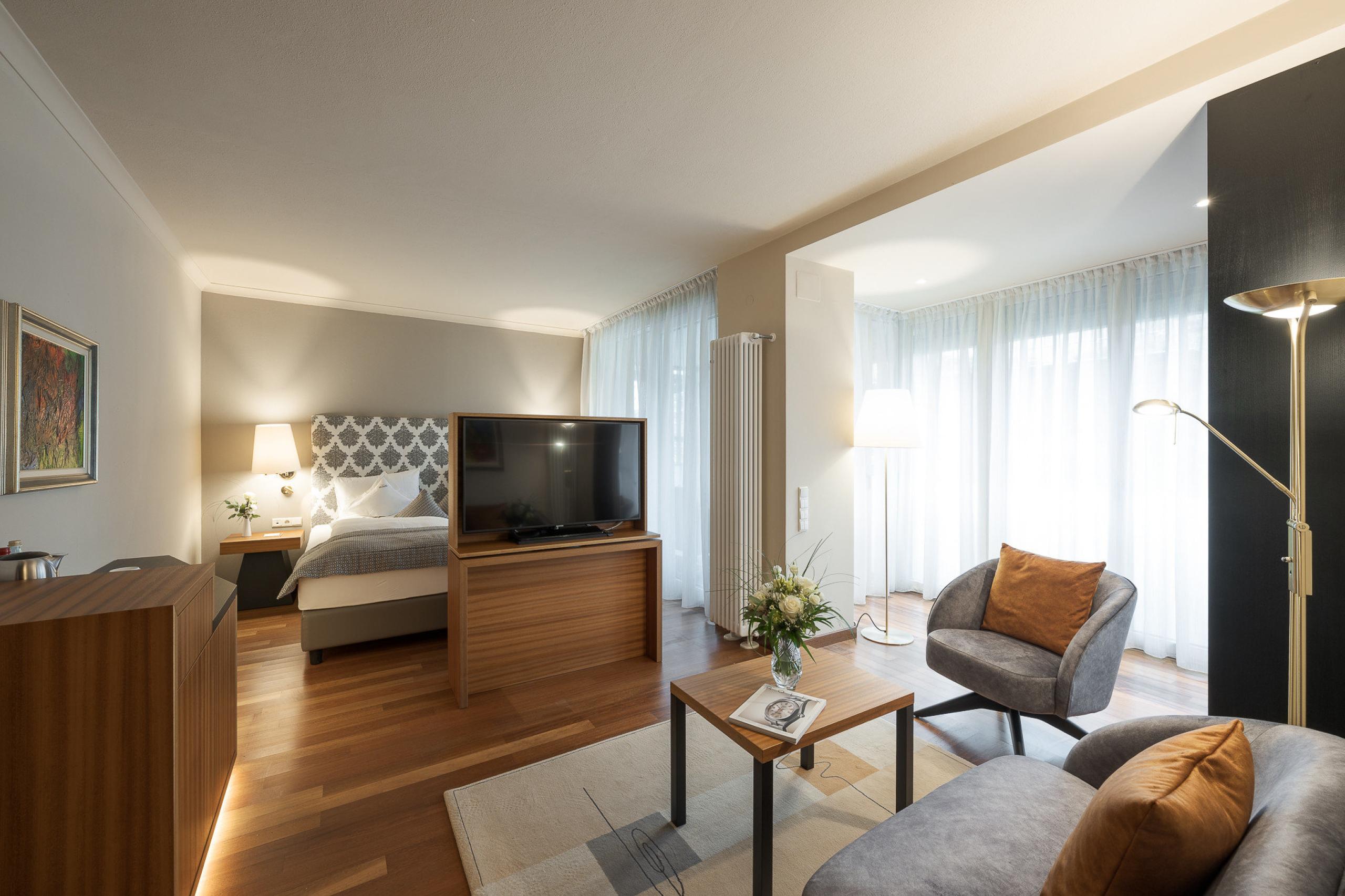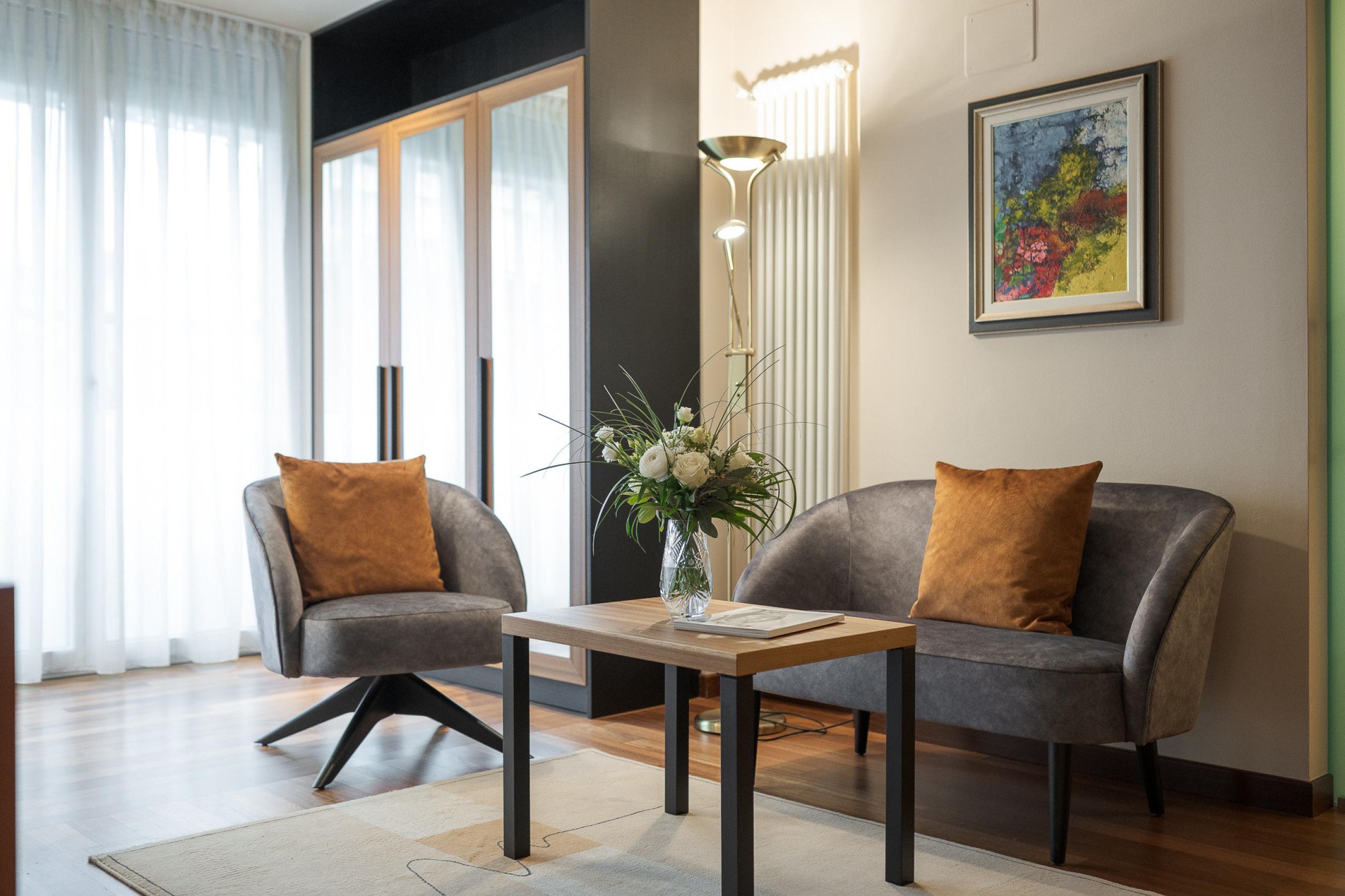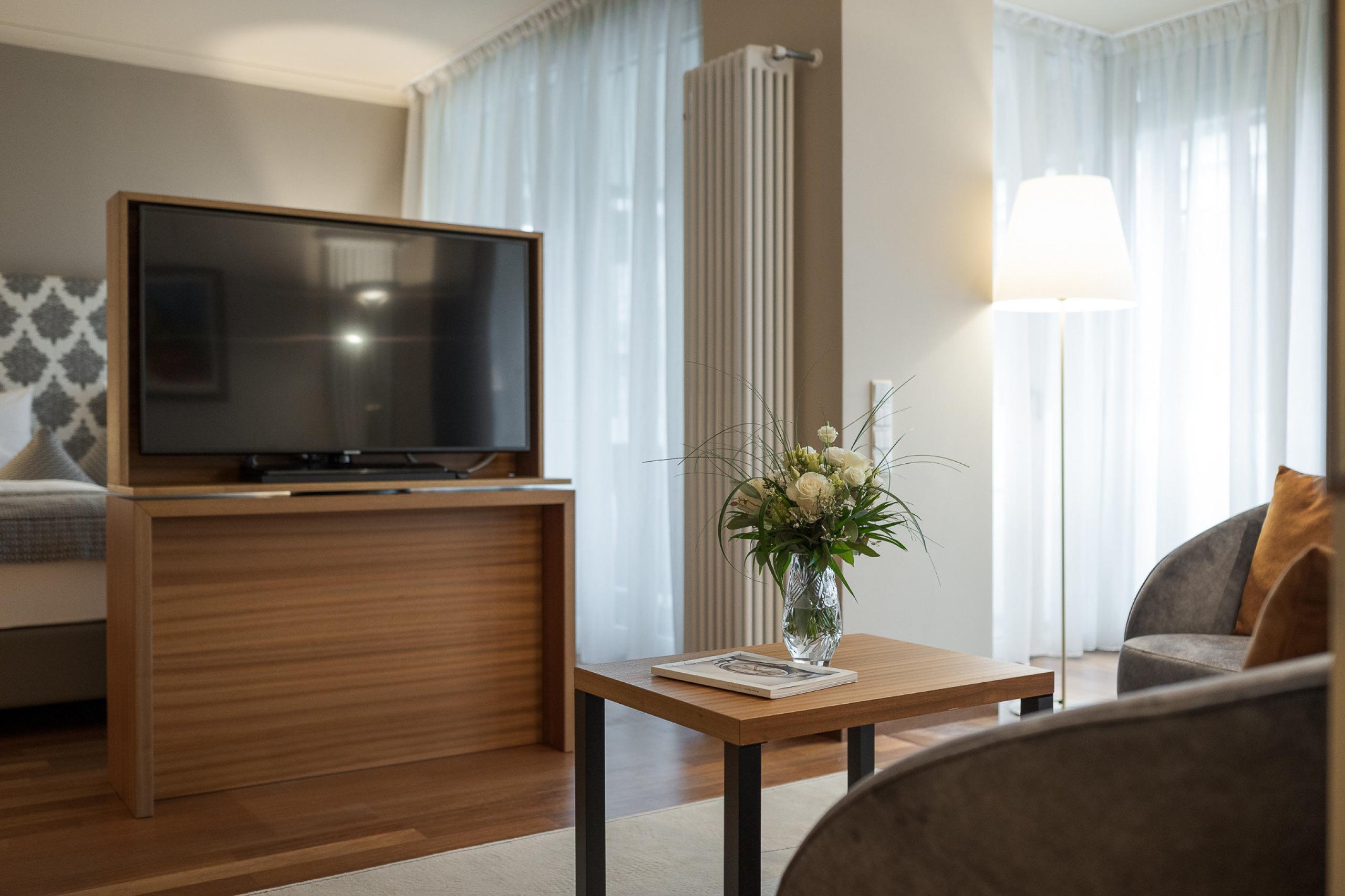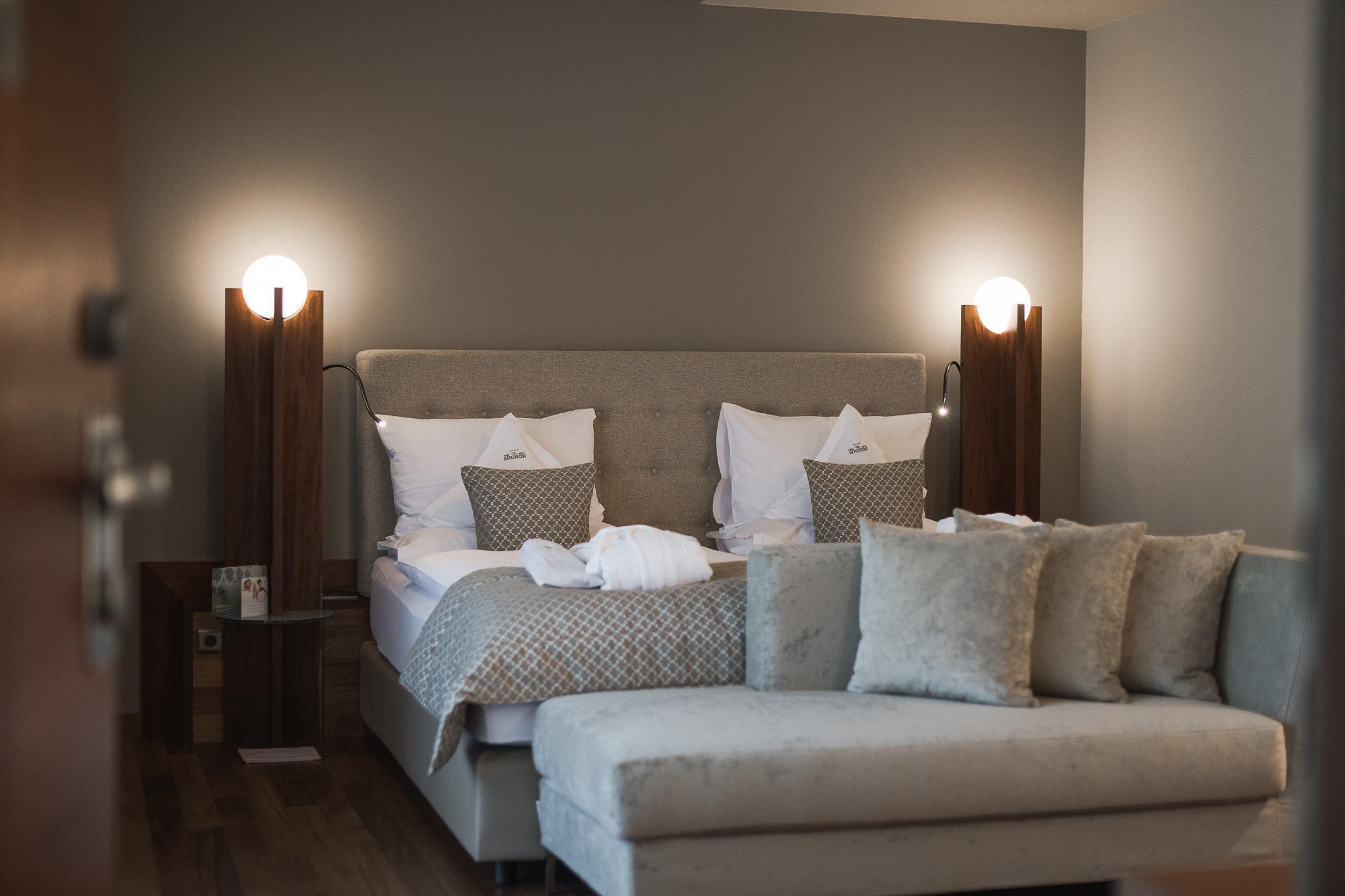 King-size bed with memory foam| big balcony | wooden floors | shower | bidet | hairdryer | makeup mirror | exclusive high-quality L'Occitane care products | living room area | Flat screen TV | WiFi | phone | radio | AC | kettle with selection of teas | minibar | trekking backpack | possibility of an additional bed | South Tyrolean apples as a welcome gift | Fresh flowers from our garden | Loacker treats