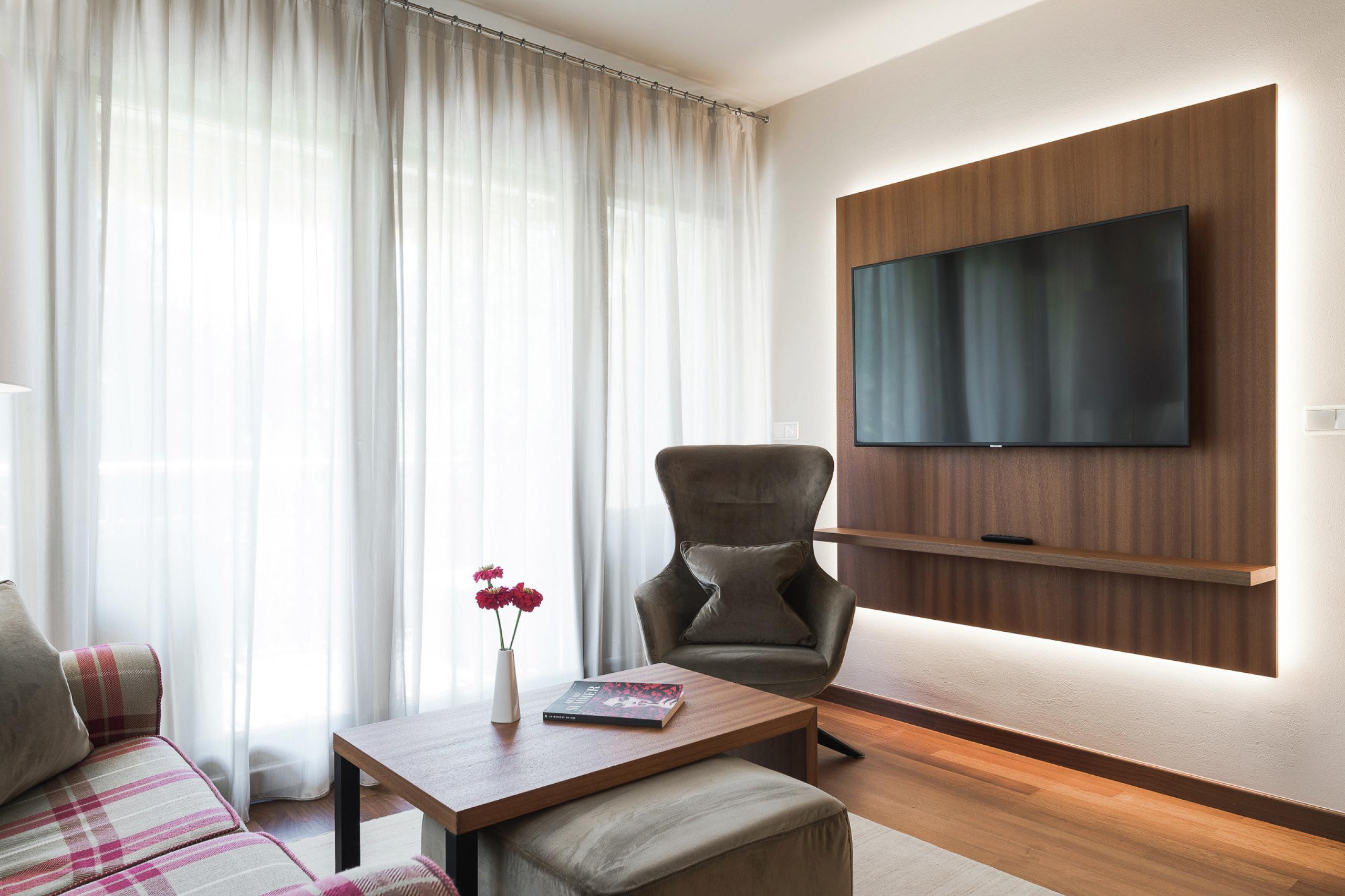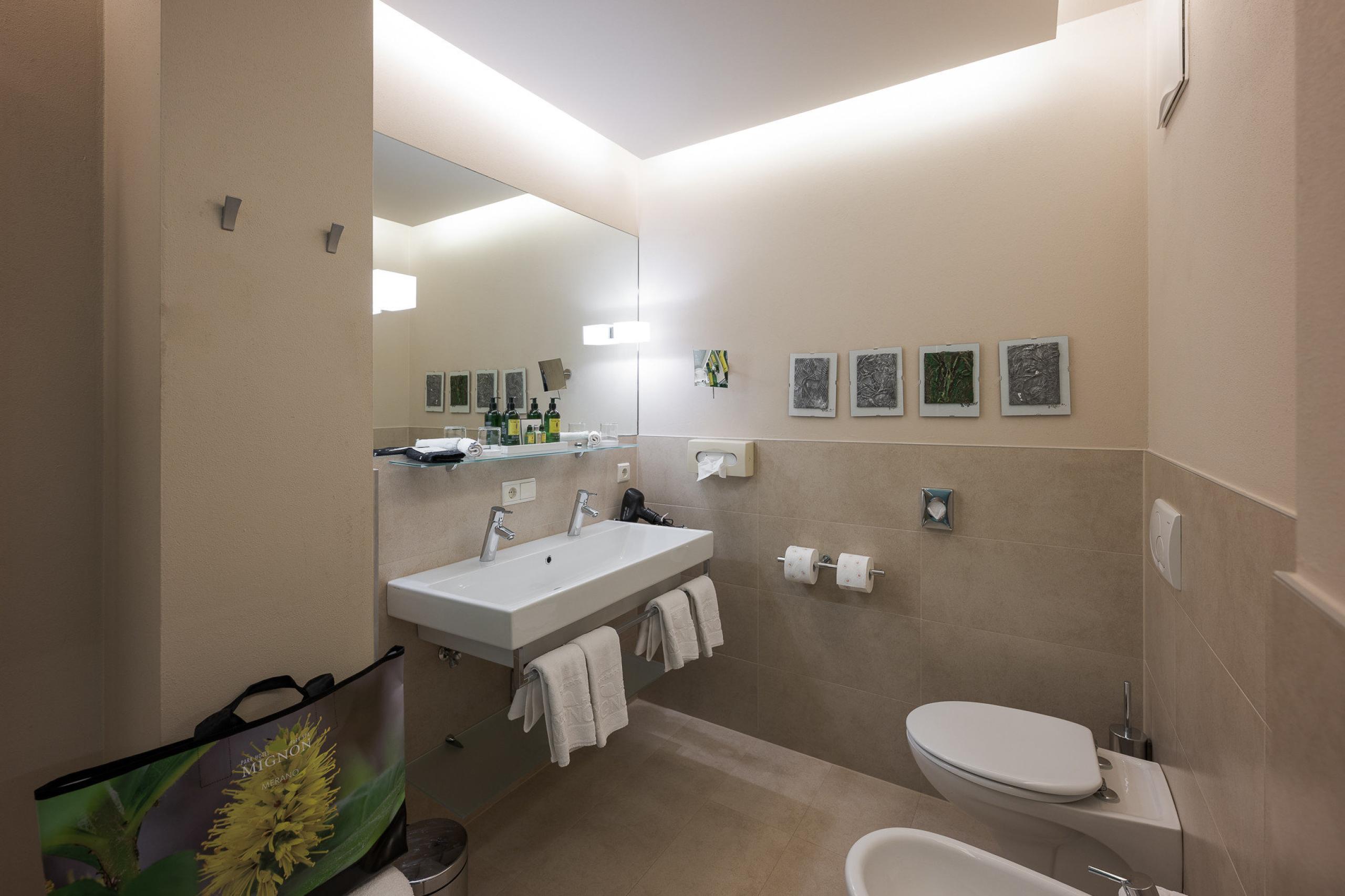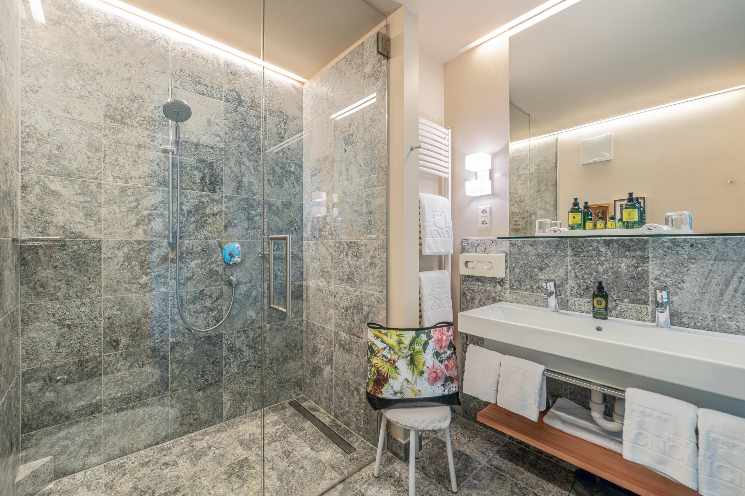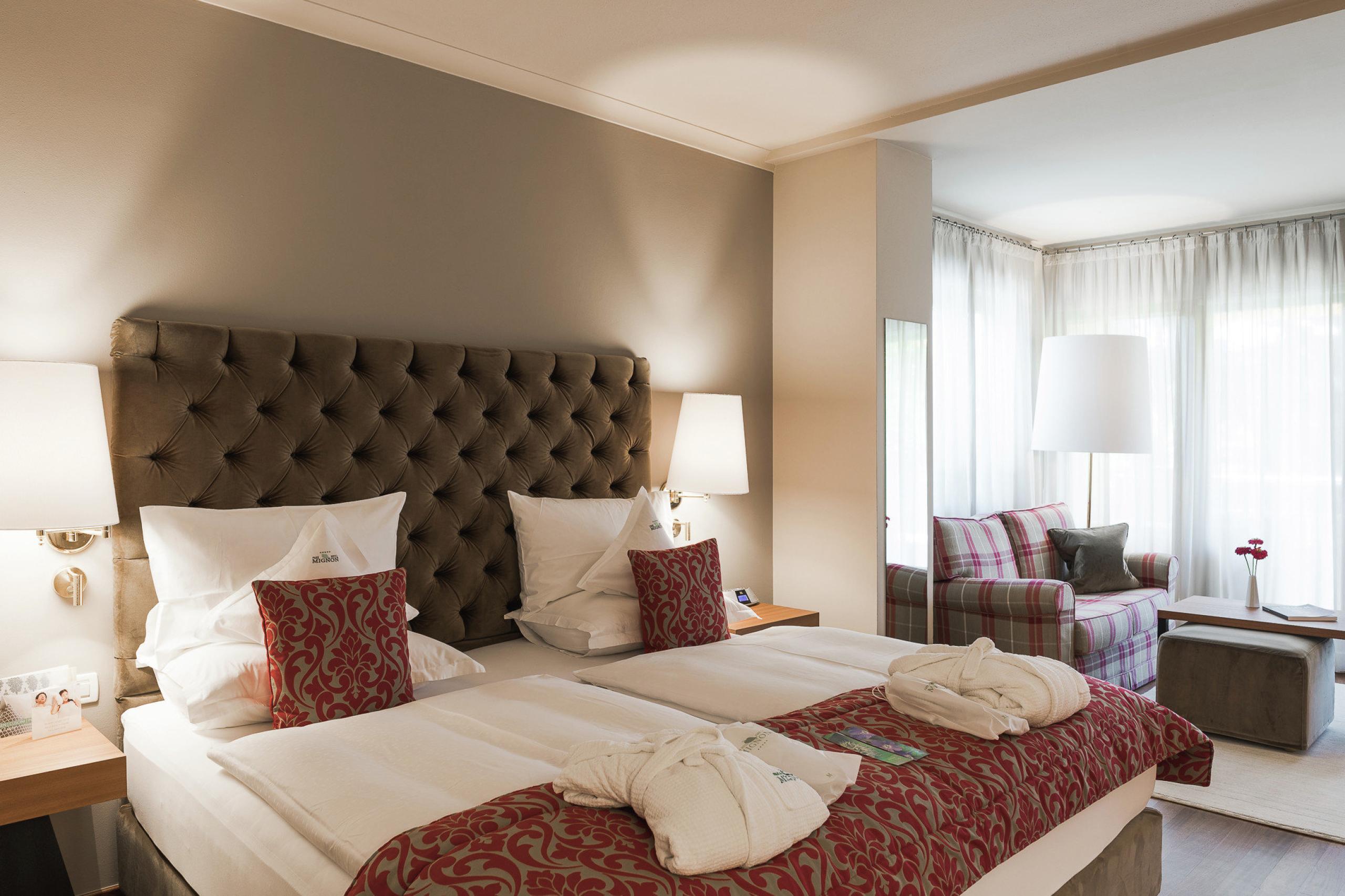 King-size bed | large balcony or terrace with park view | wooden floor | double sink | shower | some of them have bathtub | bidet | hairdryer | makeup mirror| high-quality care products from the L'Occitane brand bidet | living area | flat TV | WiFi | phone | radio | AC| kettle with tea selection | minibar | hiking backpack | South Tyrolean apples | fresh floral greeting from our garden | Loacker treats