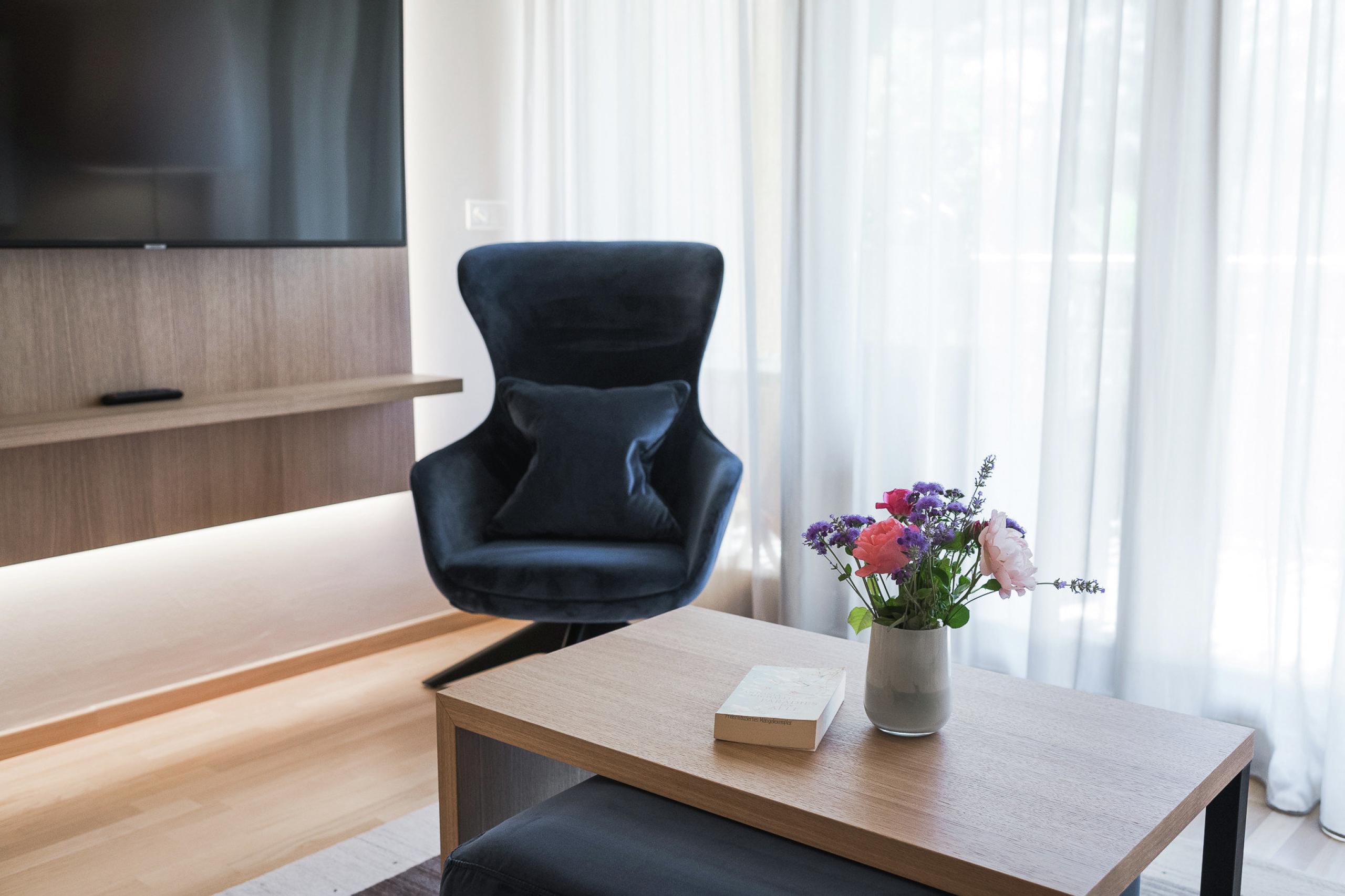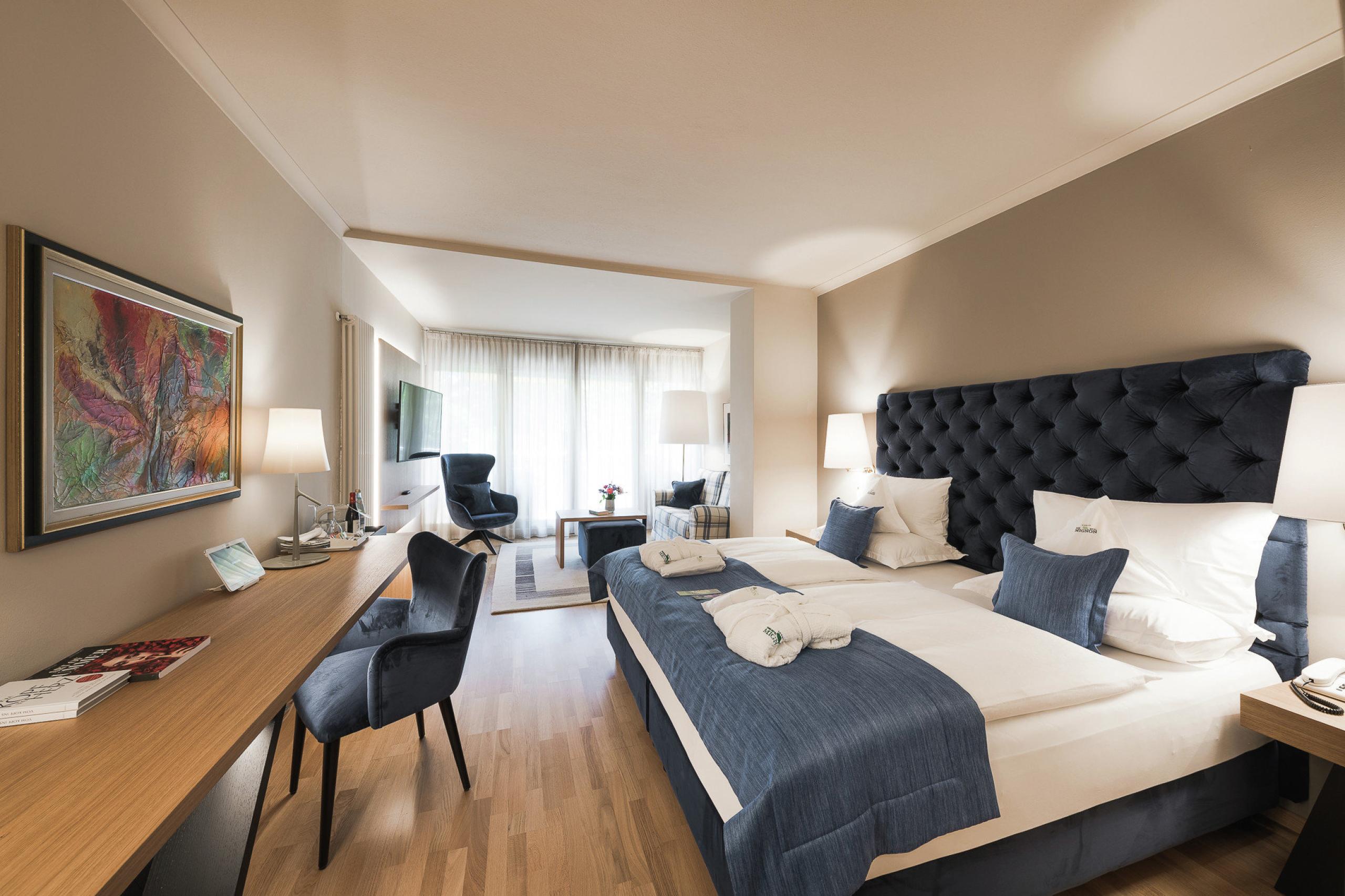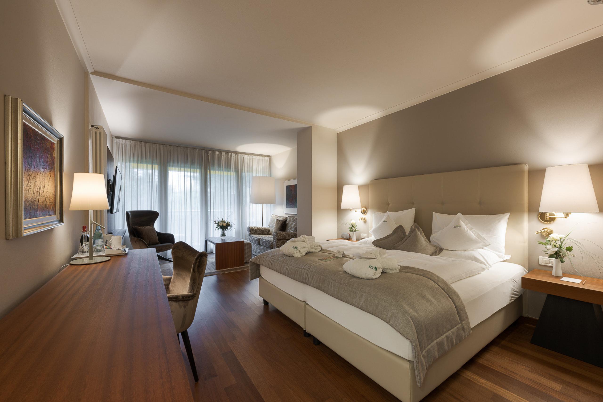 A little more is all that you need. More space, more sun, more peace and more tranquility. Sunny junior suite with lounge-bed, cozy living area and a view of the park, splendid balcony and large bathroom with double sink.