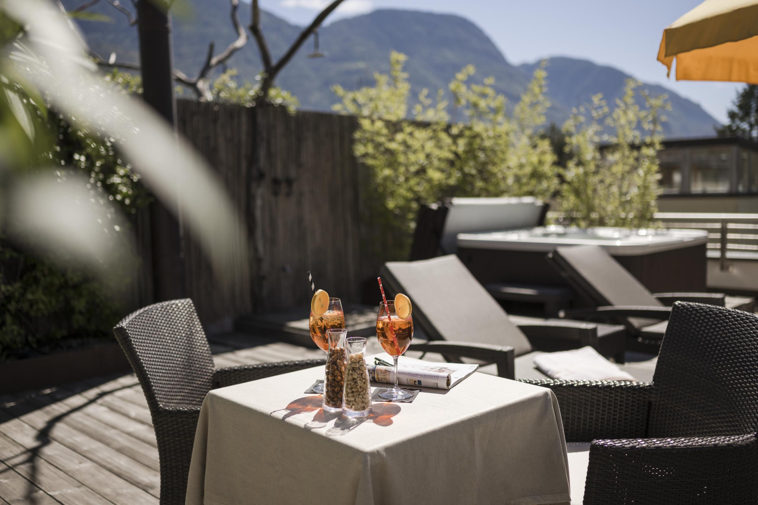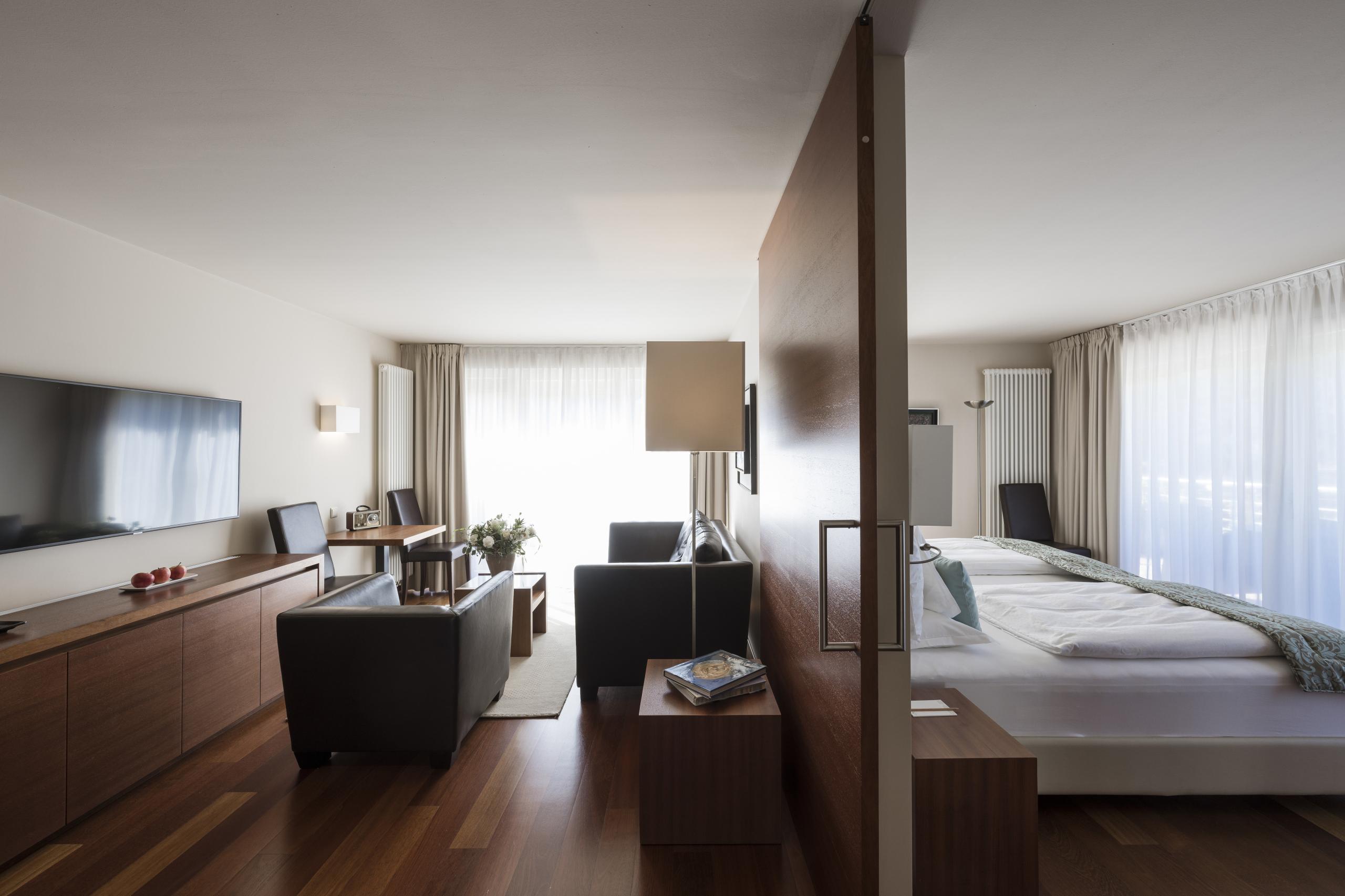 Large exclusive luxury suite, bedroom with king-size bed in fine leather and memory foam mattress | private roof terrace with whirlpool | 360° Merano mountains view| wooden floors | large bathroom with natural light | steam sauna | whirlpool | bidet | hairdryer | makeup mirror | exclusive high-quality L'Occitane care products | living room with leather sofa and fireplace | two flat screen TVs | WiFi | phone | radio | AC | in-room safe | kettle with selection of teas | minibar | Nespresso machine | trekking backpack | South Tyrolean apples as a welcome gift | fresh flowers from our garden | Loacker treats | praline bombons