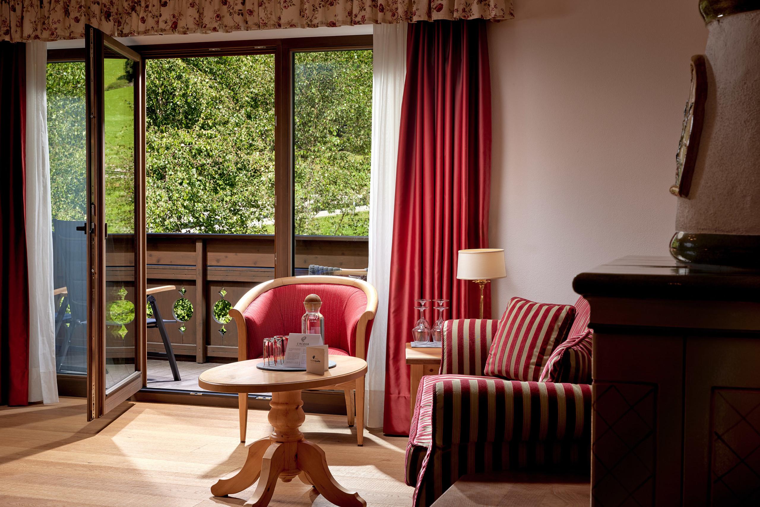 Made for dreaming. Room in typical Tyrolean style, furnished in local pine wood, wooden floor, cozy sitting area, tiled stove, stately bathroom and north balcony with village view.