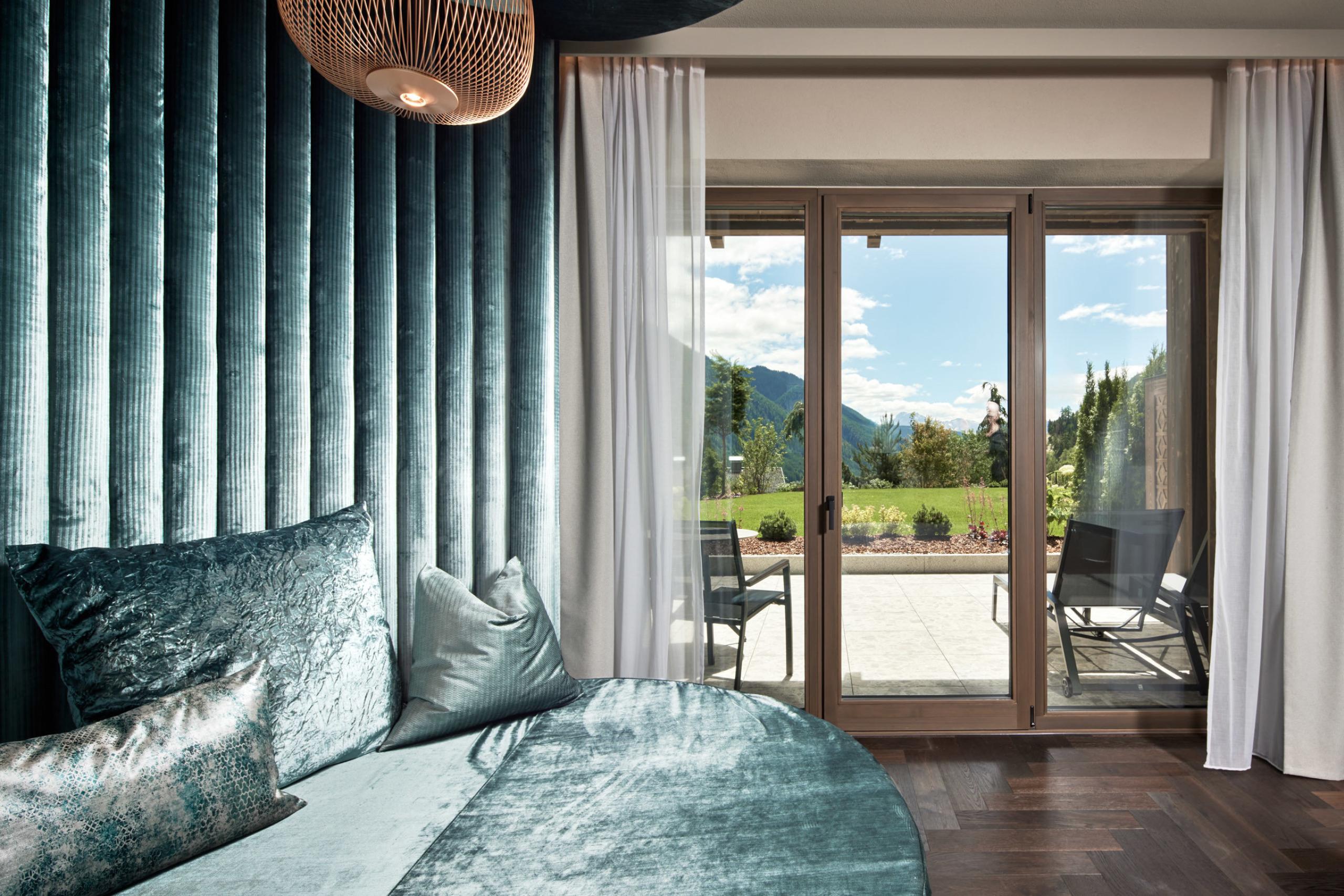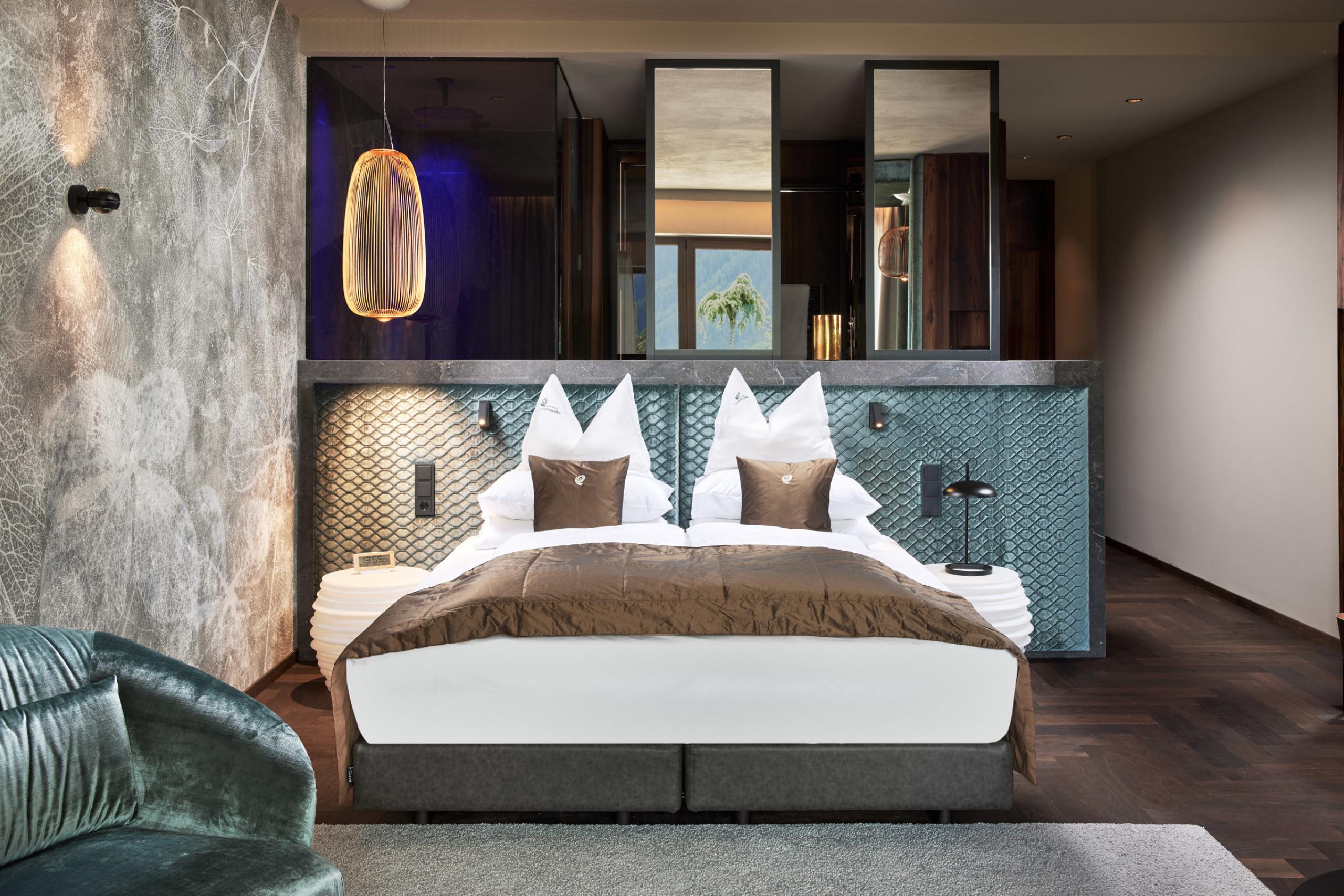 New superior junior suite - alpine and stylish, furnished with lots of oak wood, luxury box-spring beds, cozy day-bed snug corner, walk-in closet, lady beauty desk, large bathroom with infrared loungers, double washbasin and large rain shower, separate WC with bidet, particularly quiet location with balcony & idyllic mountain-forest view.