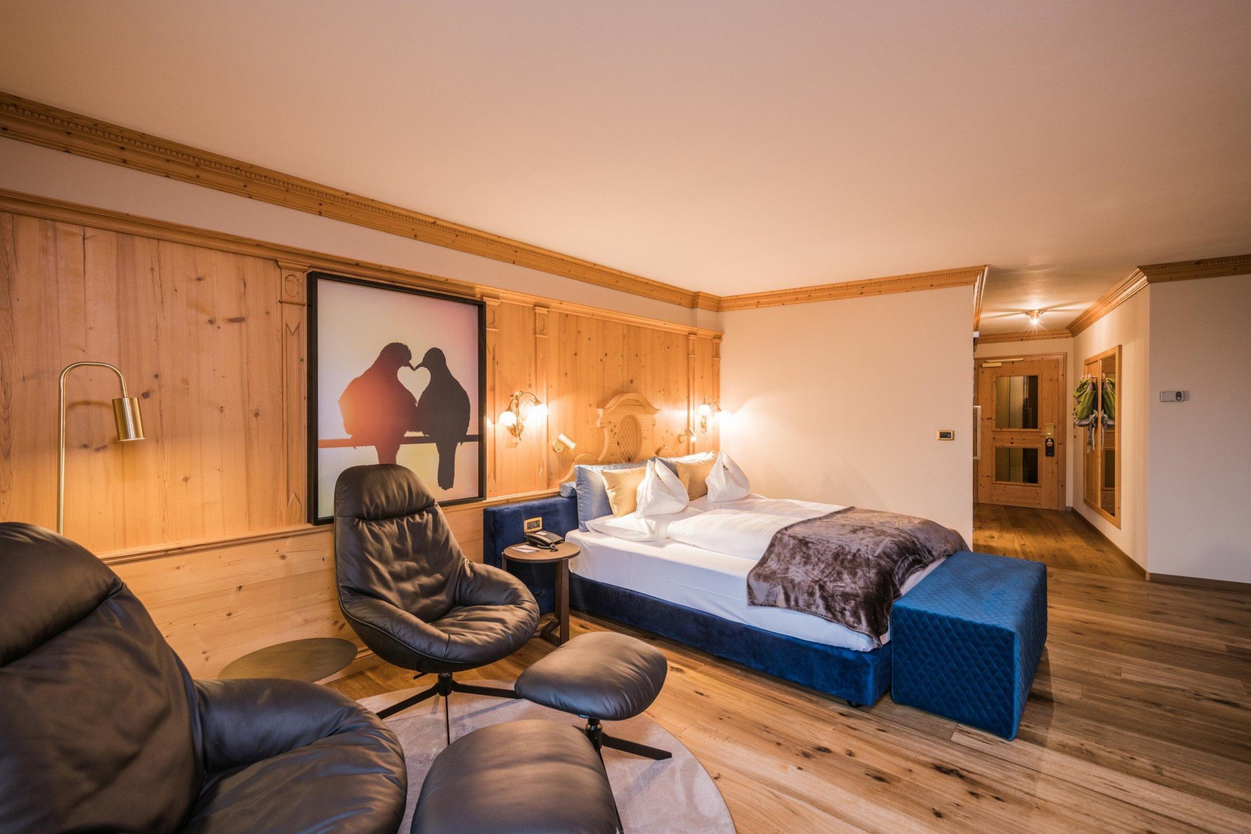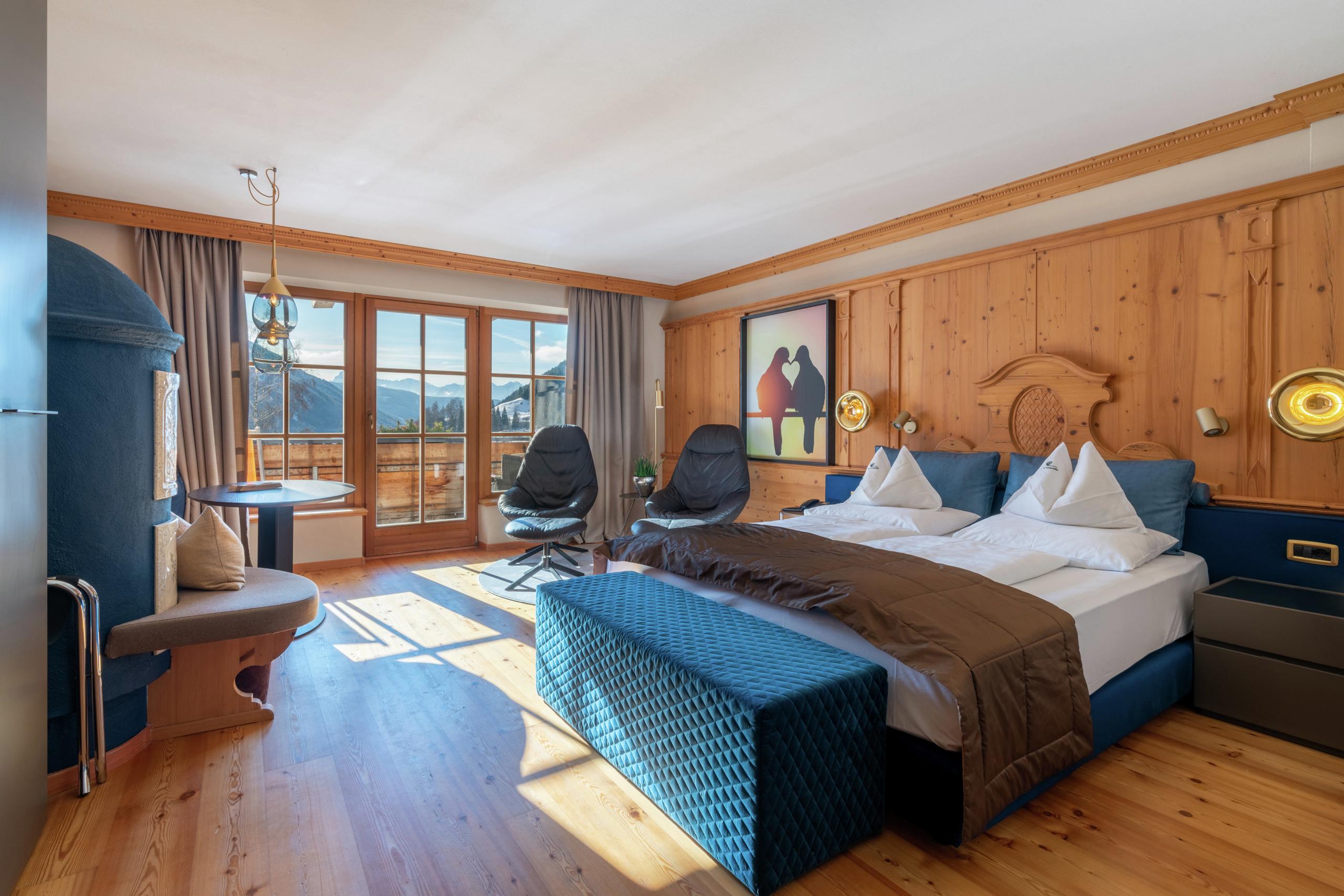 Spacious and light-flooded double room in modern-alpine style, with cozy living area with tiled stove and armchairs, wooden floor, espresso machine & tea set, noble bathroom with bathtub and large south-facing balcony with mountain views.