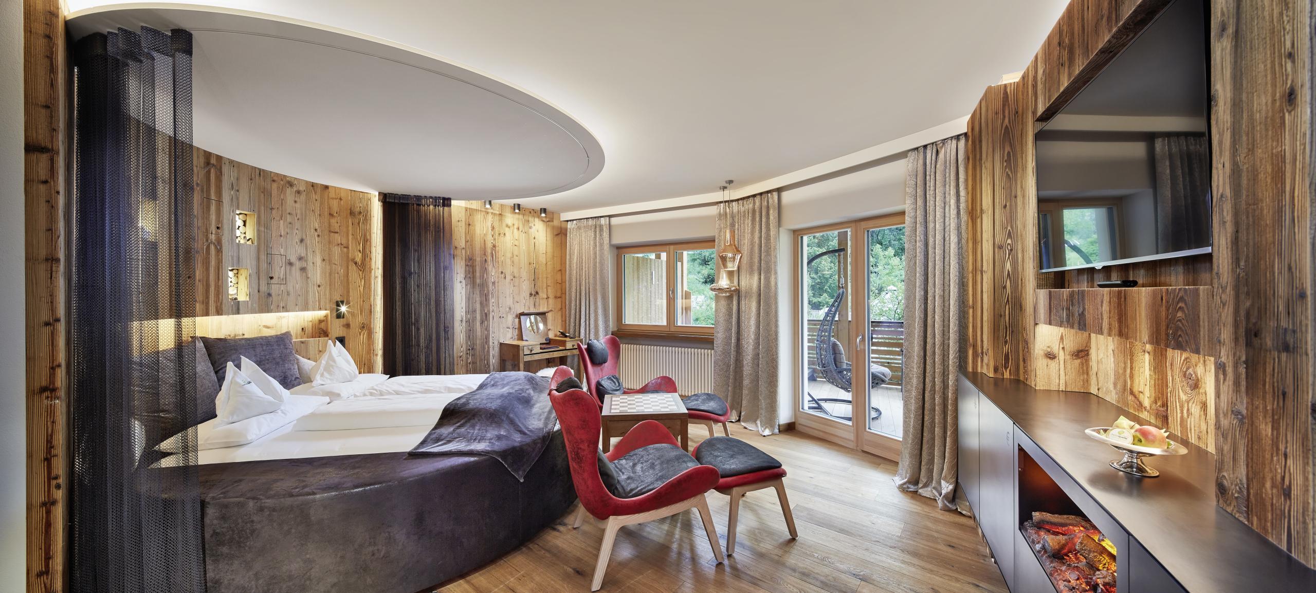Romantic suite to relax and feel comfortable built in alpine-style, romantic furnishings like show-fireplace, exquisite bathroom with lighting effects, separate toilet / bidet, Large Led screen TV, WI-FI, and a balcony full of fresh mountain air with spectacular views to the local mountains.
