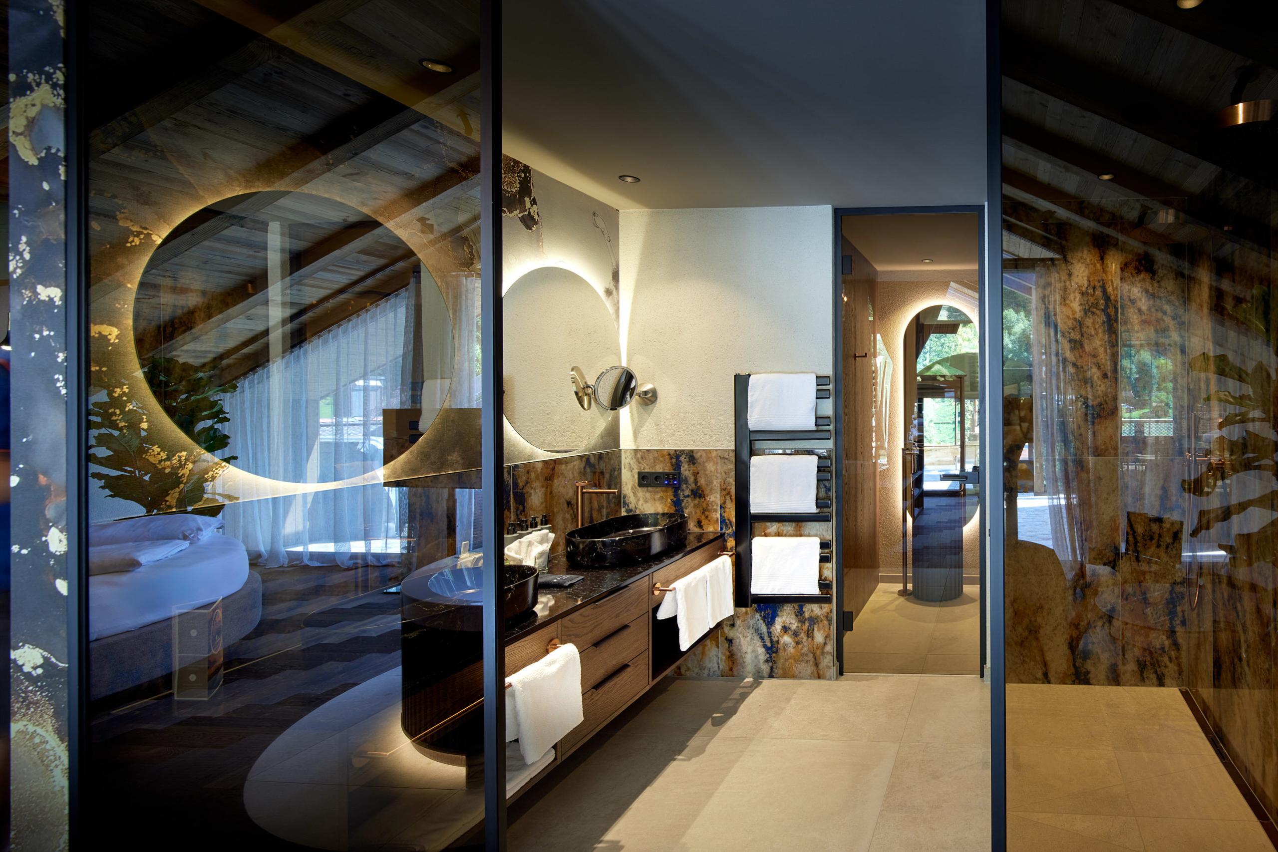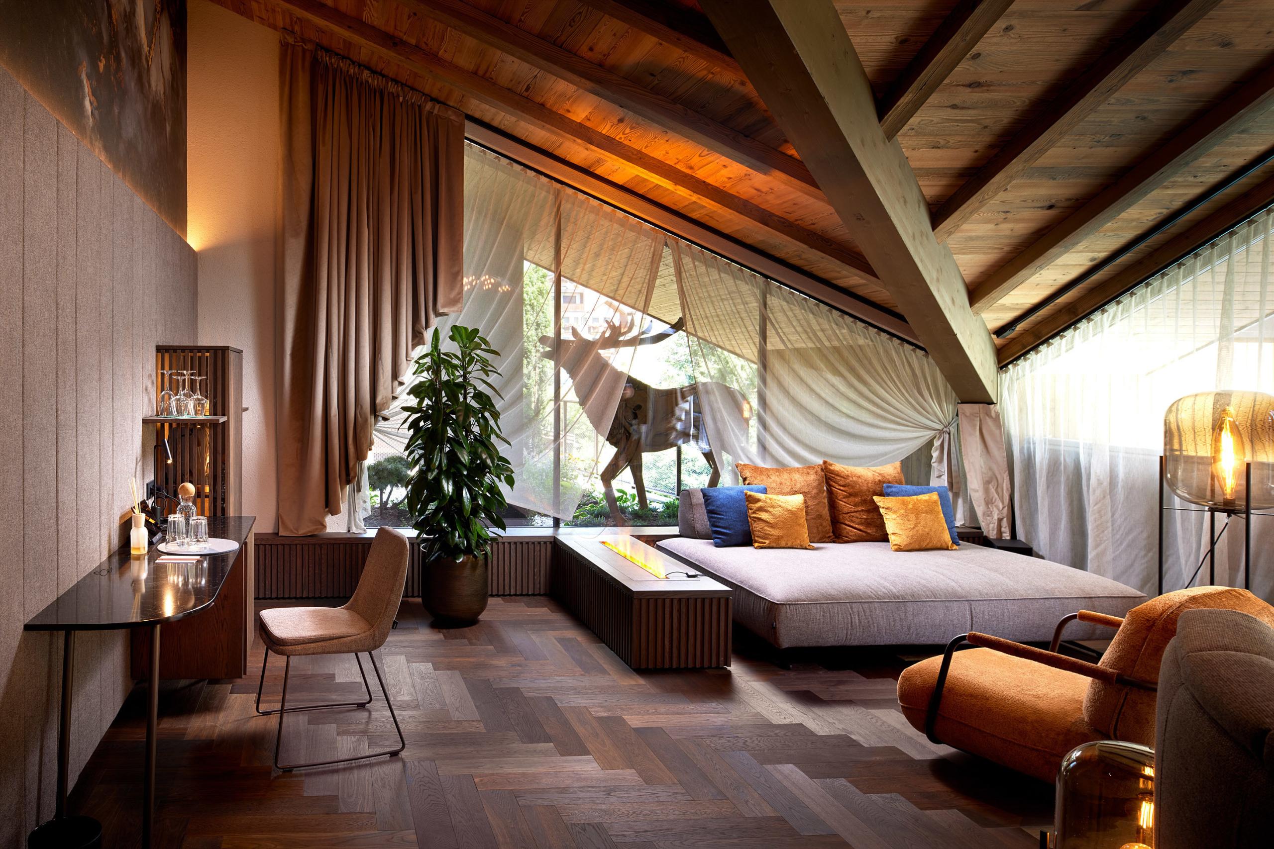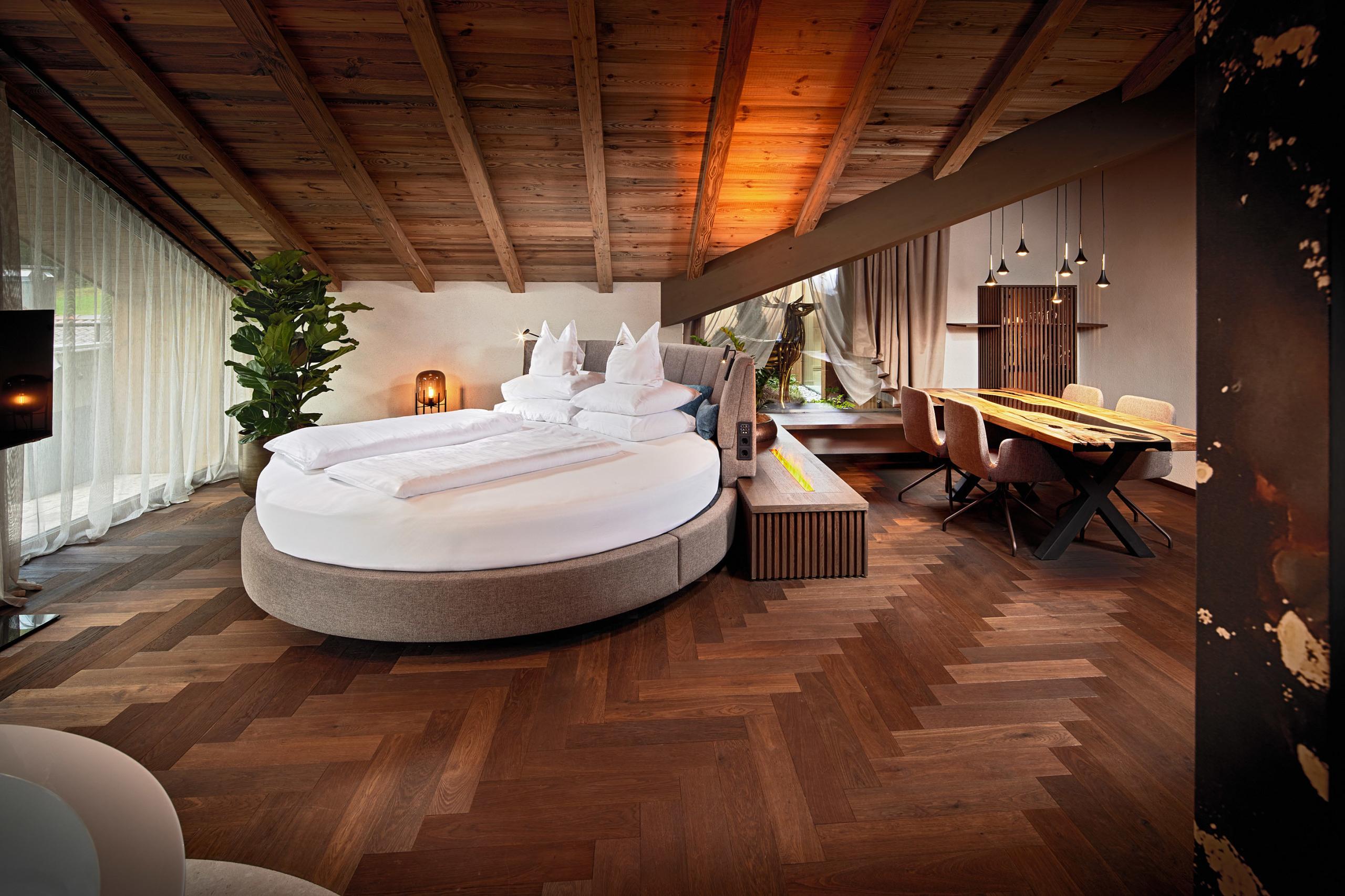 Exclusive open-space wellness suite on the 4th floor for a relaxing time-out, furnished with the finest materials, large outdoor spa with whirlpool on the private roof terrace of ca. 40 m² under the starry sky, Finnish sauna with panoramic view, large cuddly bed, luxury bathroom with double rain shower, living area with fine oak wood, romantic fireplace and generously stocked small bar.