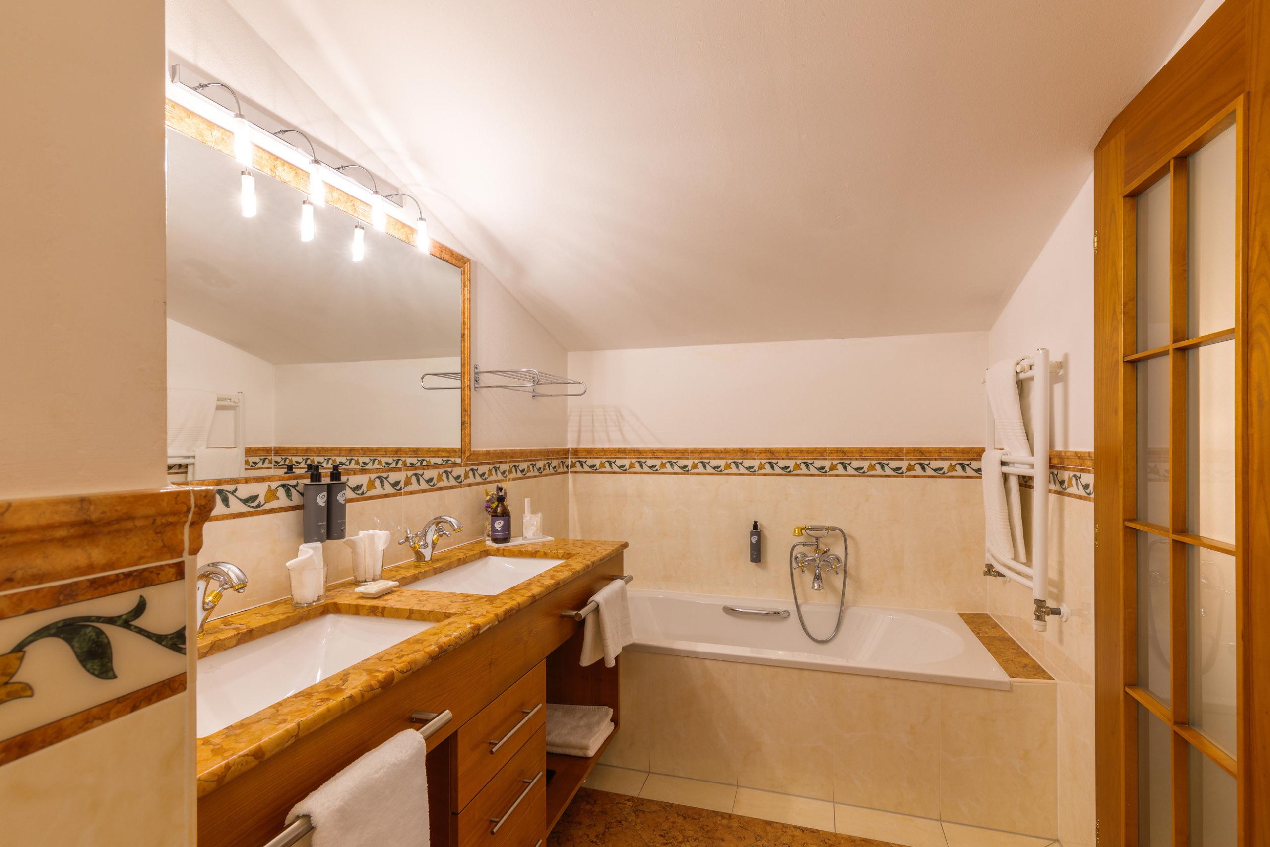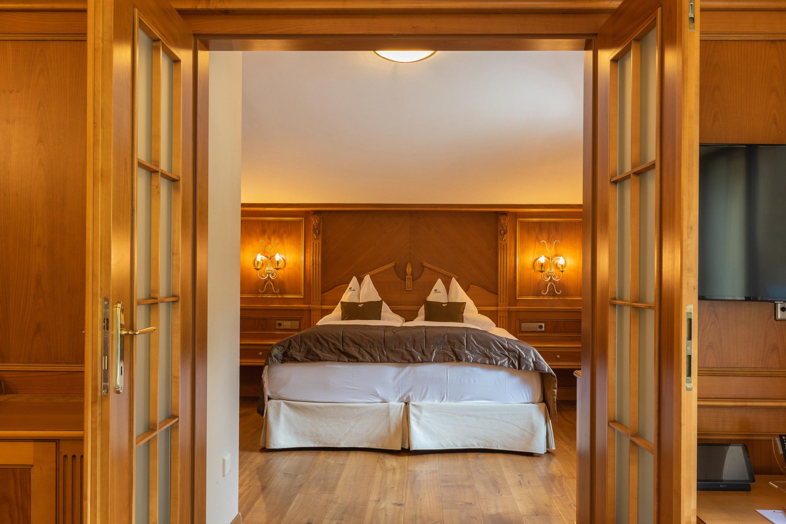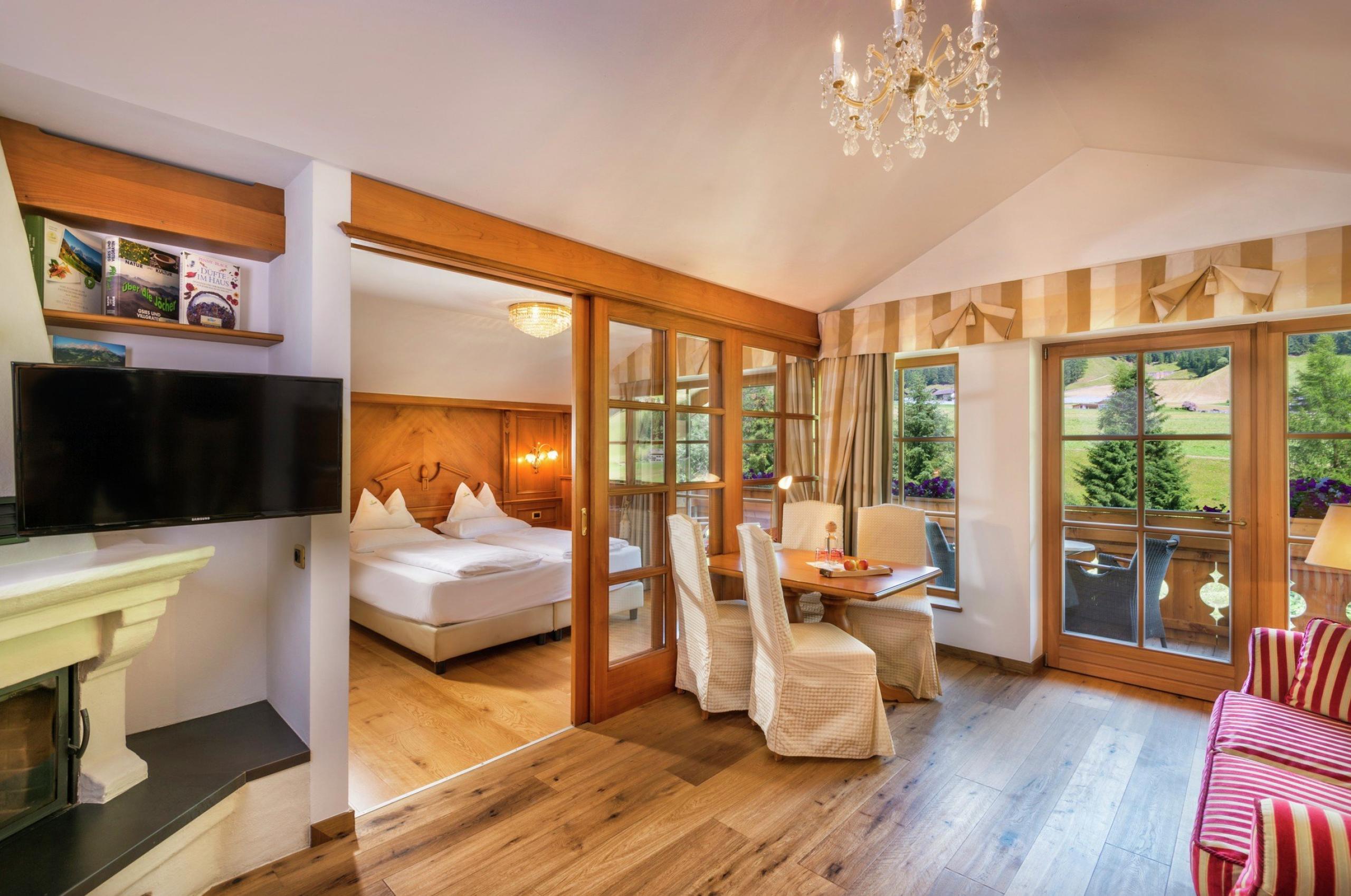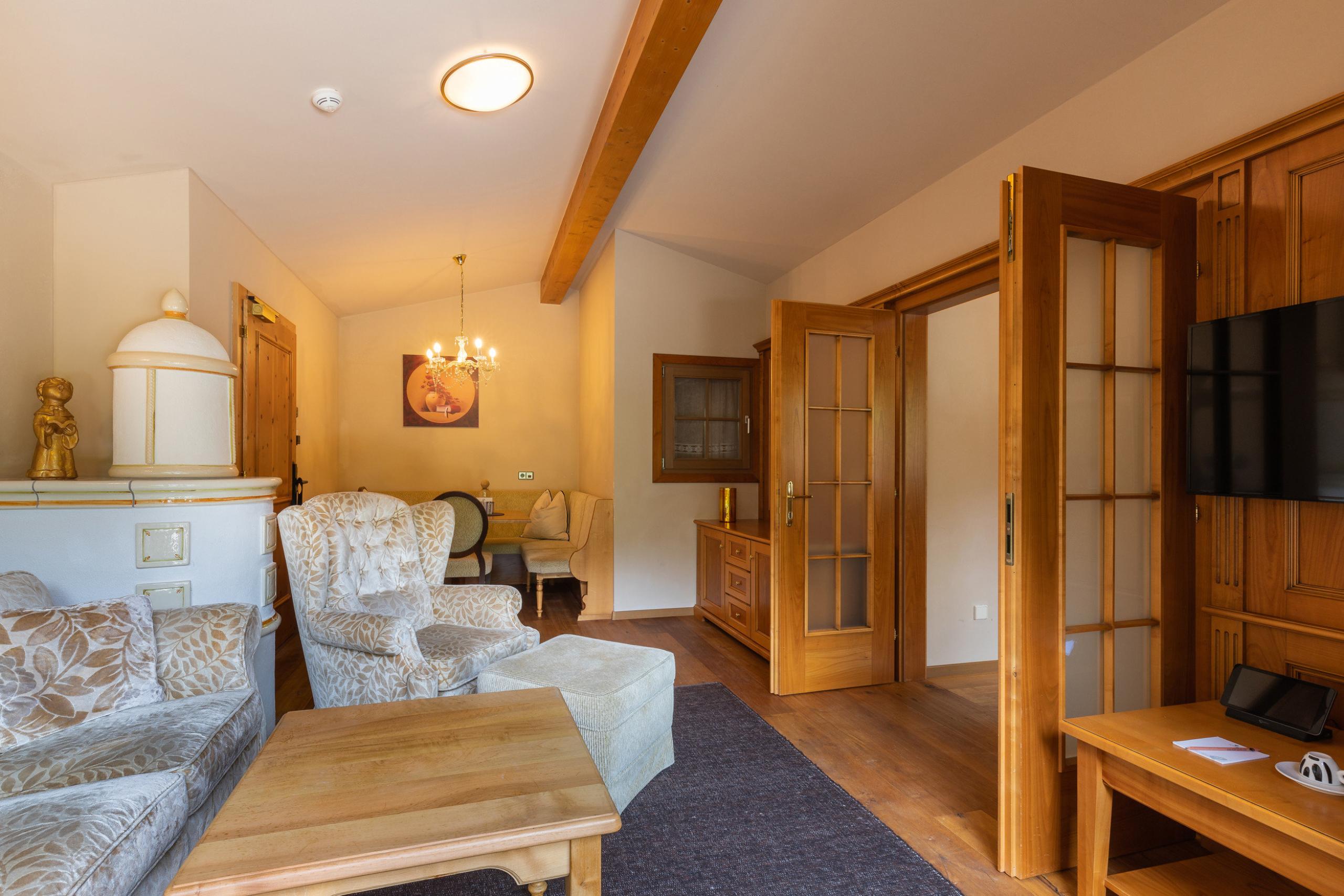 Elegantly furnished in fine cherry wood, bedroom with separatet living room with wooden floor, espresso machine and tea set, large walk-in closet, wonderful bathroom with bathtub and shower, separate toilet/bidet, sunny balcony/terrace with beautiful view of the valley mountain landscape and wellness garden.