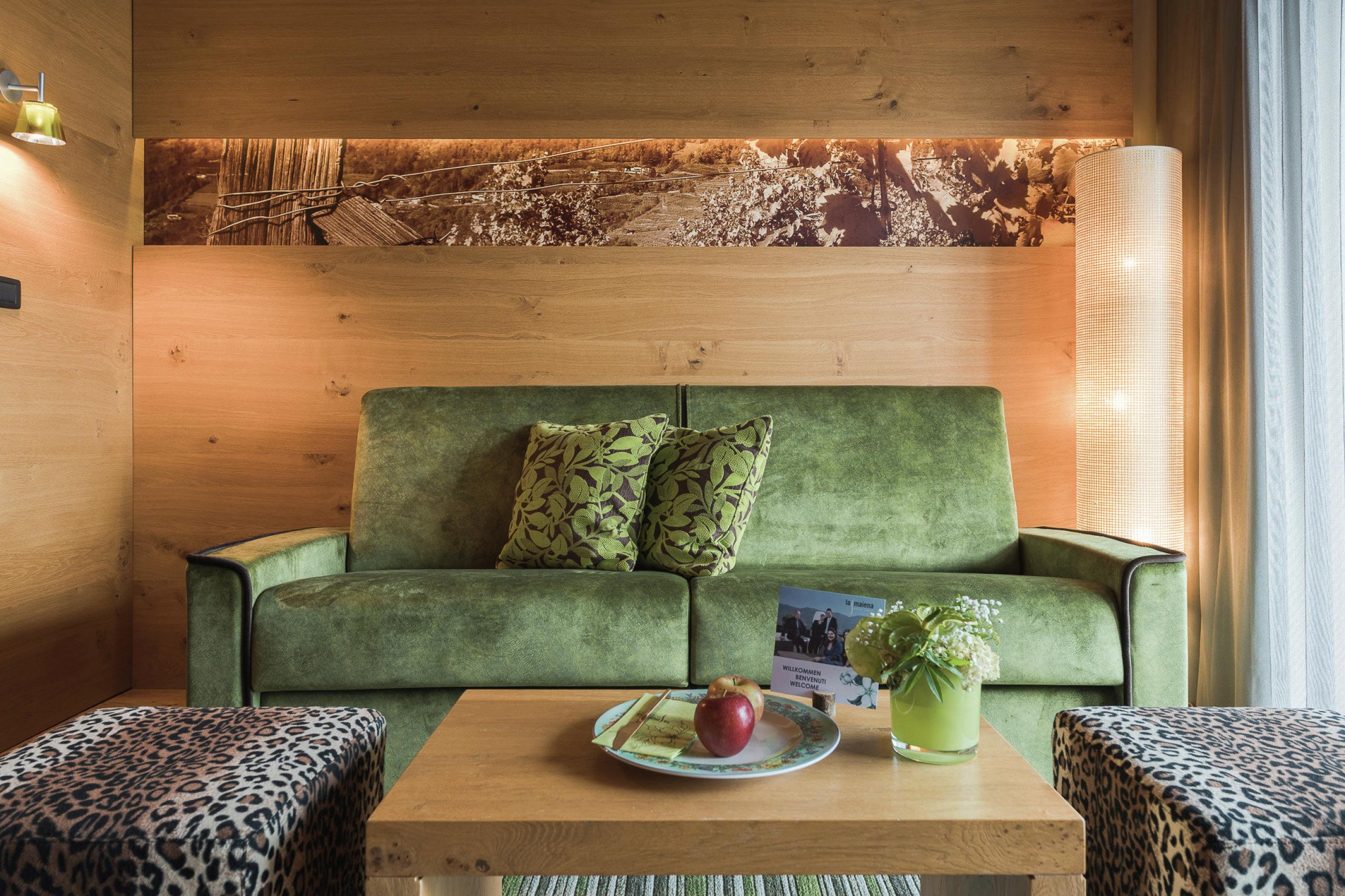 Exclusive feel-good designer suite with idyllic views of Merano and environs. Guests can enjoy the visually separate bedroom space and living area, the partially open bathroom with shower and separate toilet and bidet. The living area features a plush convertible sofa bed, making this suite perfect for small families with up to two children. With morning sun thrown in!