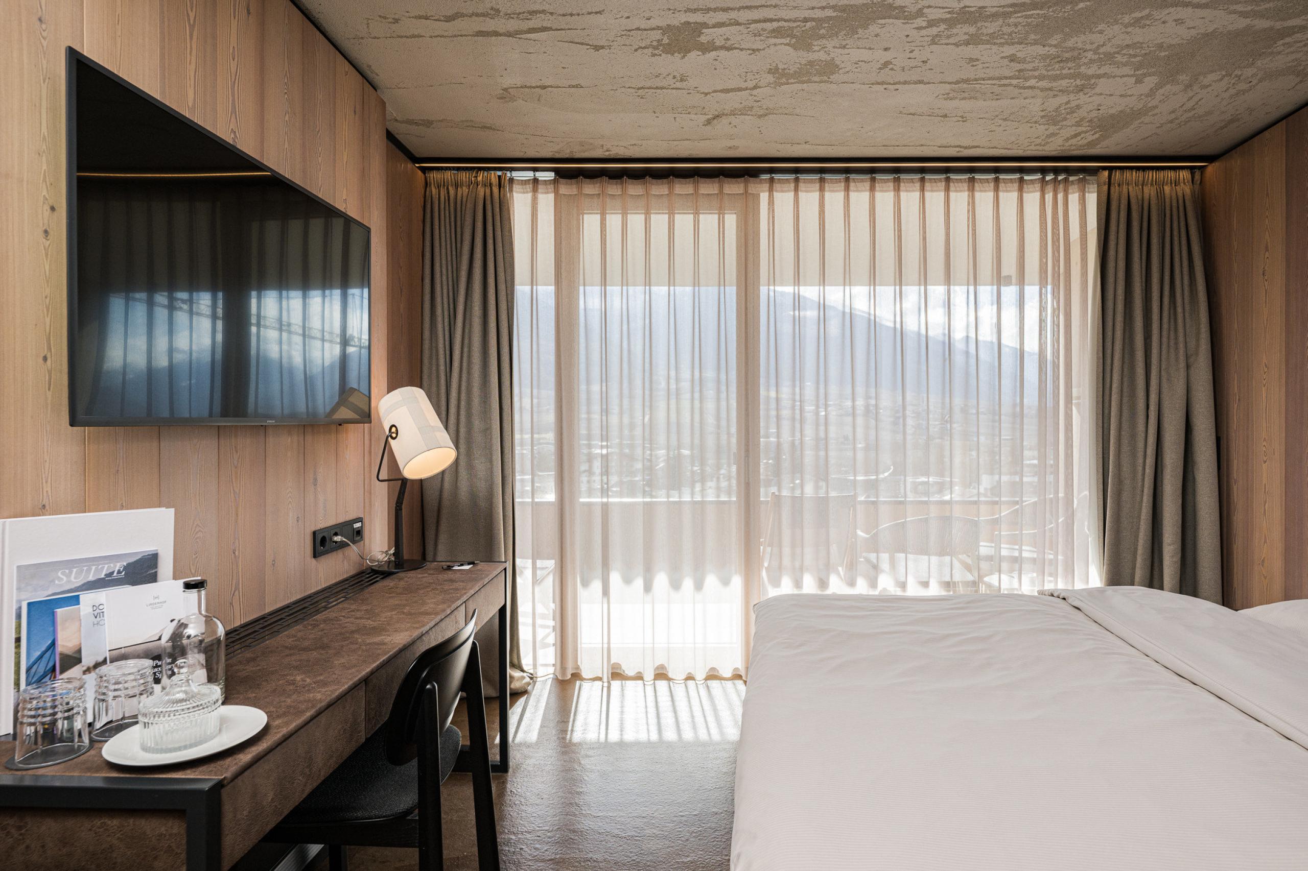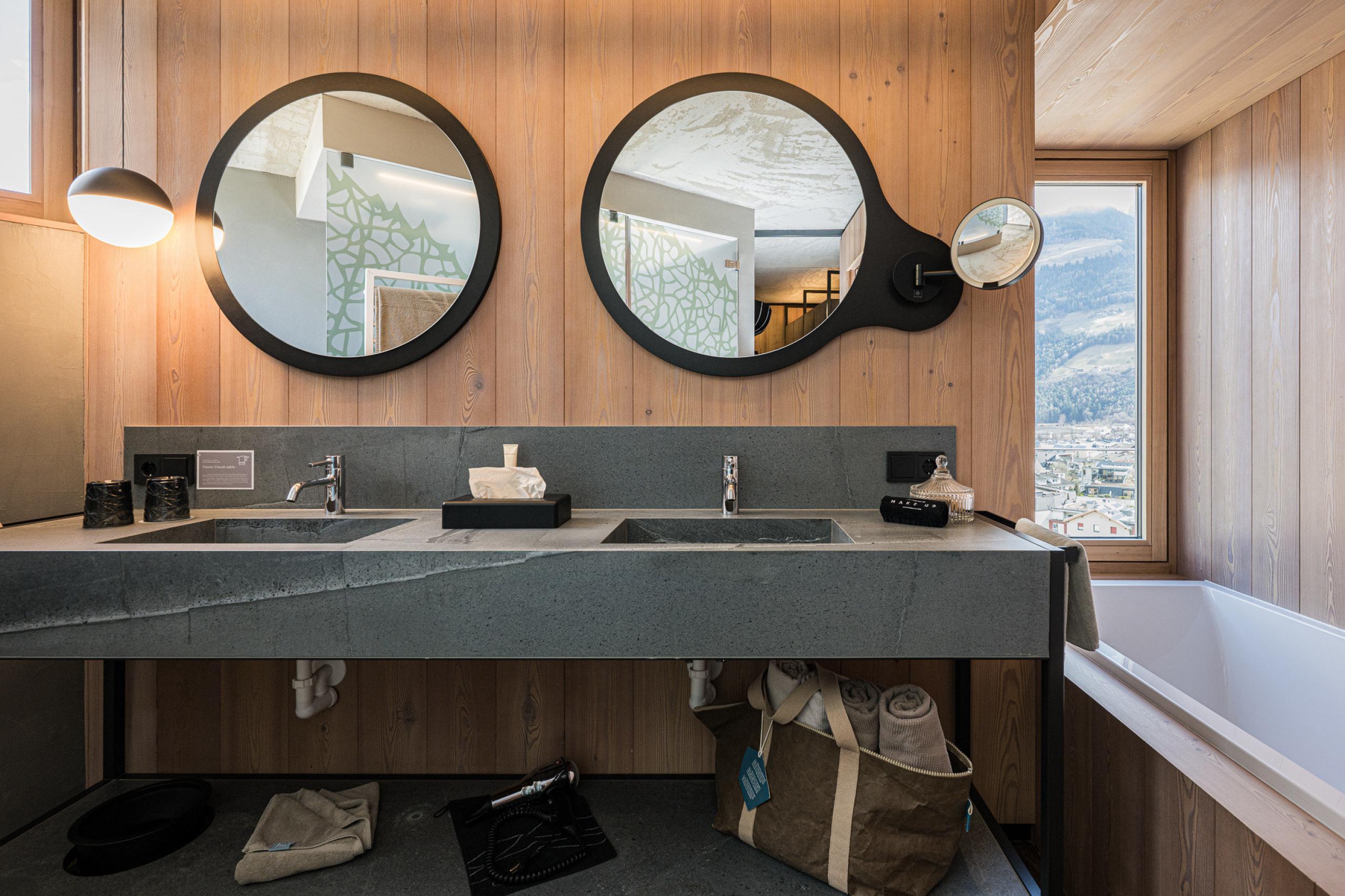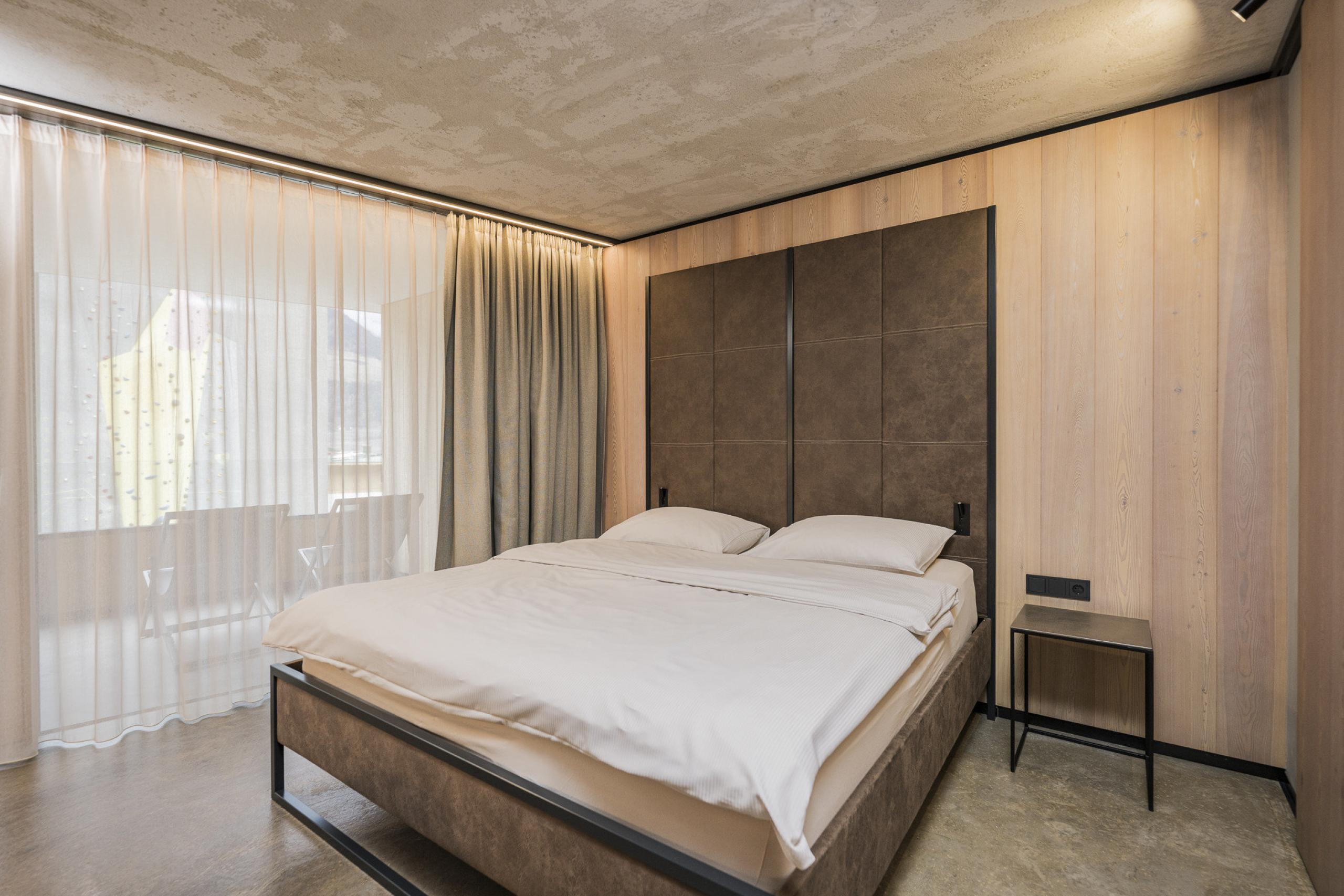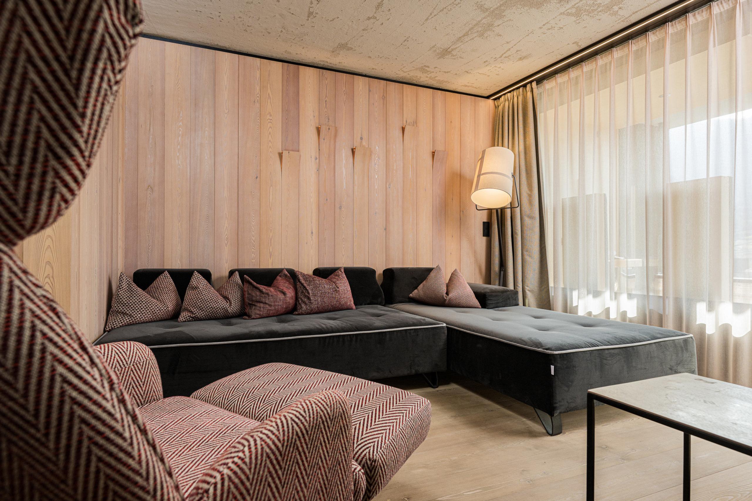 Cosy, modern suite, separate living room and bedroom, furnishings made of natural materials, natural cement flooring in earth tones, brushed solid local larch wood, rough plaster on the ceiling for pleasant room acoustics, wardrobe and bed made of leather, sofa bed (French size), leather desk with USB port, floor lamp with designer lounge armchairs, bathroom with double sink made of grey South Tyrolean porphyry, shower, bathtub with views of the surrounding countryside, toilet and bidet, bathroom radio playing relaxing wellness music, flat-screen TV, free Wi-Fi, minibar, safe, garage - pets not allowed