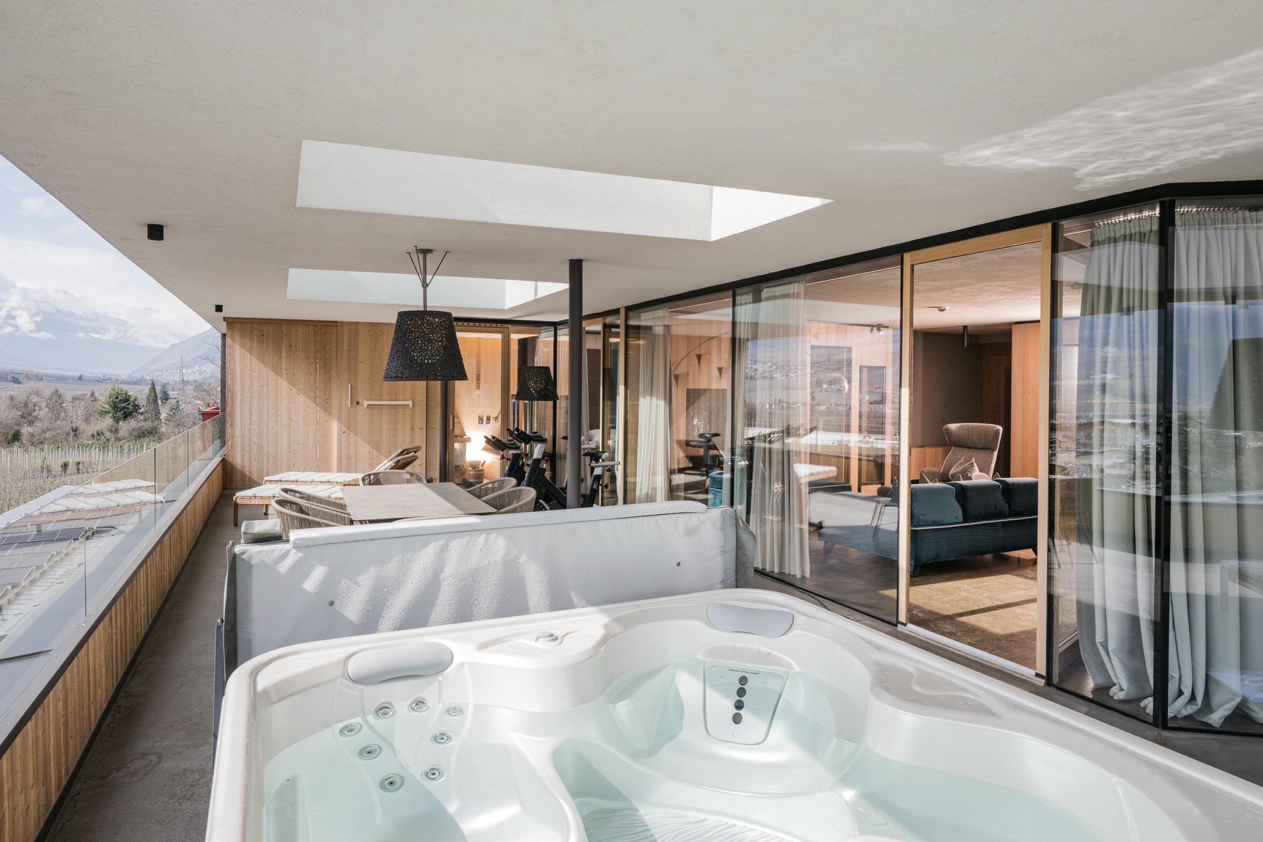 green terrace: with 4 sun loungers, side table and dining table, ambient lighting, couch and armchairs, with a spa area including an infrared sauna, combi sauna, whirlpool and spinning bicycles - pets not allowed