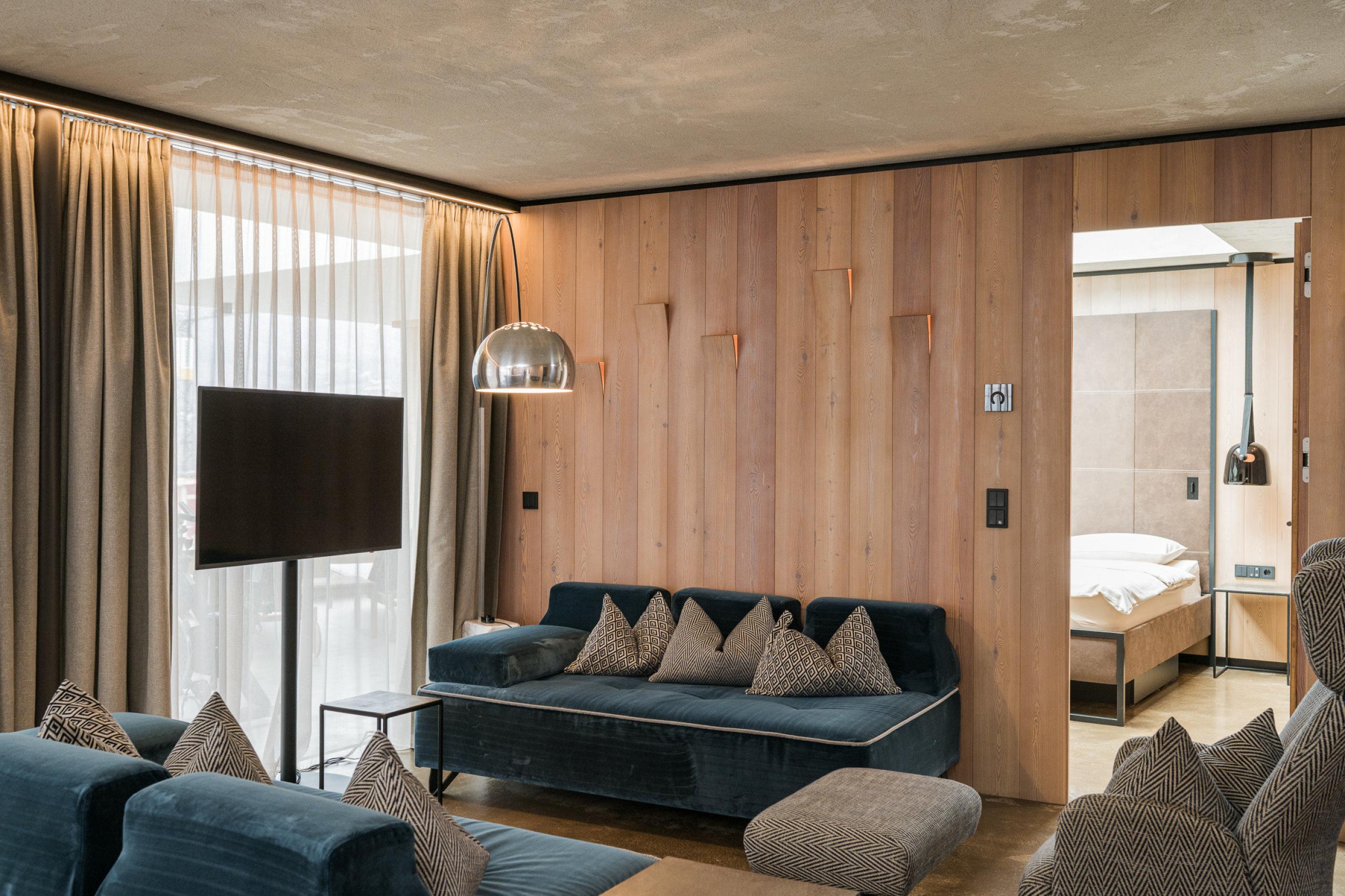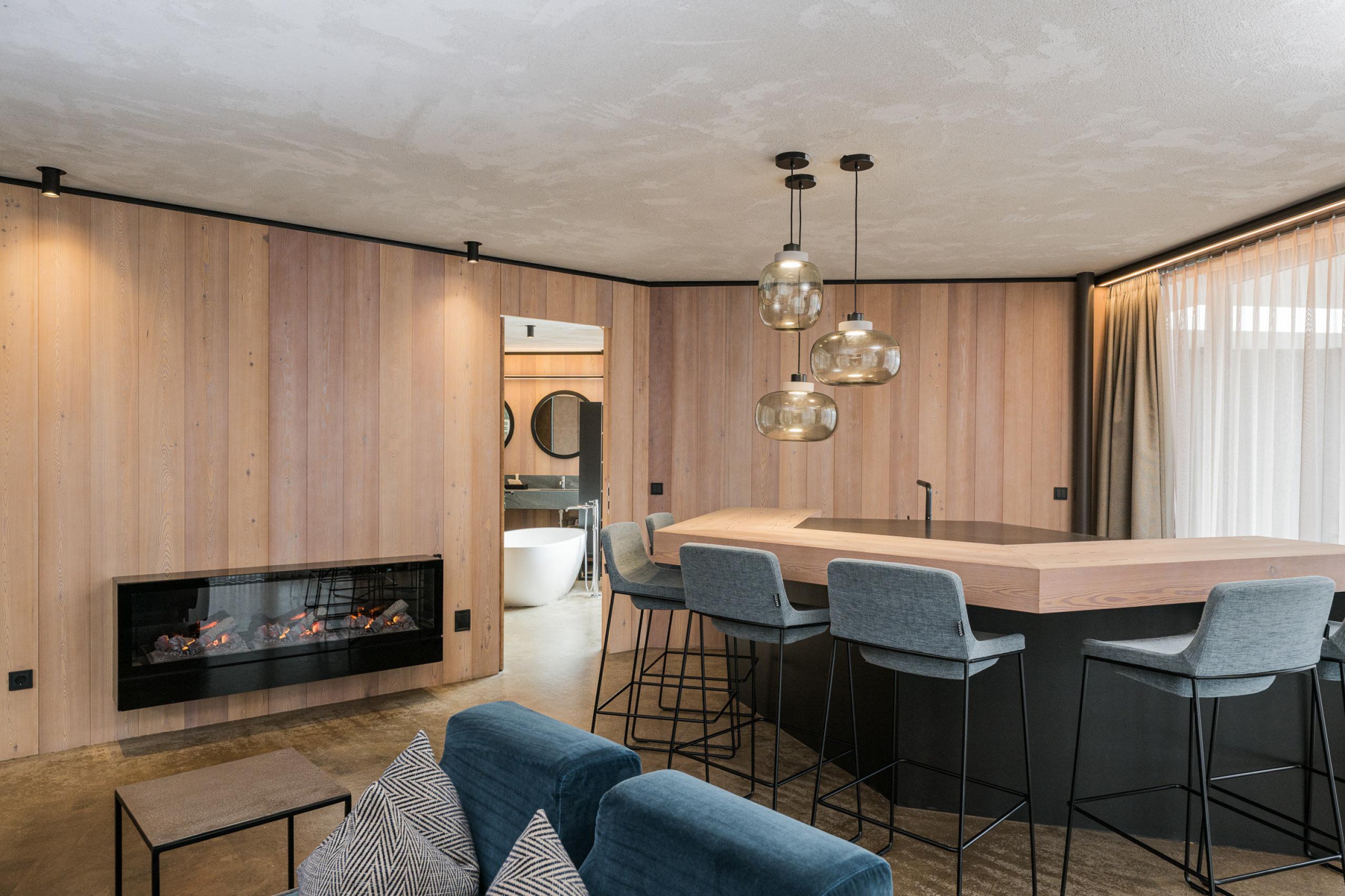 Cosy, modern luxury family suite with 2 bedrooms and a separate living room area, furnishings made of natural materials, natural cement flooring in earth tones, brushed solid local larch wood, rough plaster on the ceiling for pleasant room acoustics, wardrobe and bed made of leather with sky views through the sky light, leather desk with USB port, floor lamp with sofa bed (French size) and designer lounge armchairs with side table, kitchenette (kettle, coffee bar, hob, cocktail bar, large dining table), fireplace, flat-screen TV, home cinema, 2 separate bathrooms with freestanding designer bathtub, bathroom with double sink made of grey South Tyrolean porphyry, shower, toilet and bidet, bathroom radio playing relaxing wellness music, free Wi-Fi, minibar, safe and garage,
