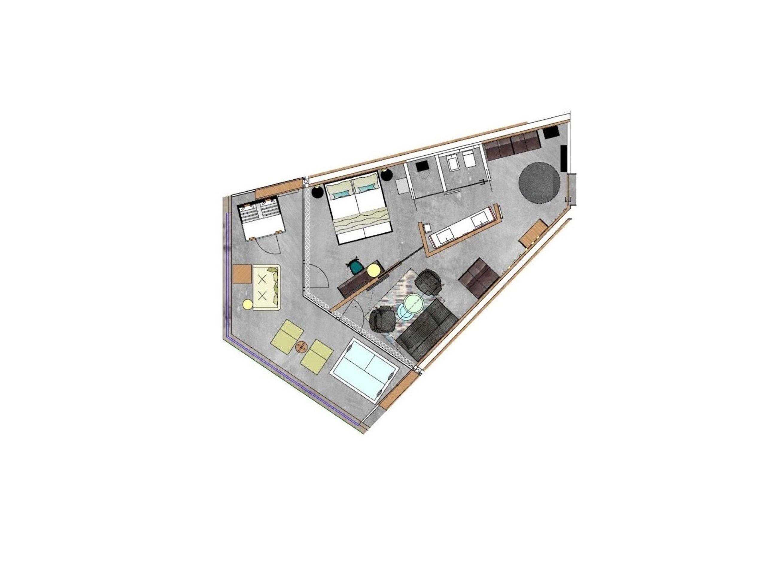 Cosy, modern suite, separate living room and bedroom, furnishings made of natural materials, natural cement flooring in earth tones, brushed solid local larch wood, rough plaster on the ceiling for pleasant room acoustics, wardrobe and bed made of leather, sofa bed (French size), leather desk with USB port, floor lamp with designer lounge armchairs, bathroom with double sink made of grey South Tyrolean porphyry, shower, toilet and bidet, bathroom radio playing relaxing wellness music, flat-screen TV, free Wi-Fi, minibar, safe, garage - pets not allowed