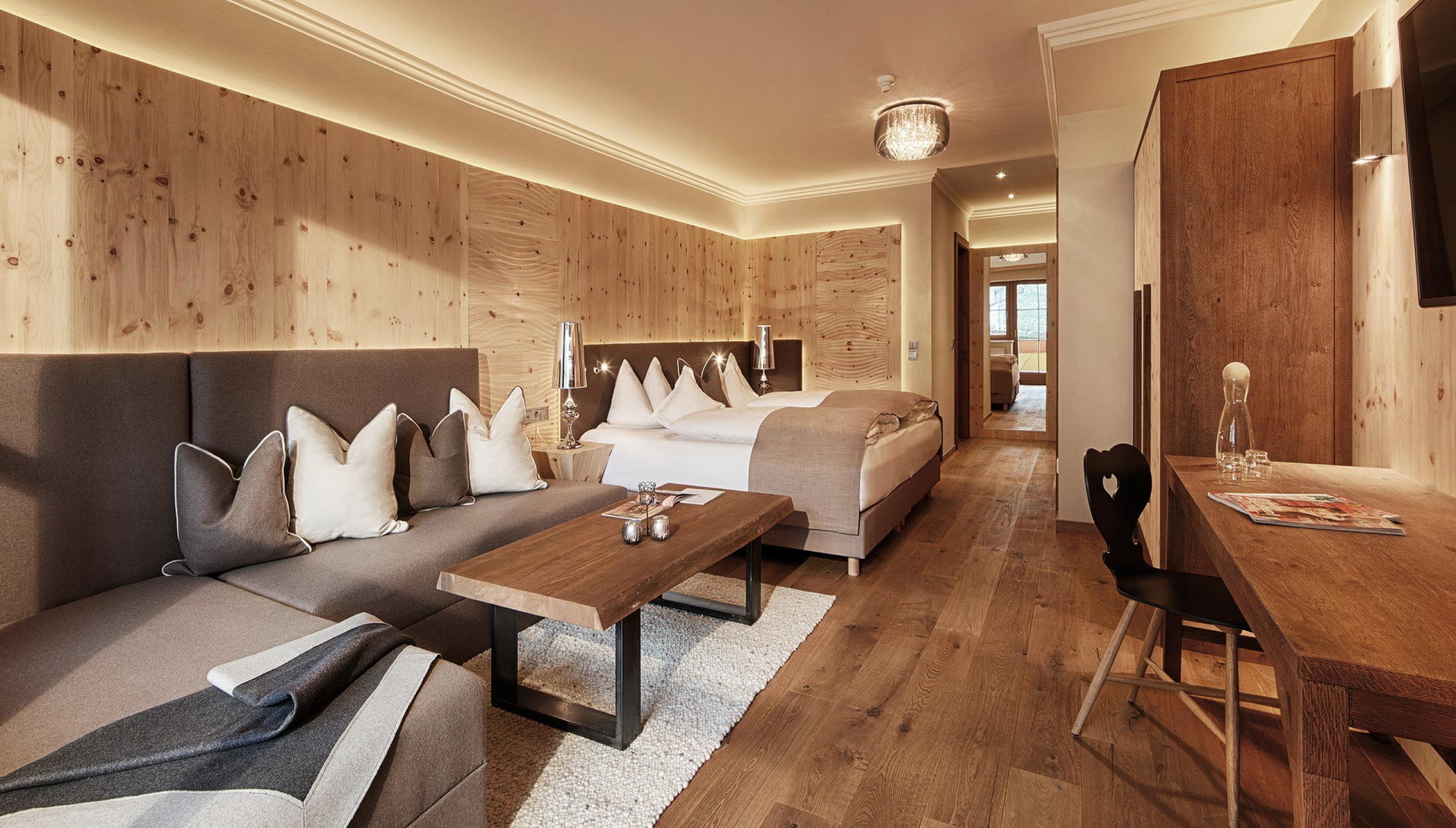 Experience Alpine cosiness in our luxurious rooms and suites, where eco-friendly architecture blends seamlessly with style. Local materials like pine wood, traditional loden fabric, linen, and wooden floors create a warm, inviting ambience, complemented by elegant details and modern design.