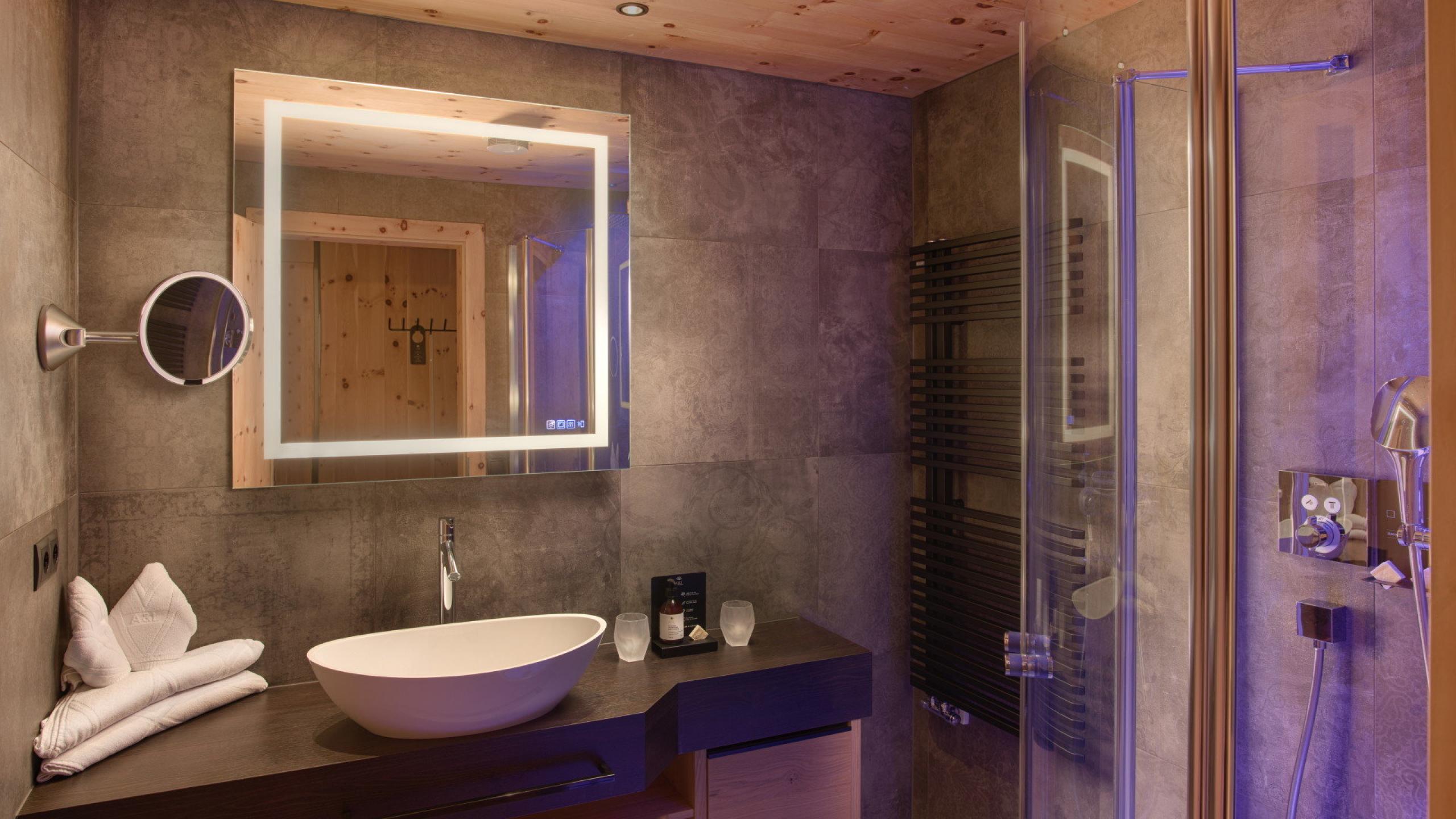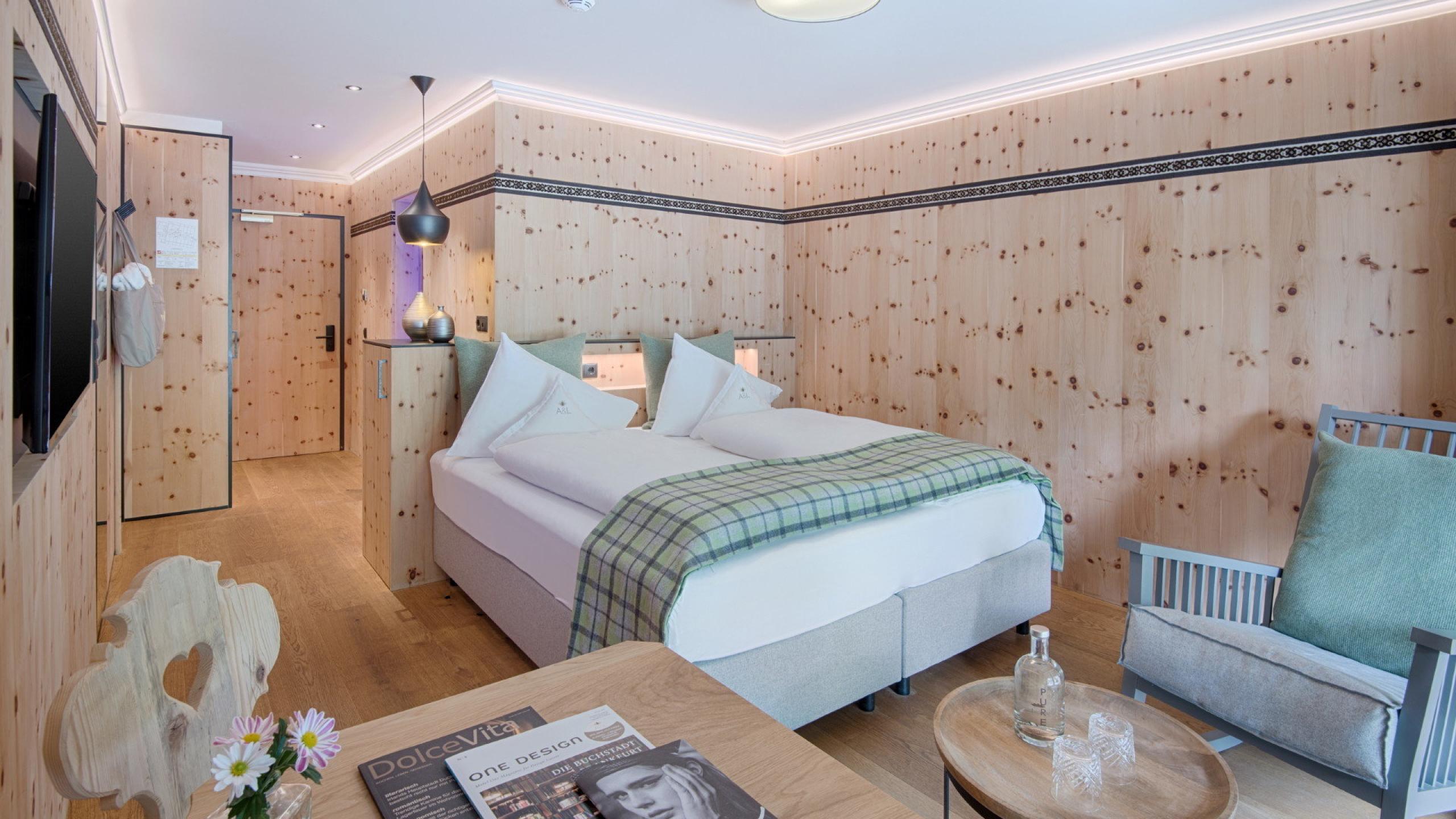 Experience Alpine cosiness in our luxurious rooms and suites, where eco-friendly architecture blends seamlessly with style. Local materials like pine wood, traditional loden fabric, linen, and wooden floors create a warm, inviting ambience, complemented by elegant details and modern design.