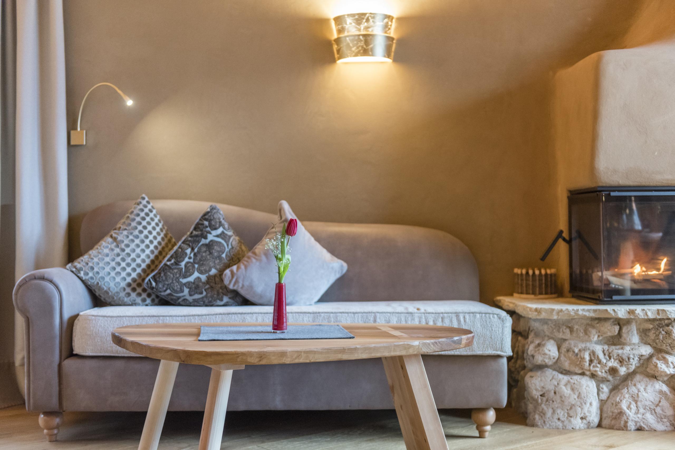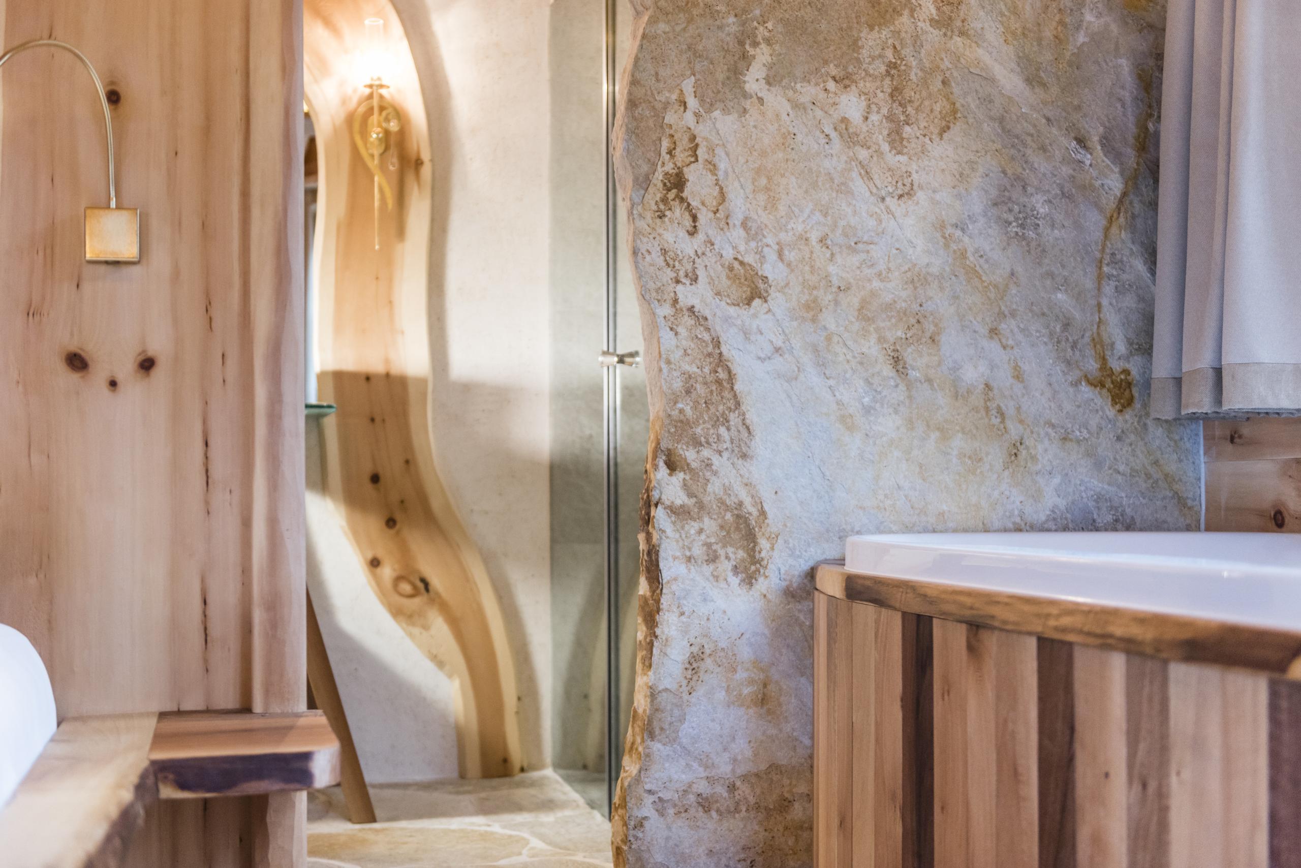 This suite is located in the bathhouse Terra, one of the two Alpine bathhouses in the wellness garden, and is fully designed with Swiss pine wood. Featuring an open fireplace, a cozy living area, and a balcony overlooking the surrounding nature of the Luson Valley, it offers a unique retreat. The private wellness area of the bathhouse Quarzit, including the salt float grotto, is available daily from 10 a.m. to 10 p.m. and is included with the booking of this suite.