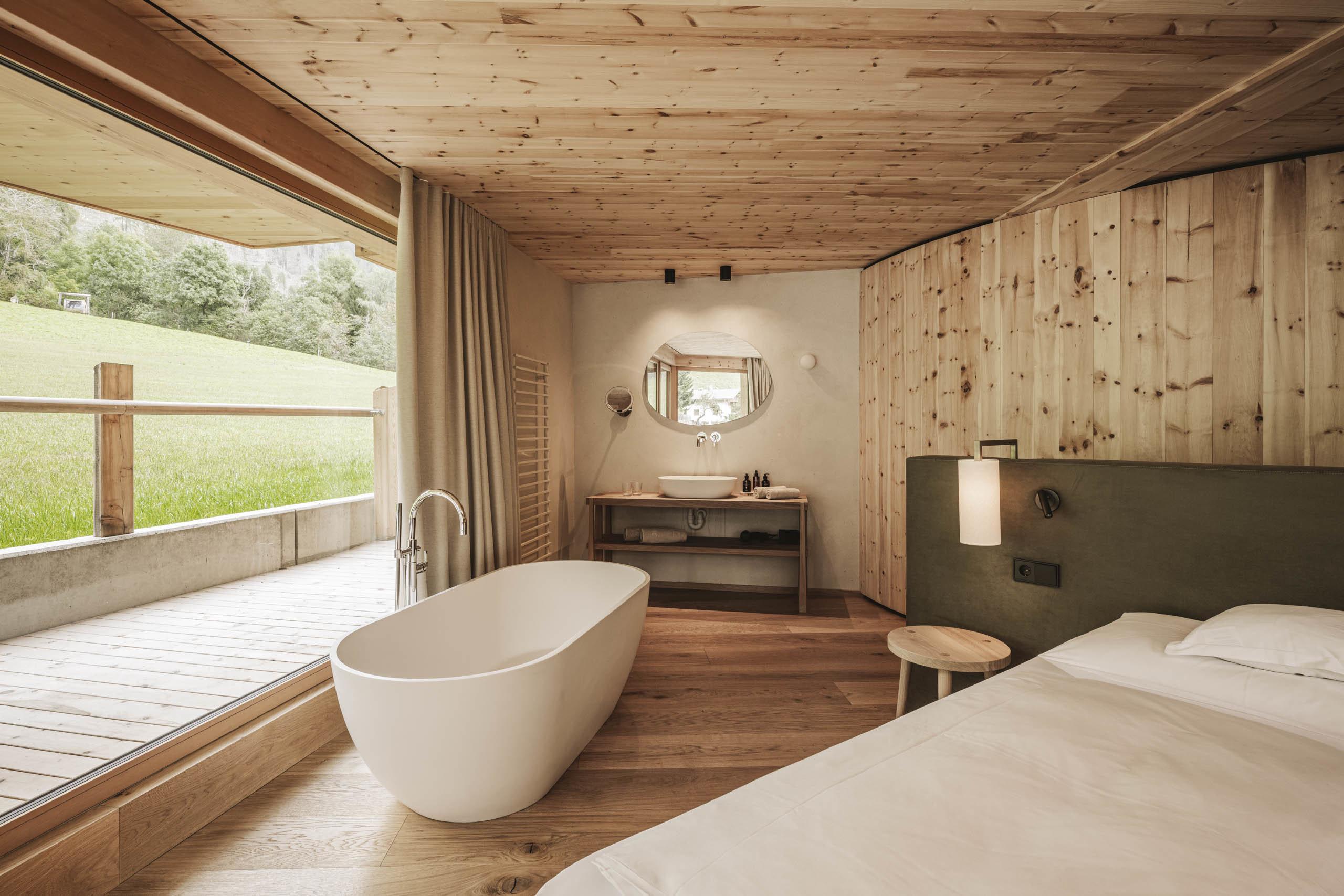 The Forest Suite Deluxe (completed in June 2024) is a special retreat that offers unparalleled tranquility and connects to nature. Here, the soul can awaken with a dreamy forest view, and your mind can find inspiration from the beauty of nature. Large panoramic windows flood the spacious room with natural light and offer a breathtaking view of the surroundings. The cozy and stylish furniture, designed according to the principles of Lüsnerhof bioconstruction architecture, create a special atmosphere. Here you will find a perfect combination of natural comfort and sustainable design. With Smart TV.