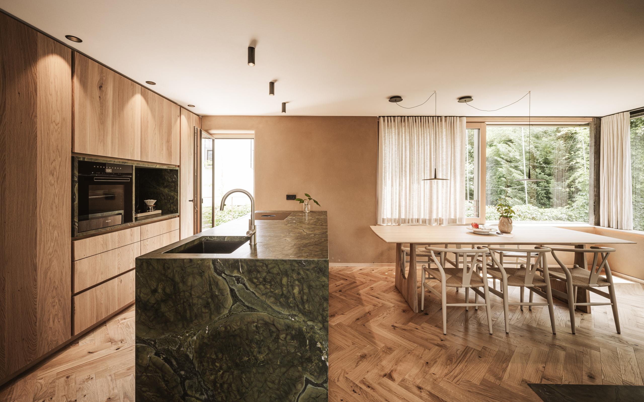 In fact, it is not uncommon for us to observe guests standing open-mouthed at the large glass fronts of the 90m² luxury flat, gazing in amazement at the Brixen Cathedral and the parish church, the Gitschberg and the South Tyrolean low mountain range. On the two outdoor loggias, your thoughts may already be planning beautiful excursions, while the lively mountain stream gurgles pleasantly in the background, and your ears listen to the open-air concerts of songbirds, or your favourite book captivates you, while the sun soothingly warms body and soul. The elegant and lavishly designed living room with open fireplace including dining area and spacious, well-equipped kitchen made of green quartzite marble is a feast for the eyes. Two noble bathrooms and two cosy bedrooms leave nothing to be desired.