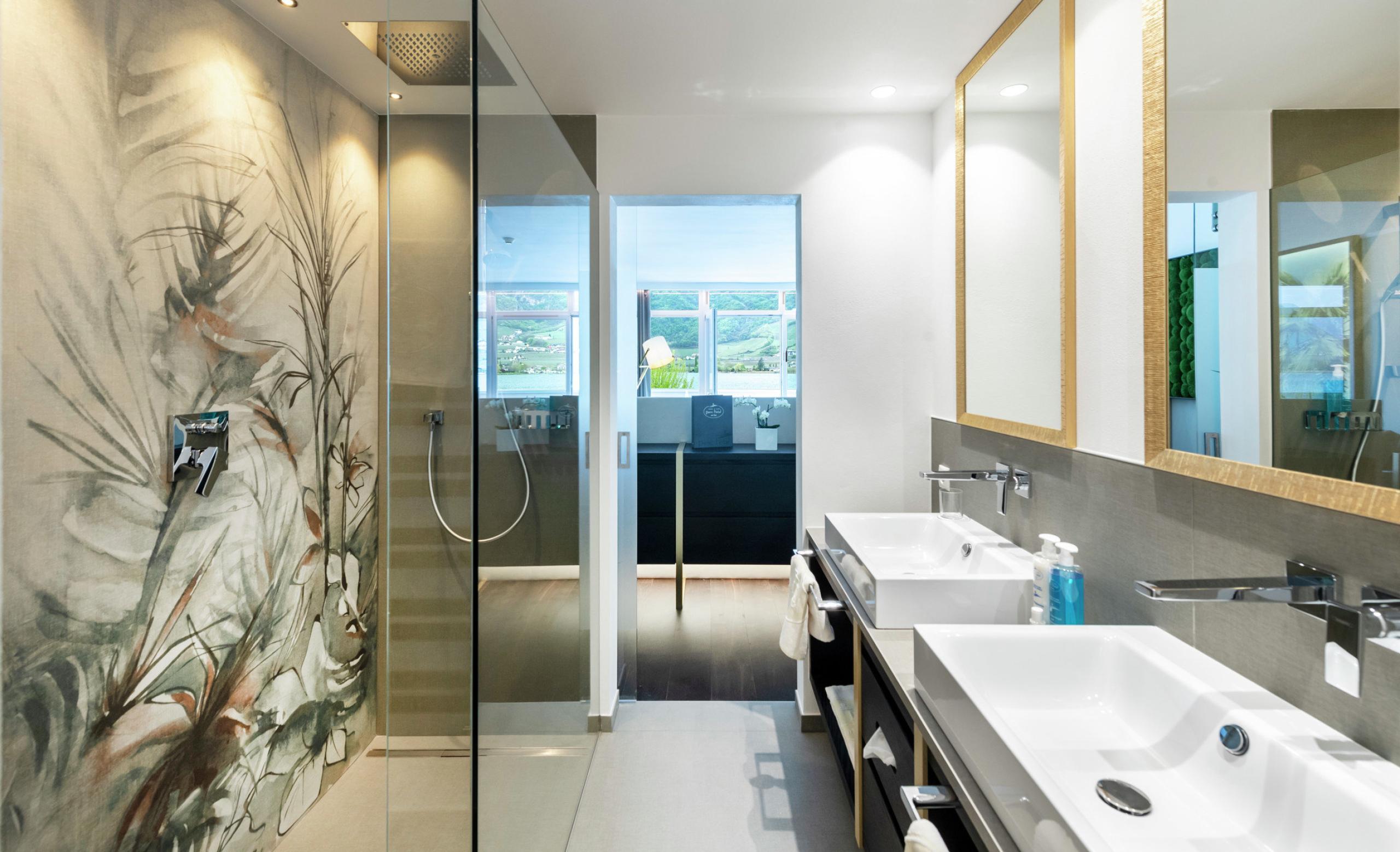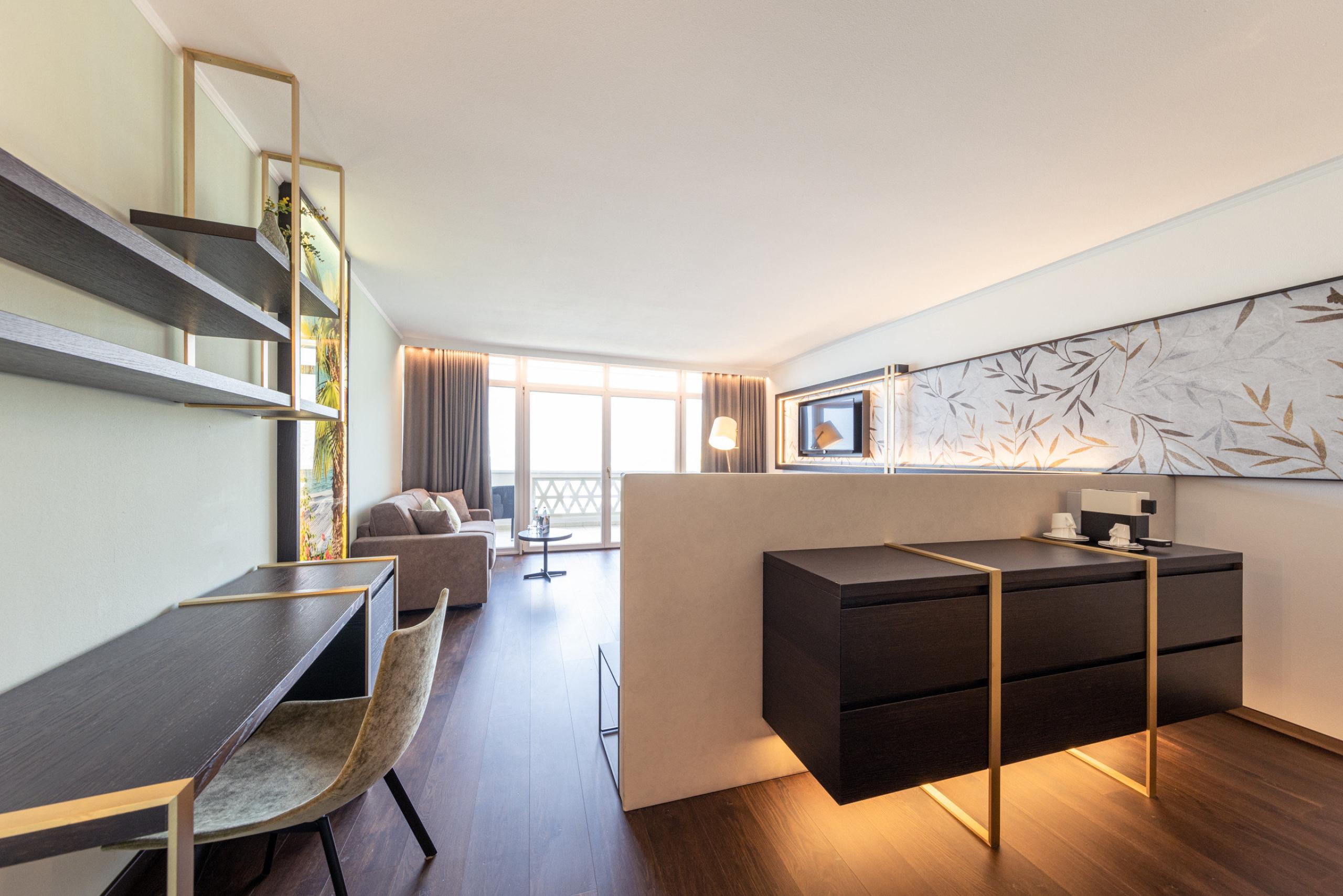 Room setup: parquet floor, air conditioning, TV, spacious window front with unique panoramic view of Lake Kaltern, coffee-tea machine, hiking backpack, living & sleeping room with comfortable sofa, box-spring beds, modern and stylish furnishings, modern bathroom with shower, toilet separate and bidet, double sinks, high-quality beauty products, hairdryer as well as the wellness bag with fluffy bathrobe, bath towels and slippers, free WLAN, minibar, safe.