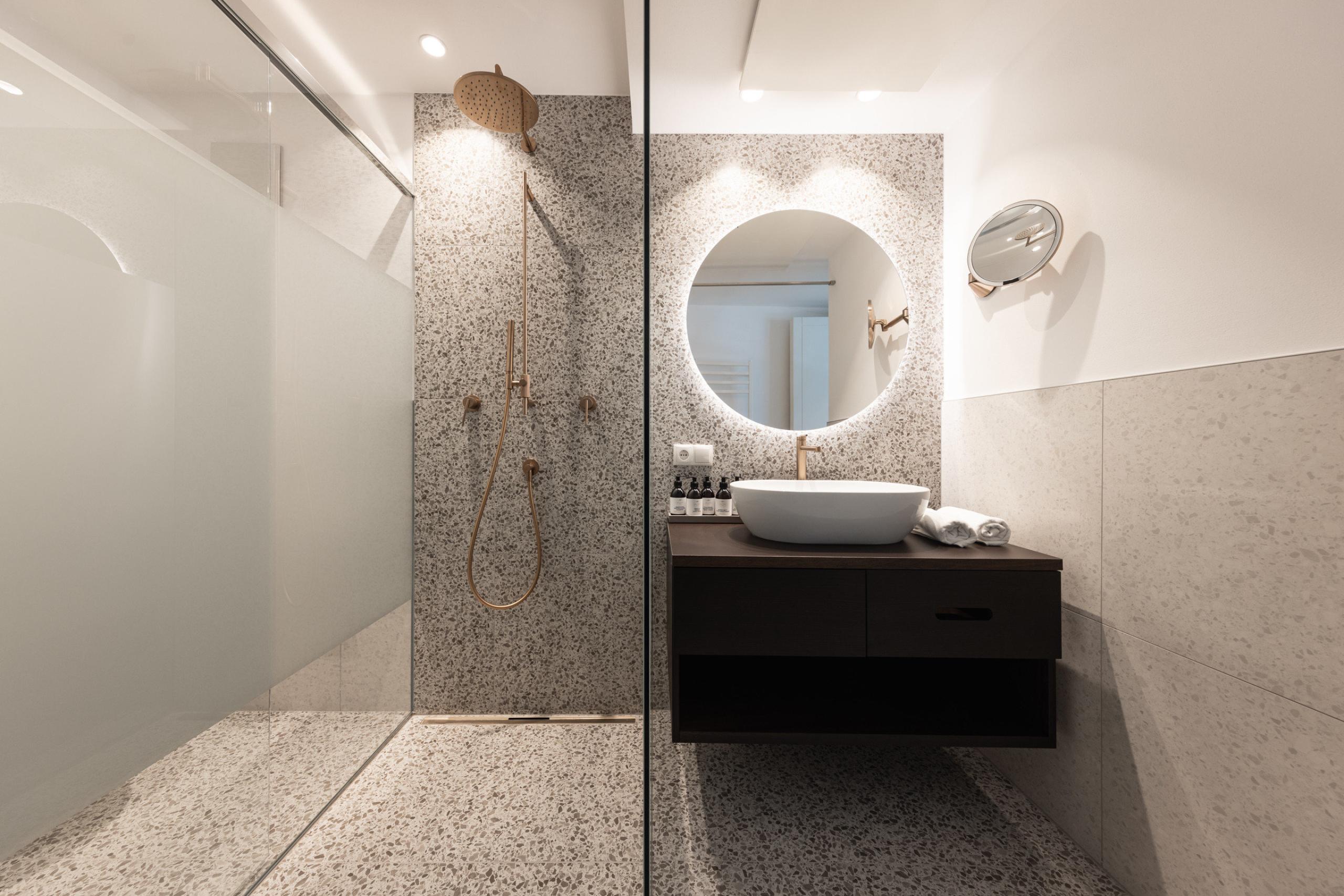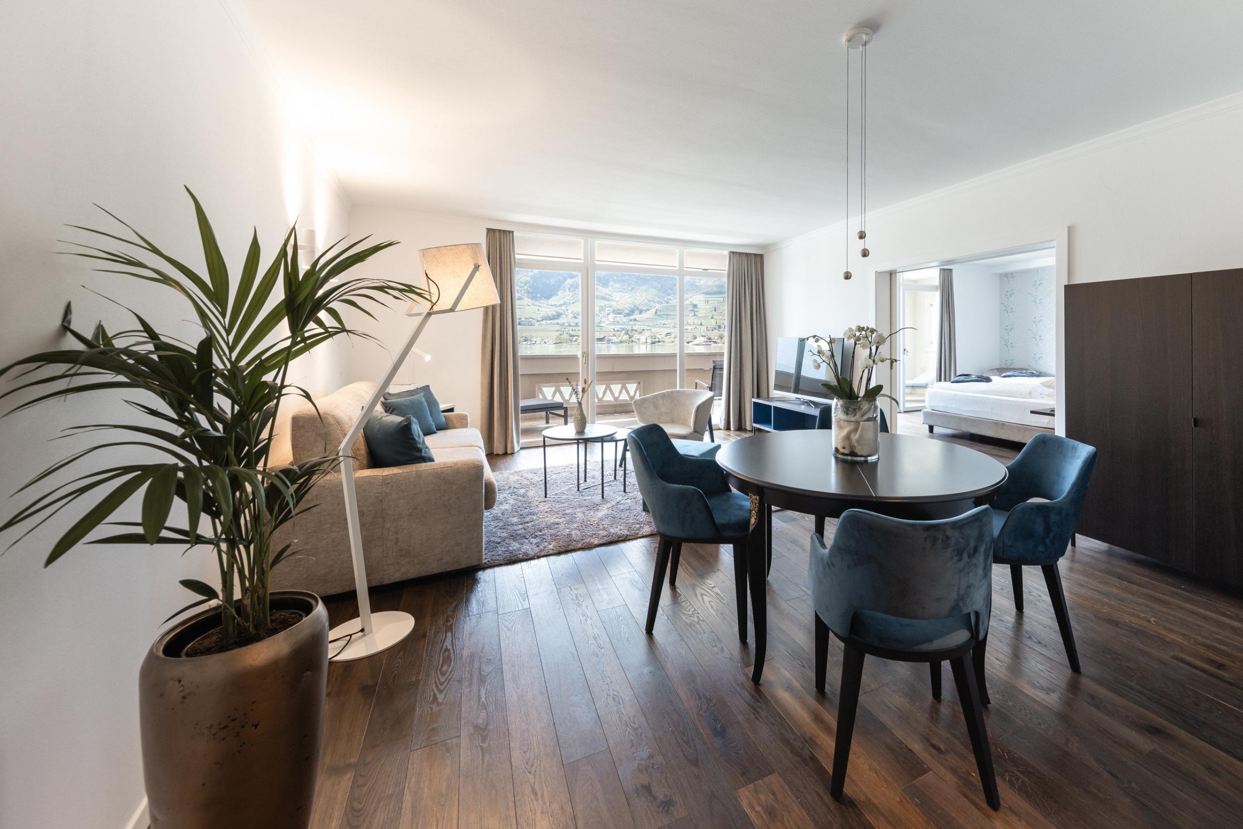 Room setup: parquet floor, air conditioning, TV, coffee machine, hiking backpack, separate living room and bedroom with comfortable sofa, stylish furnishings, two bathrooms, one with a bath tub, WC and bidet, the other with shower, WC and bidet, high-quality beauty products, hairdryer, wellness bag with fluffy bathrobe and bath towels, free WLAN, minibar and wine minibar, safe.