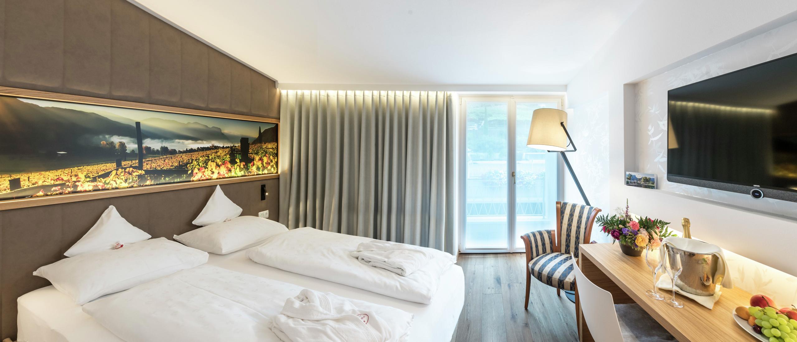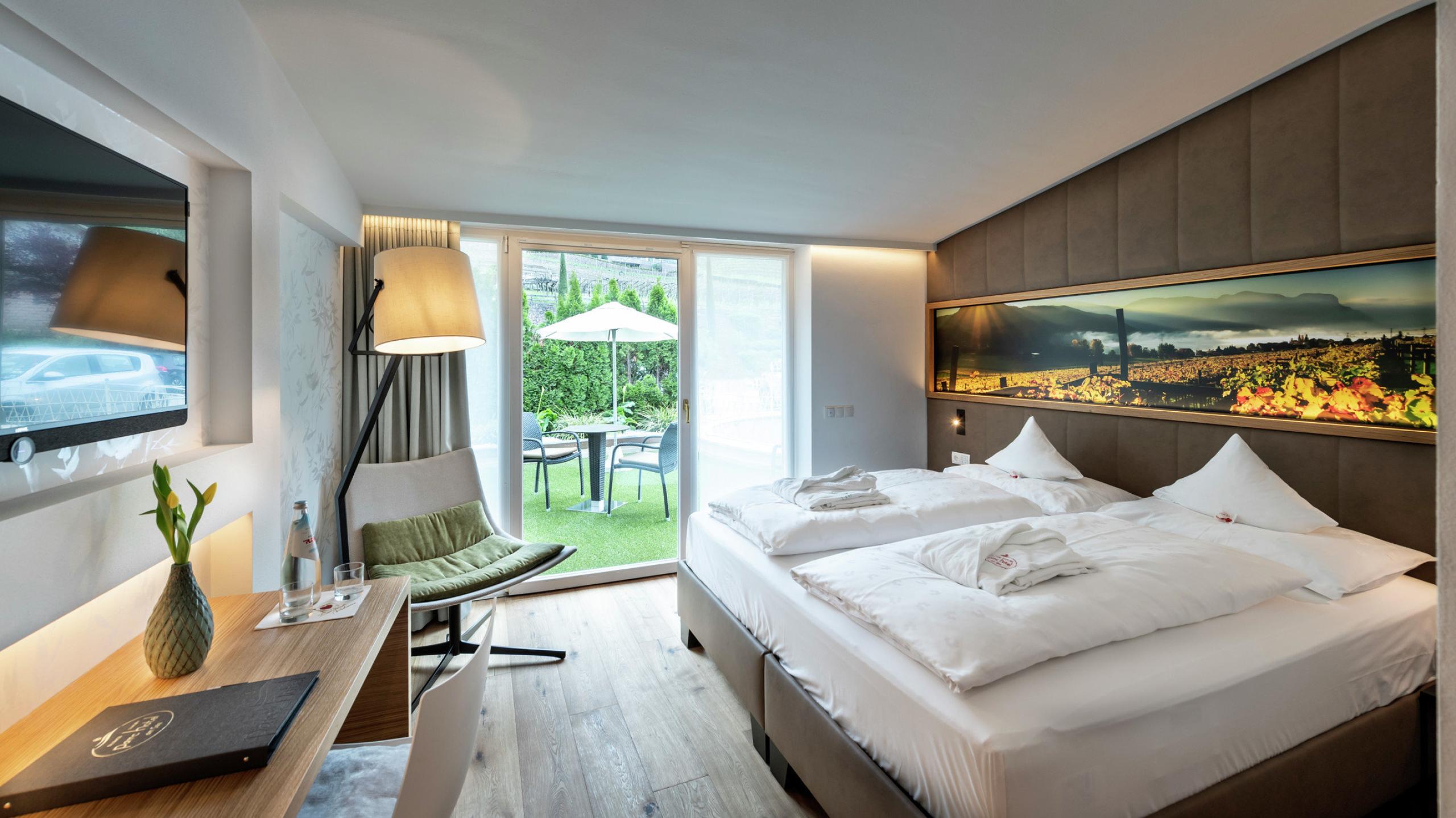 Luxury and ease await you in our elegant rooms and suites right by Lake Caldaro/Kalterer See, offering a stylish, relaxed stay with stunning lake views.