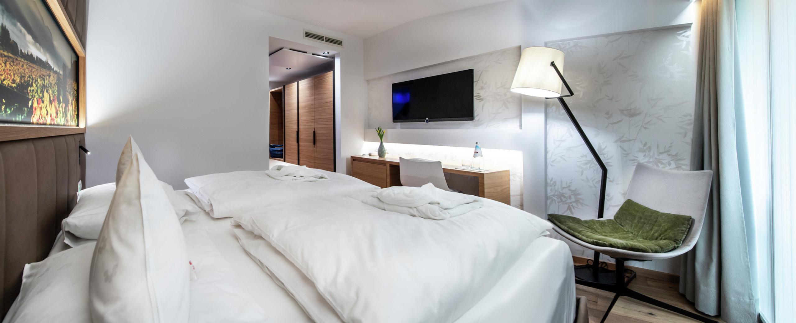 Room setup: parquet floor, air conditioning, TV, hiking backpack, modern and stylish furnishings, box-spring beds, modern bathroom with shower and toilet, separated by a sliding glass door, high-quality beauty products, hairdryer, wellness bag with fluffy bathrobe, bath towels and slippers, free WLAN, minibar, safe.