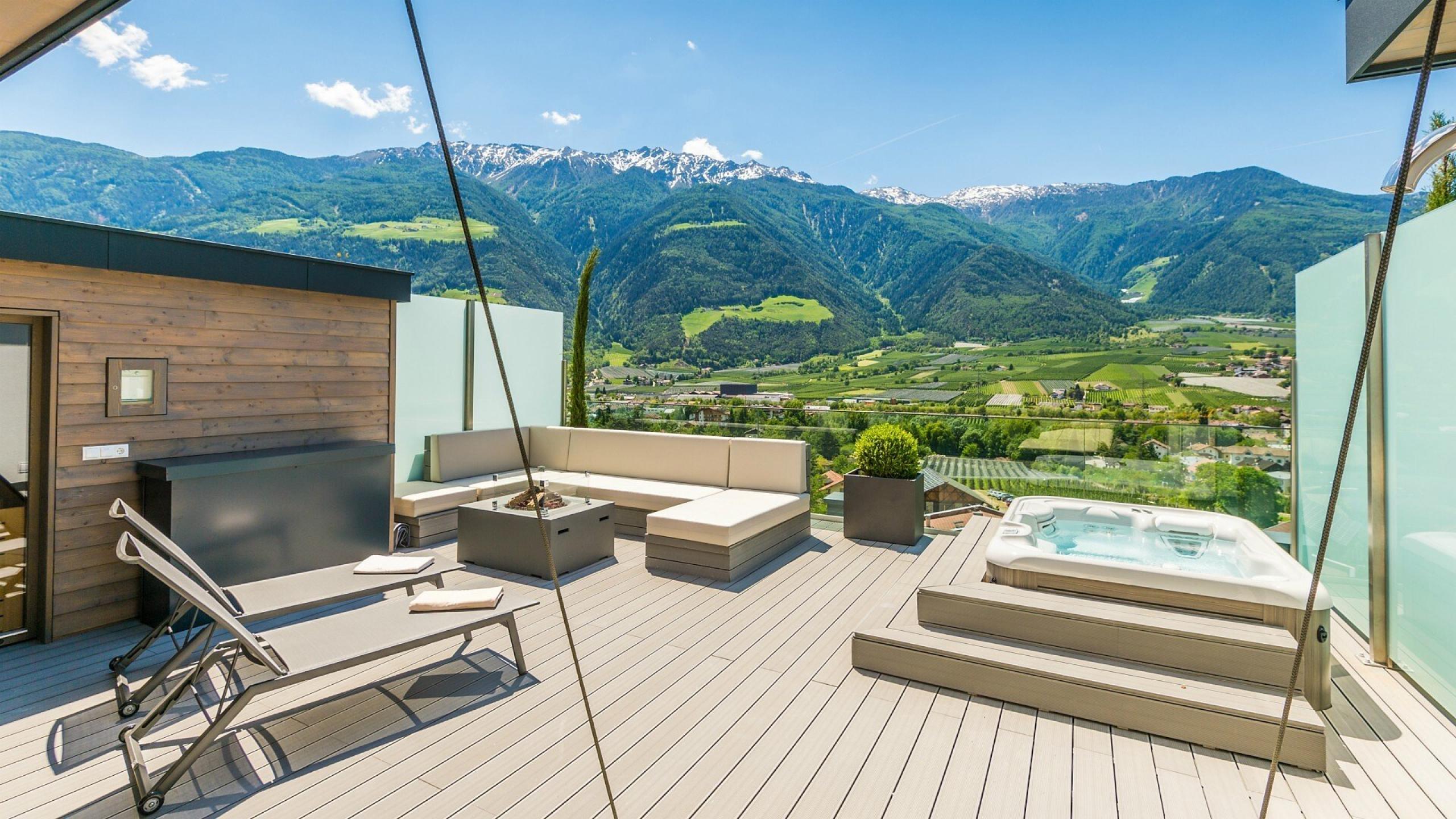 106m² including 61m² outdoor penthouse terrace with panoramic view, whirlpool, private butler service, open-plan living/sleeping lounge with romantic fire, luxury box-spring beds (king size 200x210cm) with Sleep-Fit-Health-System, comfort-professional cabinet area, 2 relaxing designer chairs, 55" Smart-TV with Google Chromecast, suitcase-style bar with wine, Nespresso & tea desk, bathing lounge with designer mirror made of semi-precious stone with lady's beauty desk, multi-sensory shower for two, outdoor penthouse terrace and garden in a private setting, whirlpool de luxe with hygienic-luxury-system, Finnish exterior sauna with multi-sensory shower for two & swing couch for two, "Sky Star" fireplace with cosy lounge, outdoor cinema, comfortable seating and dining furnishings, aromatic herbs, radiant warmers and lantern, no animals. In our DolceVita Lodge.