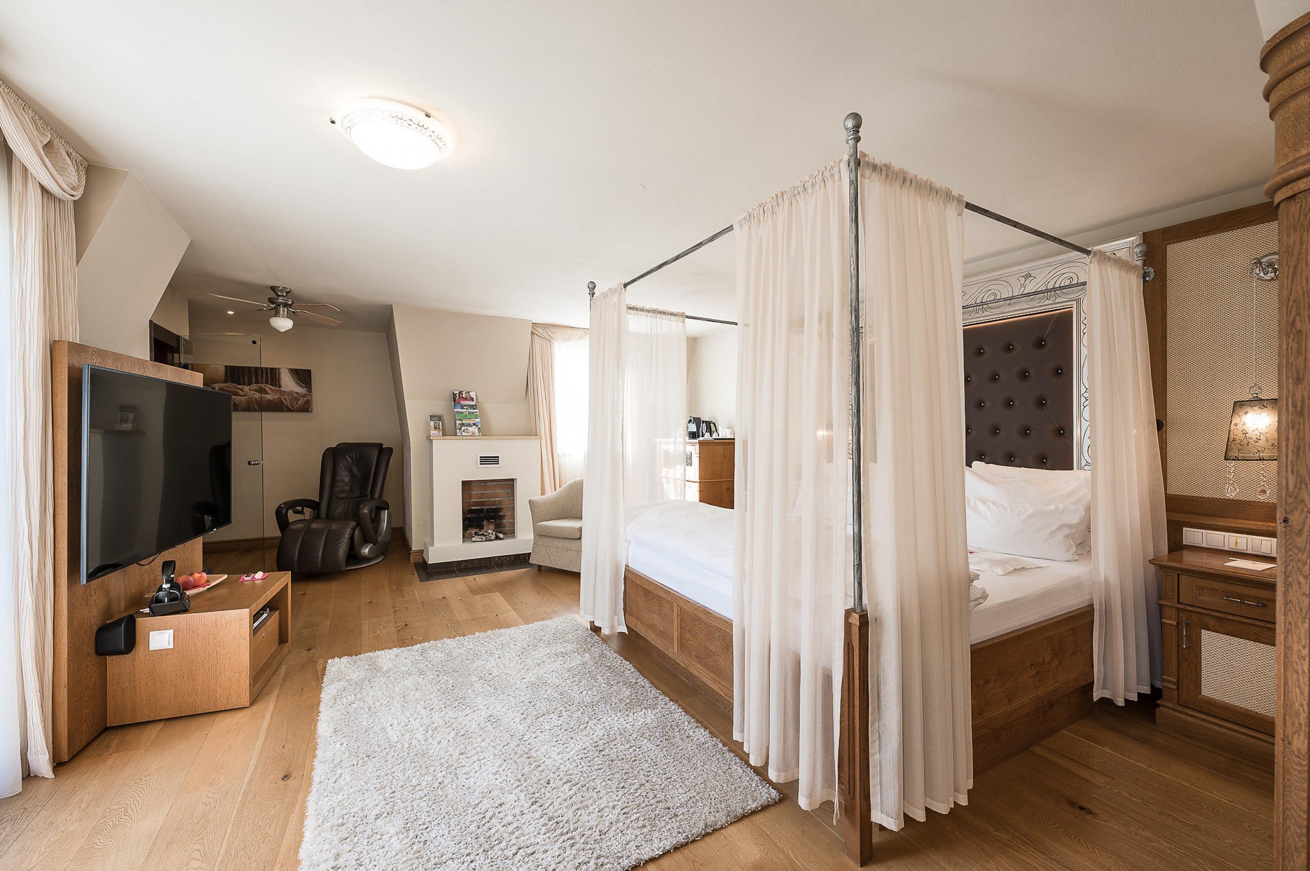 71m² including 6m² east-facing balcony with panoramic view classic, elegant natural wood furnishings, elegant suite with spacious living and sleeping area, luxury "Romantic dream" canopy bed (king size 200x210cm) with starry-sky effect with Sleep-Fit Health-System, spacious comfort-cabinet system, infrared sauna, massage-relaxation chair, writing and work table, romantic fireplace, 55" Smart-TV with Google Chromecast, small bar with wine, Nespresso & tea desk, spacious luxury bathroom with relaxing shower for two, romantic whirl-bath with hygienic luxury system, noble washbasin, separate toilet and bidet, east-facing balcony with views overlooking the vineyards and comfortable relaxation furnishings, no animals. In our Sonnenschlössl.