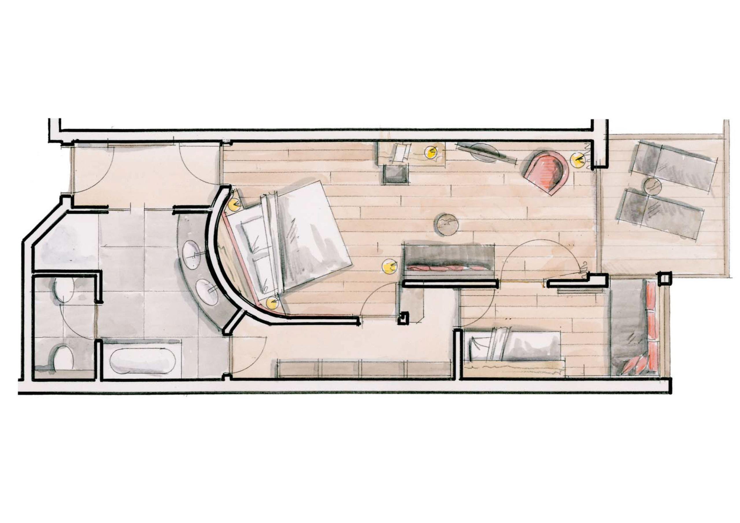 Suite with 55 m² and separable additional room, south-facing balcony, walk-in closet, air conditioning, 2x TV, hi-fi system, minibar, bathtub, shower, bidet, separate toilet