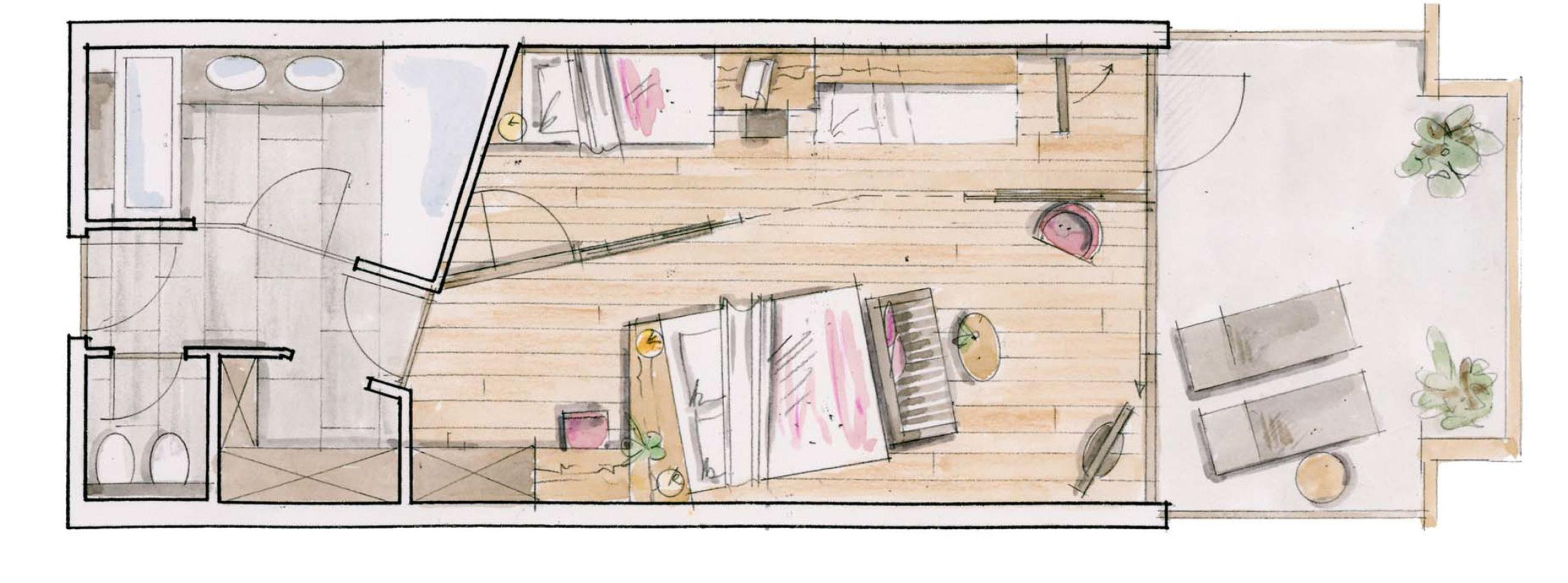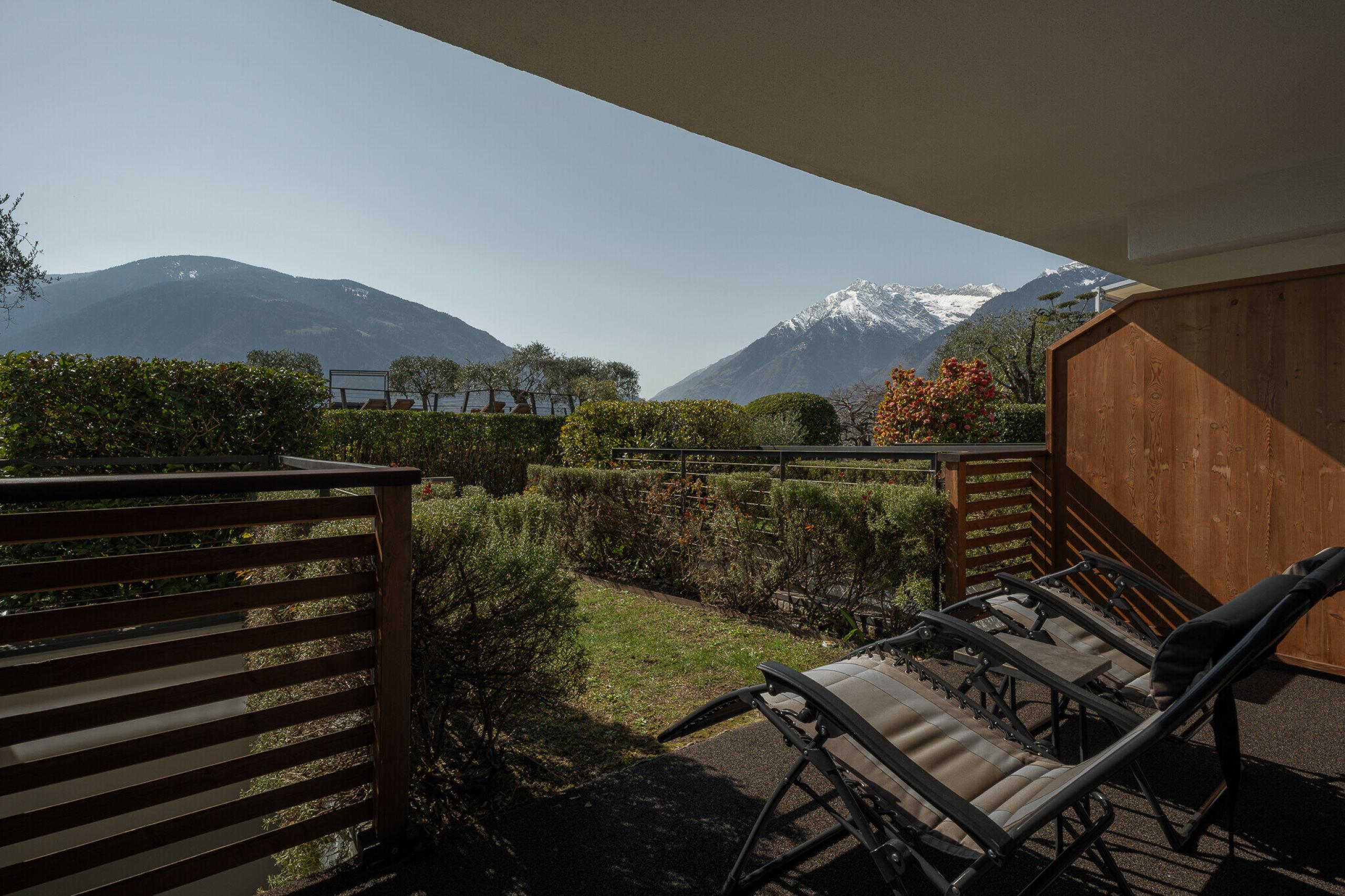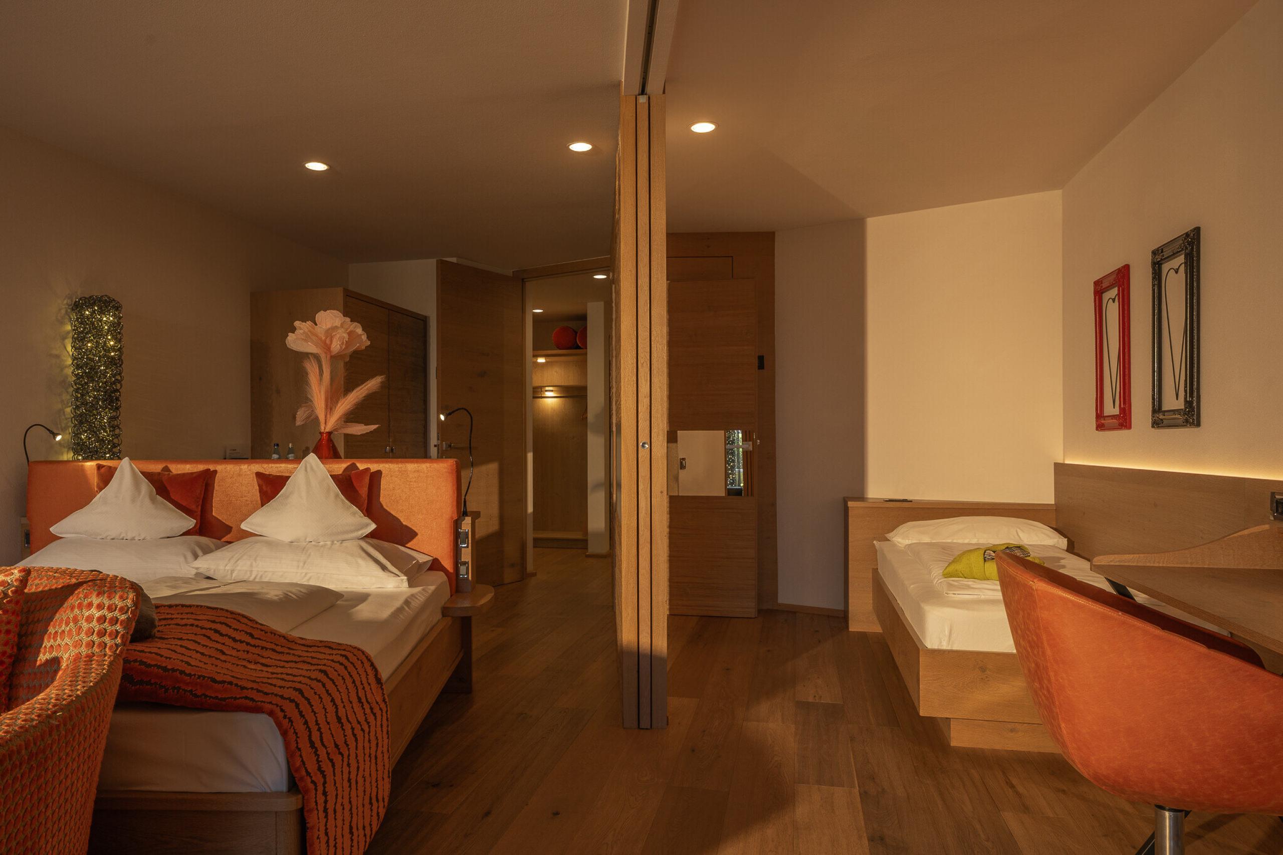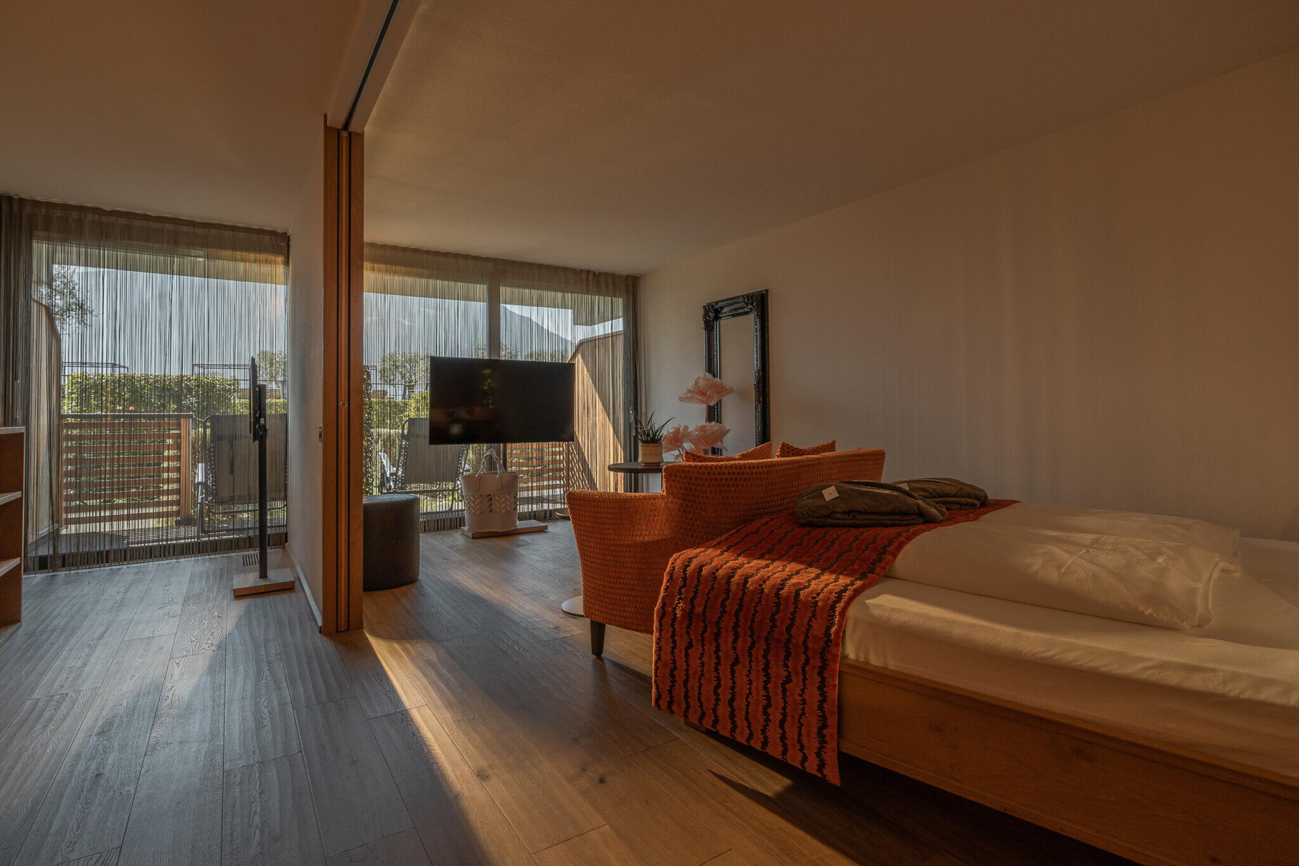 Double room with 49 m² & separable additional room, balcony with view and access to the garden, walk-in closet, 2x flat screen TV, minibar, air conditioning, shower, bathtub, bidet, separate toilet