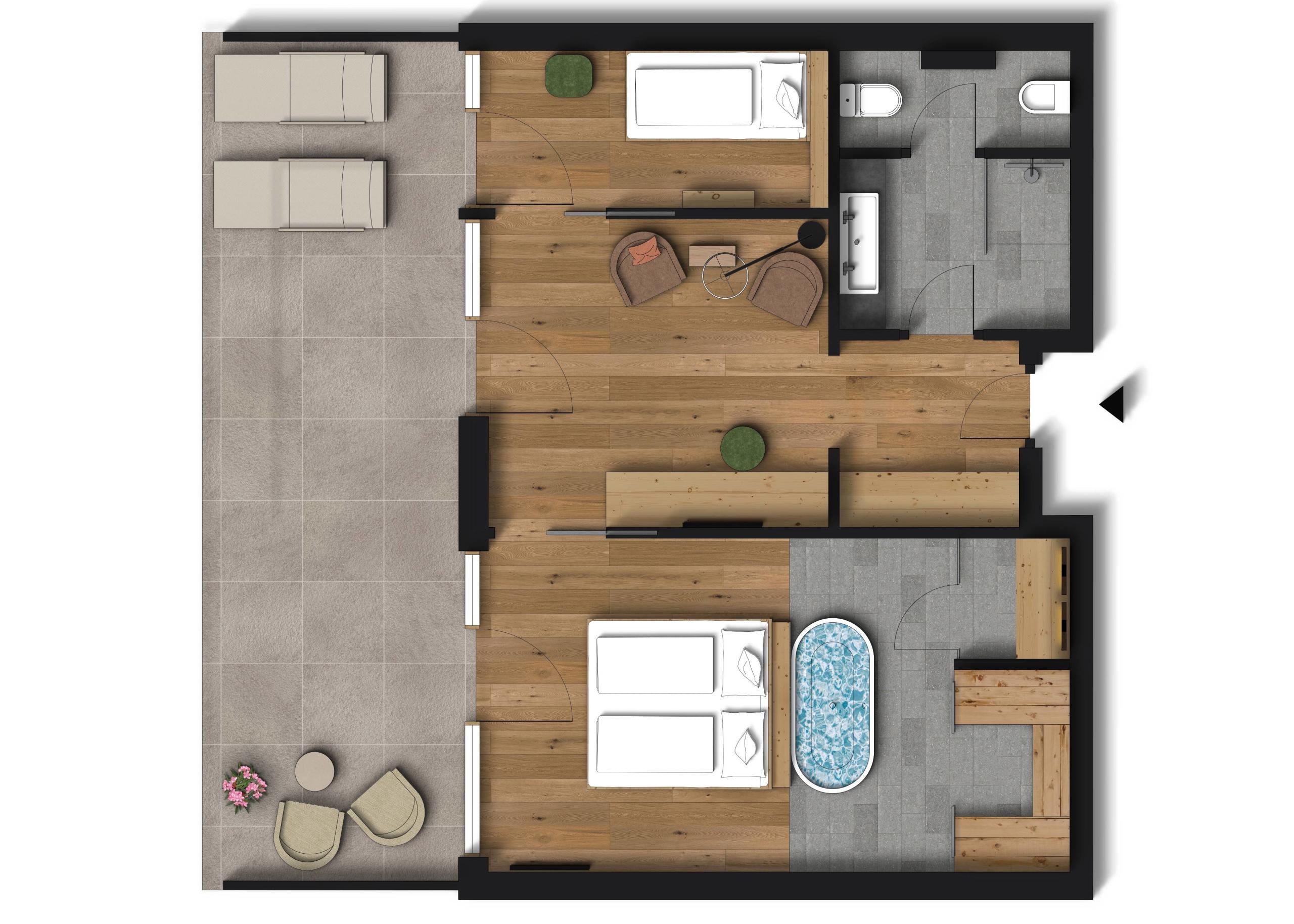 Luxurious suite with spacious south-facing terrace, relax loungers with Dolomite views, and a private infrared cabin. Natural materials, natural wood flooring. Separate living room, additional bedroom, freestanding bathtub. Bathroom with shower, separate toilet and bidet, walk-in closet. Extra-long bed, relax armchairs in the living area.