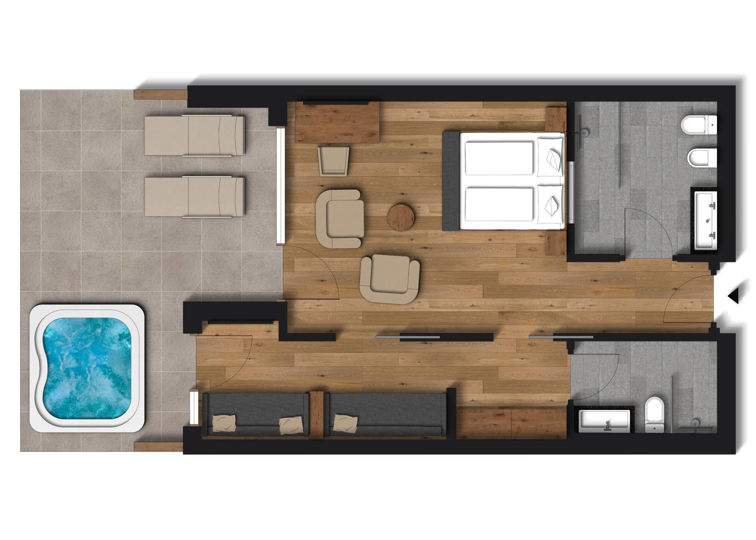 Spacious suite with terrace, whirlpool, and Dolomite views. Natural materials, natural wood flooring. Separate living room can be used as a second bedroom. Main bathroom with double washbasin, shower, bathtub, toilet, and bidet. Second bathroom with shower, toilet, and washbasin. Walk-in closet.