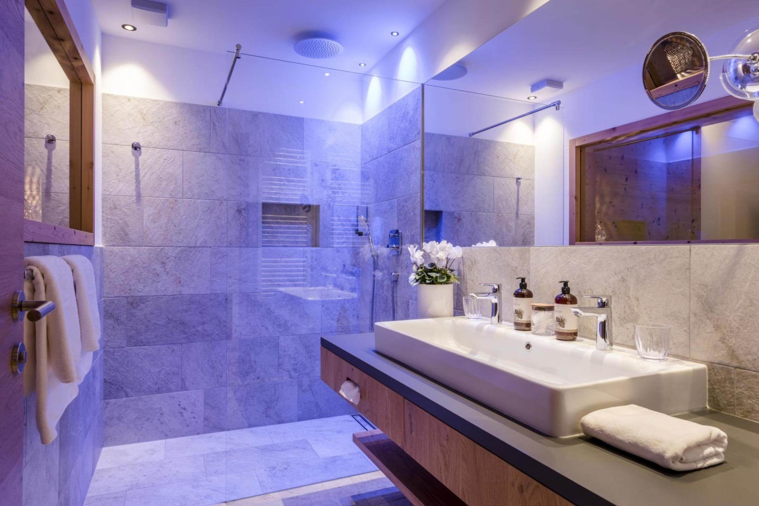 Stylish junior suite with spacious south-facing terrace, relax loungers, and stunning Dolomite views. Natural materials, natural wood flooring. Double bed, living area with sofa. Modern bathroom with double washbasin, shower, and natural light; separate toilet and bidet.