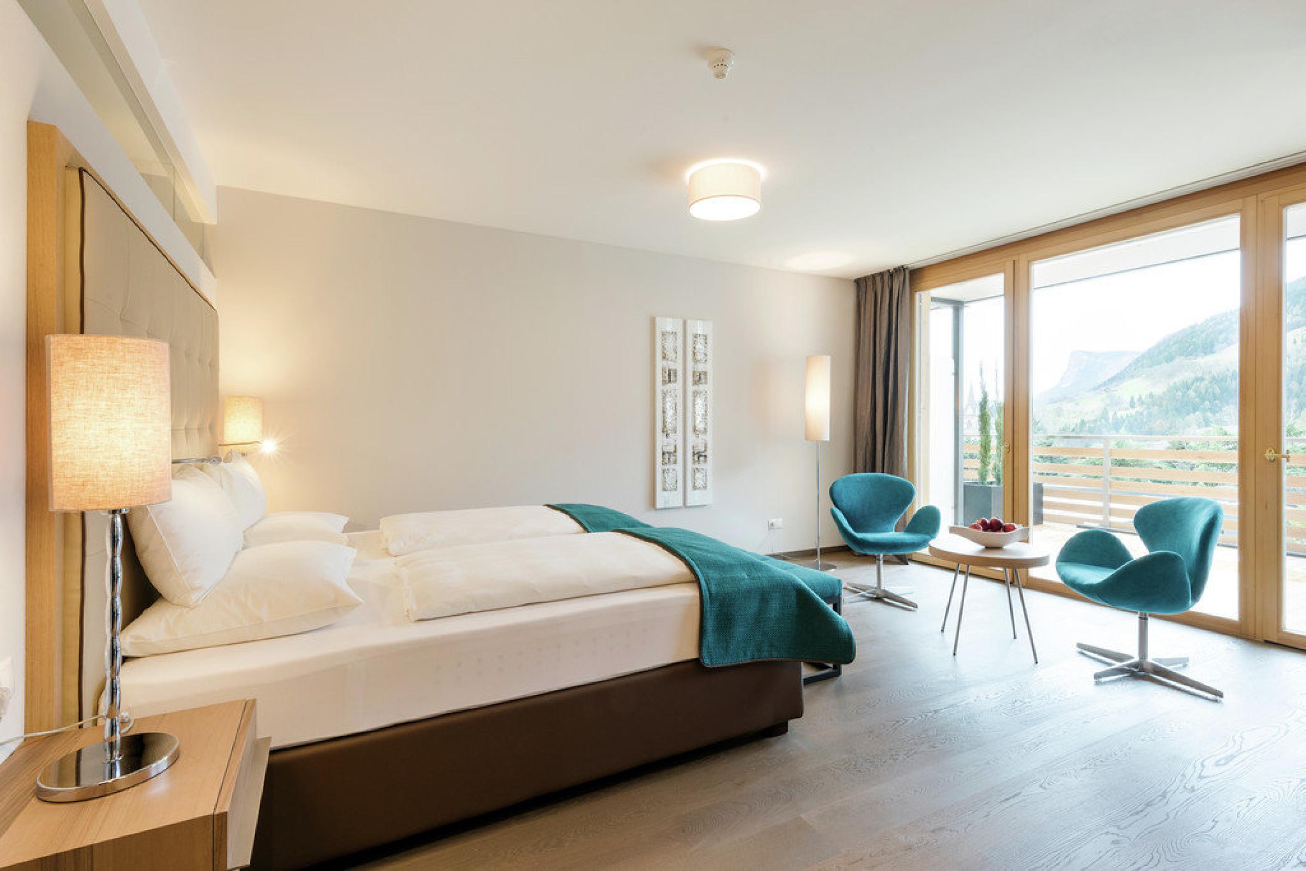 La camera matrimoniale Deluxe propone panorami sconfinati! La sua posizione al 1° piano regala una splendida vista sul Pool Garden. Le ampie finestre e il balcone con pergola esposto a sud (8 m²) rendono la camera matrimoniale Deluxe un nido di intimità e lusso. All’interno, la bellezza ricorre in ogni angolo: i tessuti color blu petrolio creano un contrasto cromatico con il pavimento in rovere dalle nuance della terra. L’ambiente elegante e il comodo letto matrimoniale garantiscono sonni riposanti.