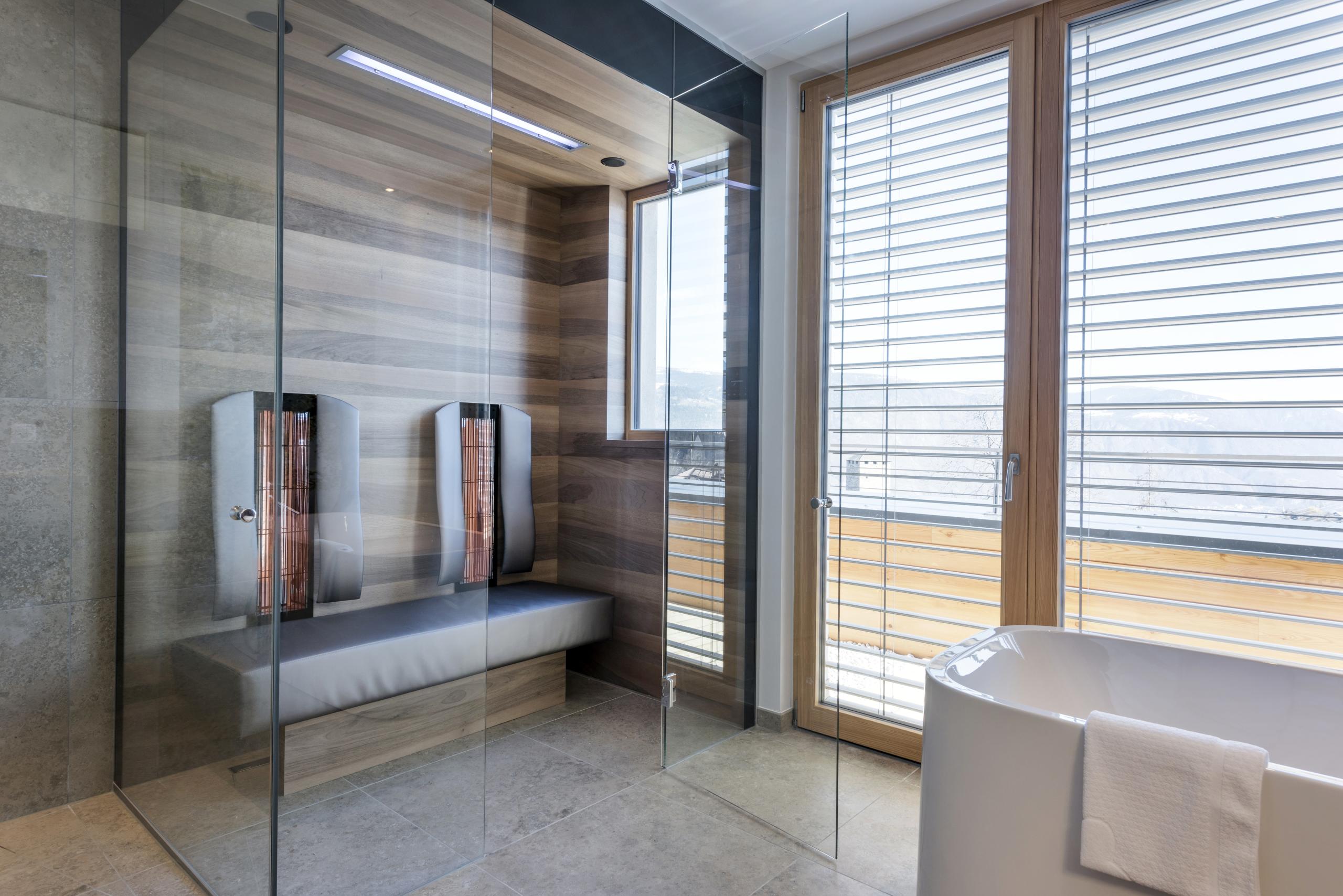 La Sky Luxus Suite propone un soggiorno stellato: in fondo riposare a un passo dalle stelle è un’esperienza celestiale! Chi lo desidera può dormire sotto la volta celeste: al balcone con pergola (20 m²) esposto a sud si aggiunge al piano superiore della suite una terrazza di 40 m² con vista a 360°, un’area lounge e relax e un padiglione esterno con tetto in vetro per “dormire sotto le stelle”. Anche gli spazi interni sono altrettanto paradisiaci: un letto matrimoniale oversize si abbina all’inconfondibile design ALPIANA e i tessuti color blu petrolio creano un contrasto cromatico con il pavimento in rovere dalle nuance della terra. Una sauna a infrarossi a uso privato, una cabina armadio, un bagno spazioso con vasca da bagno freestanding (con WC separato) e un posto auto riservato all’interno del garage completano i servizi di questa suite esclusiva.