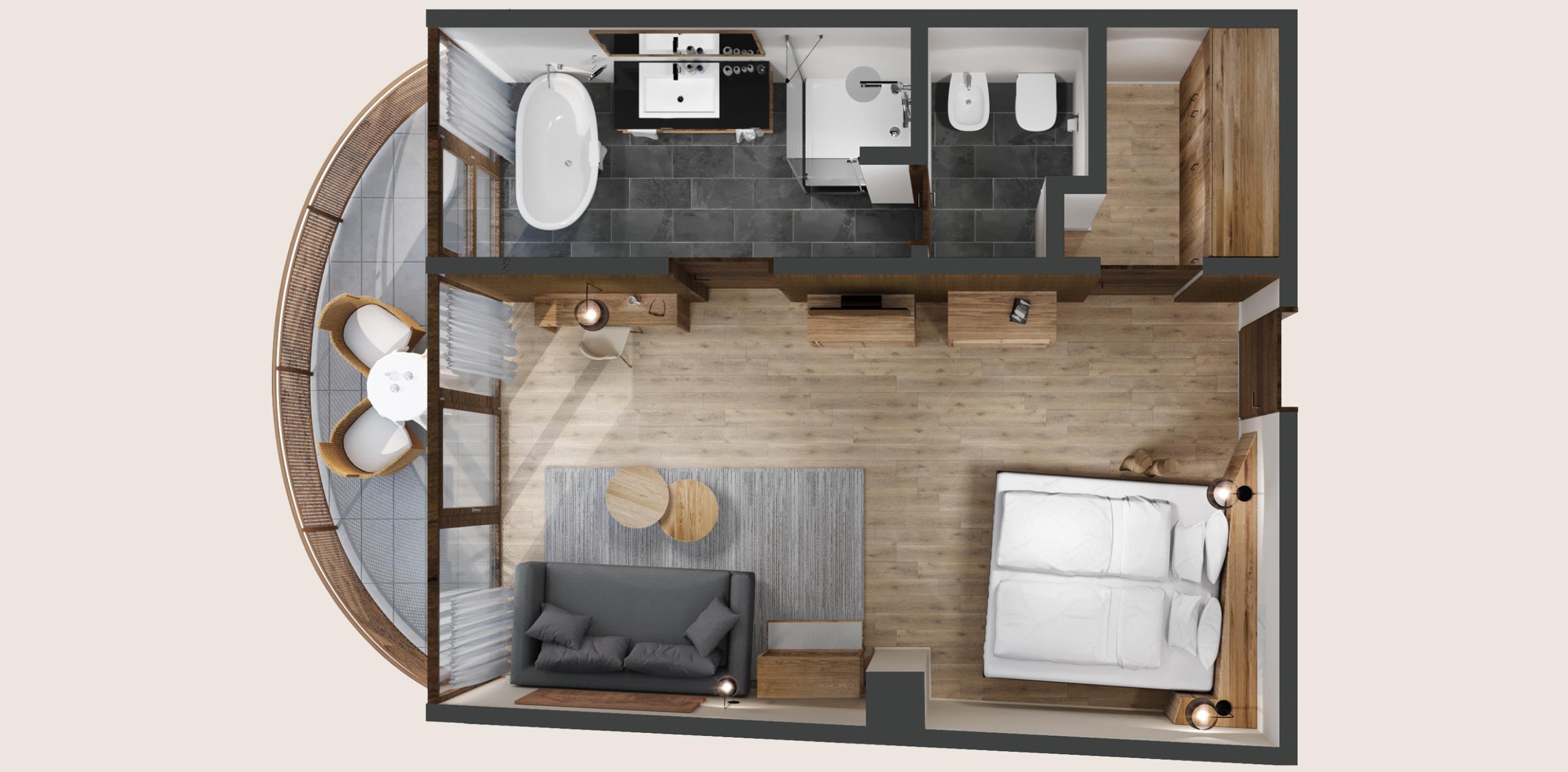 Soggiornate nella nostra camera panoramica in stile chalet con pavimento in legno, cabina armadio, accogliente stufa e comodo angolo divano. Momenti incantevoli aspettano nel lussuoso bagno con la vasca panoramica, doccia, WC/bidet separati. Relax totale sul balcone con una vista unica sulla vallata.