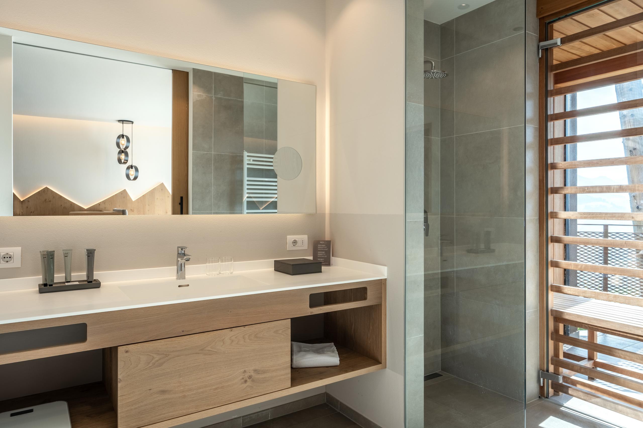 Spaziosa Suite panoramica con pavimento in legno, letto di lusso con vista panoramica mozzafiato e accogliente divano per sentirsi bene. GodeteVi la vista su tutta la valle nel bagno di lusso con sauna interna da sogno. Bagno con doccia, WC separato e bidet non lasciano nulla a desiderare. Rilassatevi sul balcone e godetevi il nostro mondo di montagna.