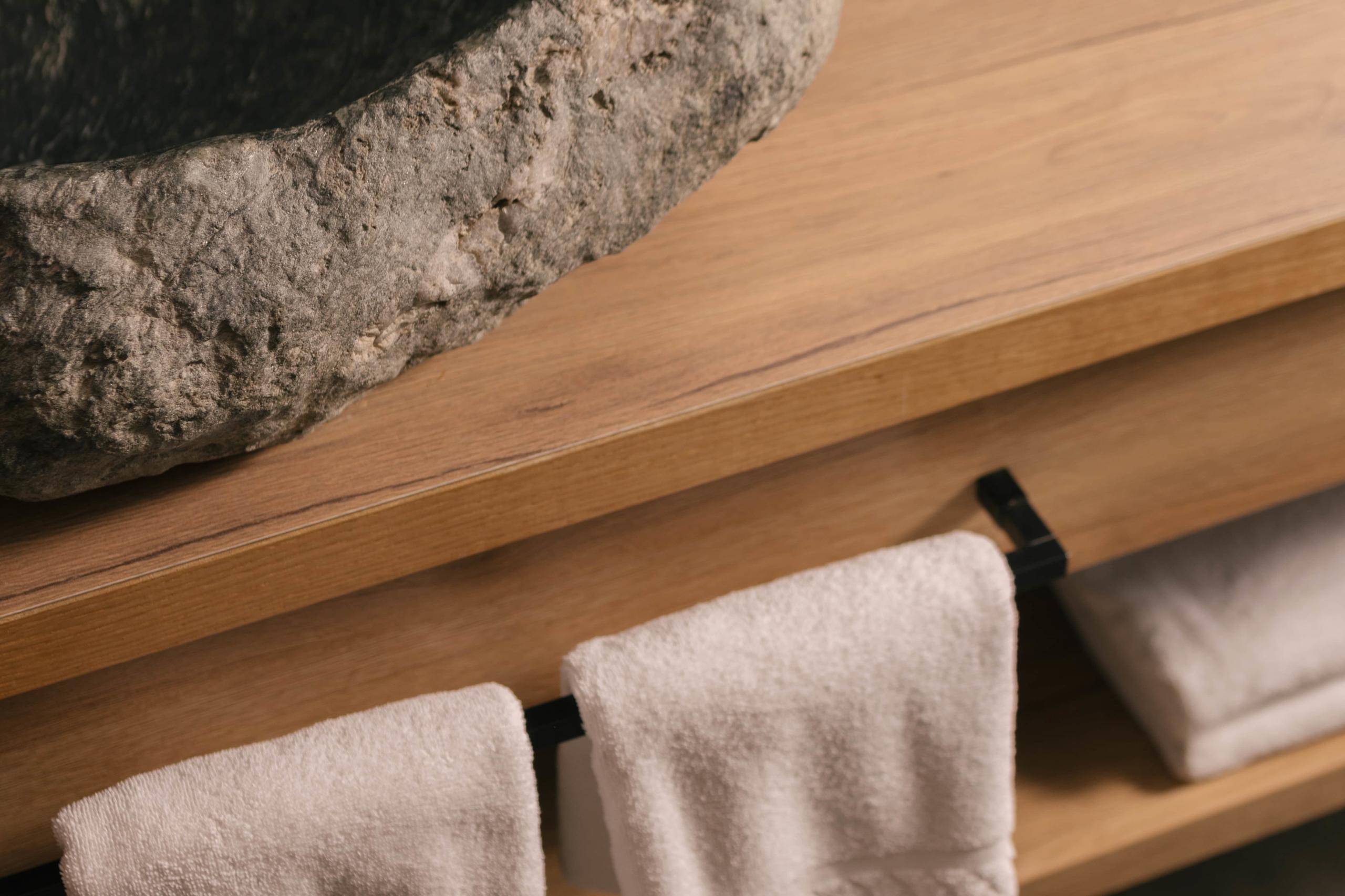 L'unicità della Camera Naturale Stella Alpina: questa camera, con il suo design moderno e l'arredamento in legno di quercia, tessuti in loden e pareti in Terrastone, è una vera oasi naturale. Situata al quarto piano, offre una vista ancora più spettacolare sul Rosengarten. Il bagno spazioso con doccia per due e un lavandino scolpito in pietra naturale completa la particolarità di questa stanza.
