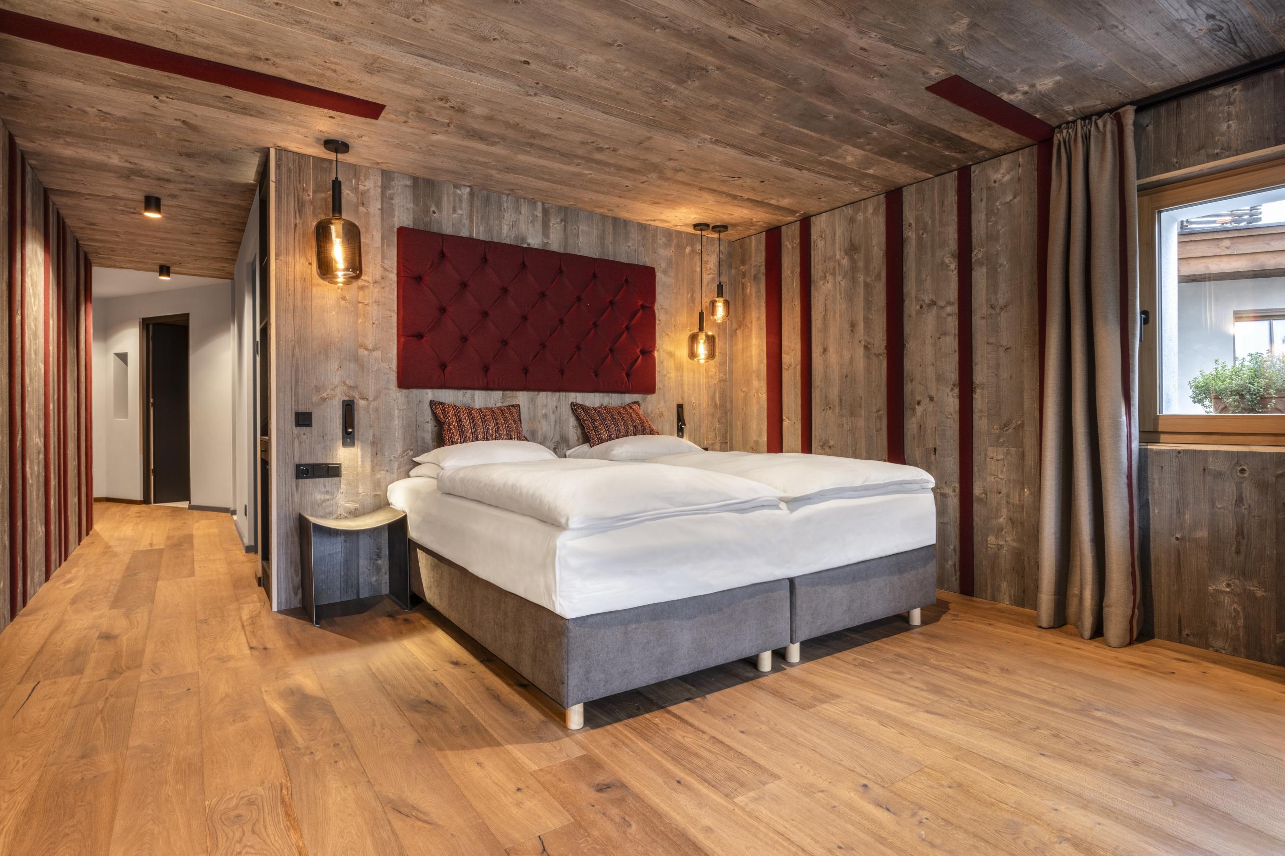 Suite Enrosadira di ca. 65 m² con due camere da letto, cabina armadio, vasca e doccia, servizi separati, flat TV, cassaforte, frigobar e con balcone e vista su San Cassiano.