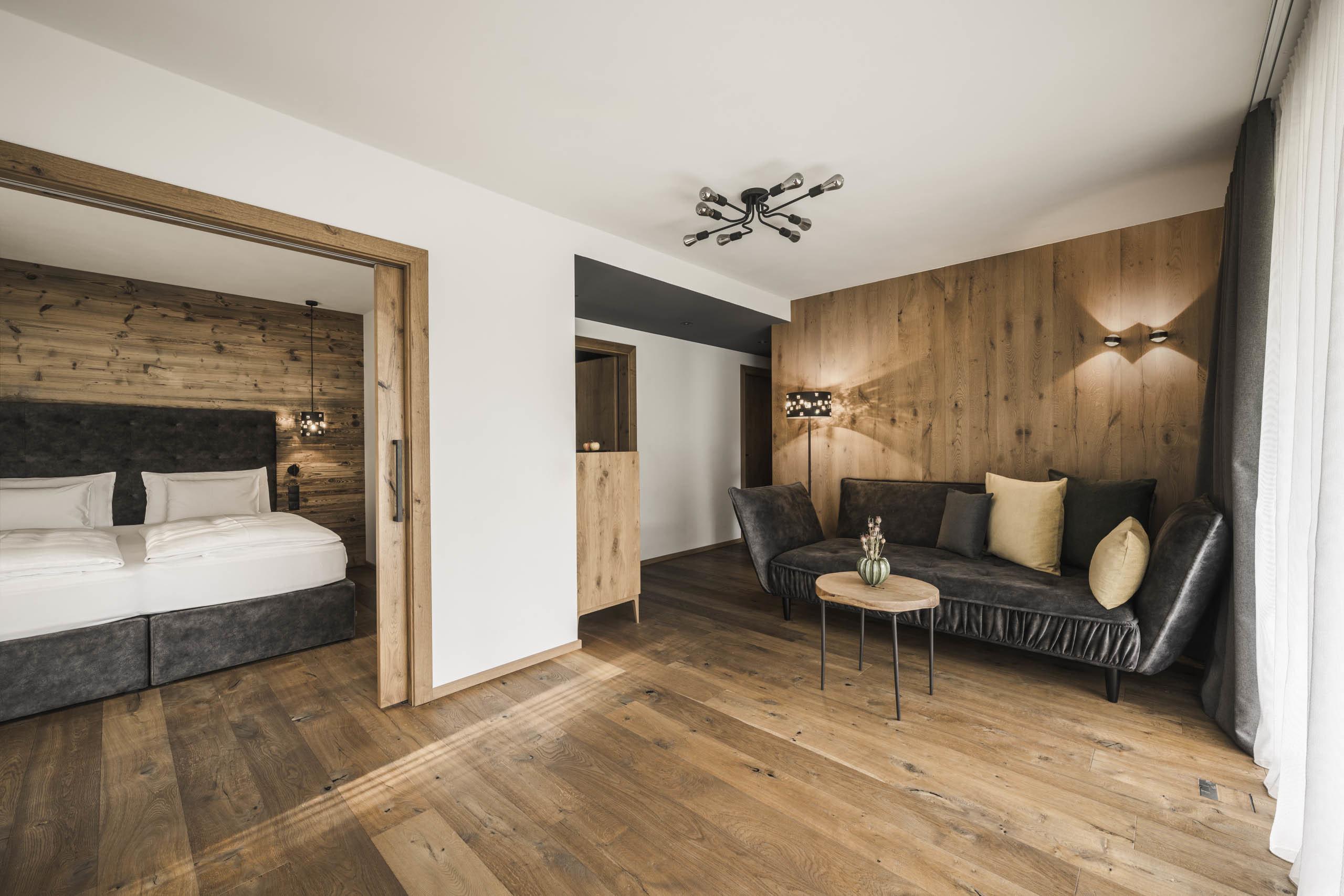 Suite familiare ad angolo de luxe in stile chalet di 70 m² con balcone di 20 m², arredamento e pavimento in legno naturale. Soggiorno con chaise longue, camera da letto con letto king-size, ulteriore camera da letto con letto castello, primo bagno de luxe con doccia relax, WC e bidet separati, lavandino doppio in marmo, angolo beauty-petinoise, secondo bagno con vasca, lavandino in marmo e WC. Minibar con angolo Nespresso e bollitore, telefono, TV satellitare a LED, cassaforte, Wi-Fi gratuito. Morbidi accappatoi, teli da piscina, ciabatte e zaino. Balcone coperto con sole pomeridiano e vista sul bosco e sauna finlandese con raggi infrarossi. Spazio garage incluso. Non sono ammessi animali domestici.