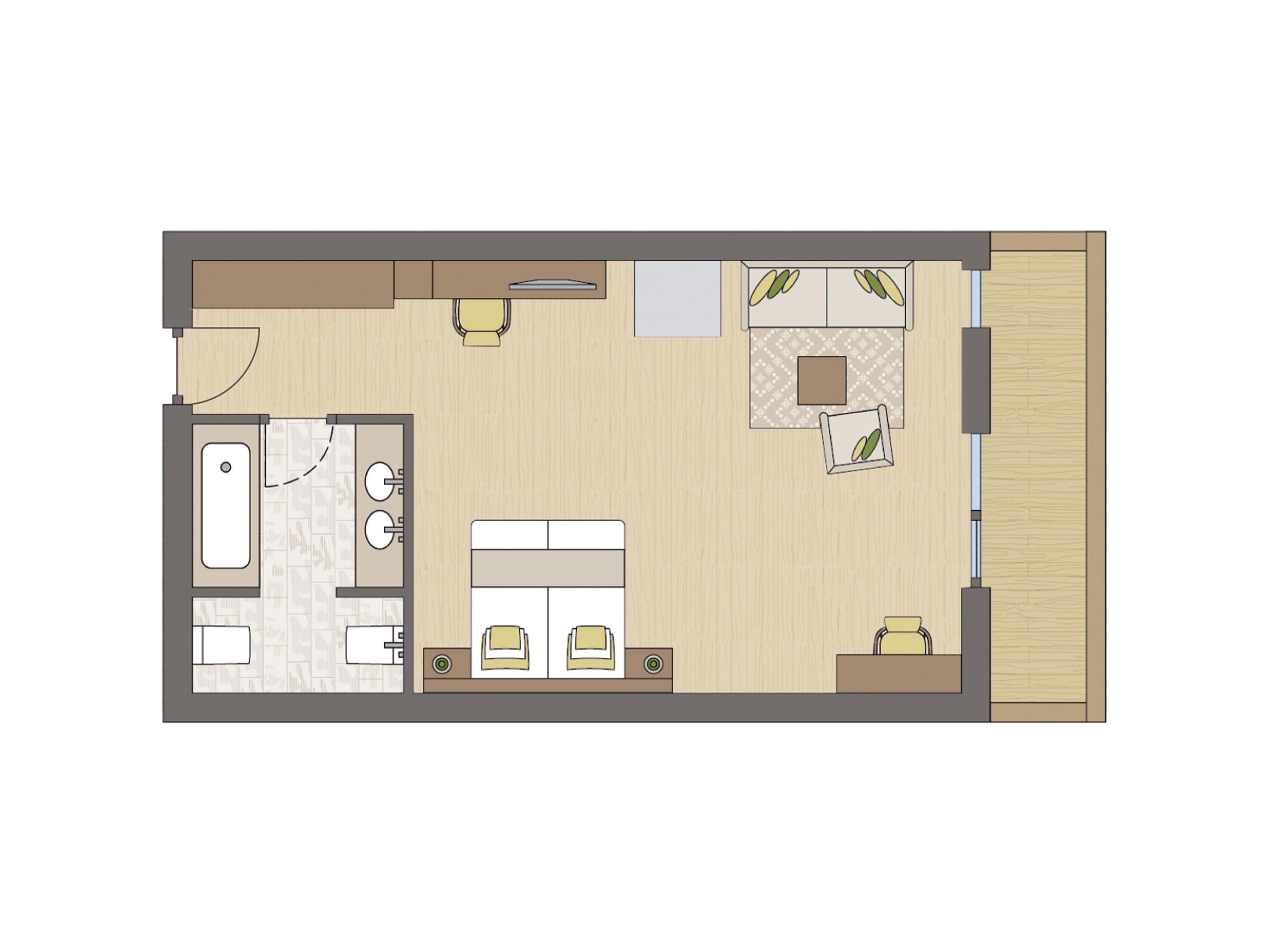 Camera doppia in stile alpino moderno di 37 m², arredamento e pavimento in legno. Chaise longue o poltrone, letto matrimoniale king-size, scrivania, bagno con doccia o vasca/doccia combinata, WC e bidet, lavandino singolo o doppio lavandino in marmo, specchio per la cosmesi, asciugacapelli, telefono, TV satellitare a LED, cassaforte, minibar, Wi-Fi gratuito. Morbidi accappatoi, teli da piscina, ciabatte, zaino. Alcune camere Lavarella dispongono di un separé. Balcone con vista panoramica. Spazio garage incluso. La disposizione e l’arredamento delle camere possono variare.