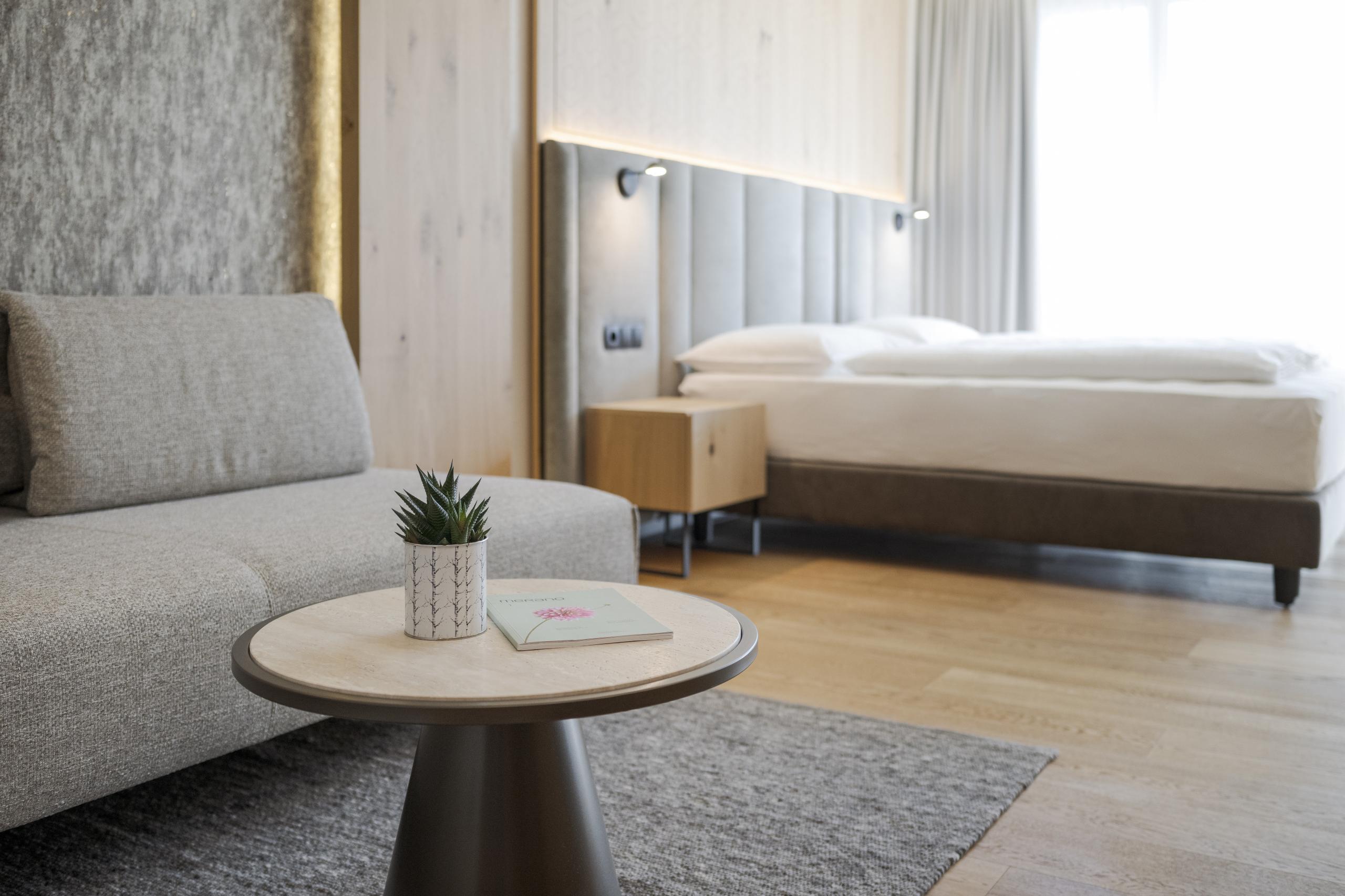 32 m² - Lasciatevi svegliare da gioiosi raggi di sole. La nostra camera doppia Raggio di sole è arredata con un accogliente angolo soggiorno ed una poltrona, pavimento in legno, mobili in legno naturale, bagno moderno con doccia walk-in, WC separato (senza bidet), frigobar, cassaforte, flat screen TV, telefono, WIFI gratuito, balcone rivolto a sud con sdraio relax, posto garage e aria condizionata.