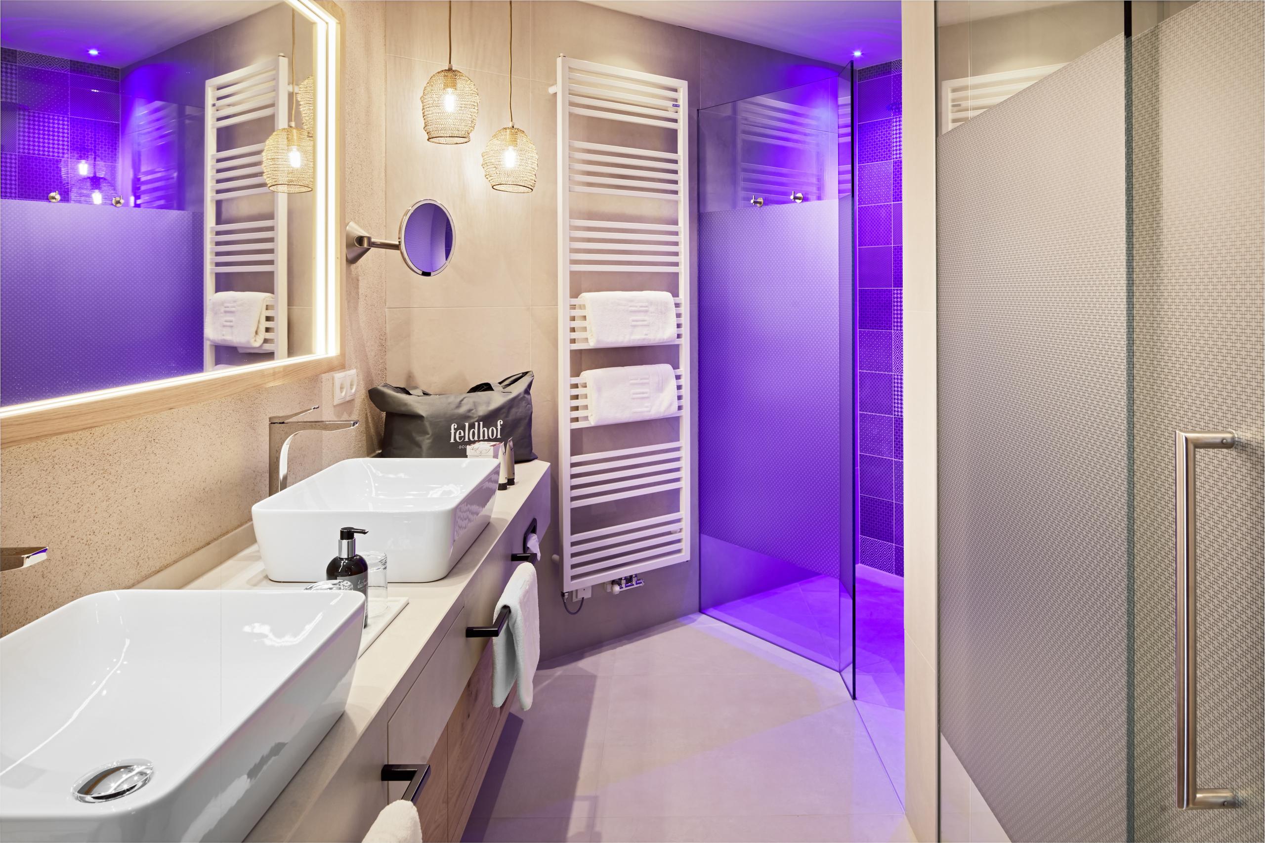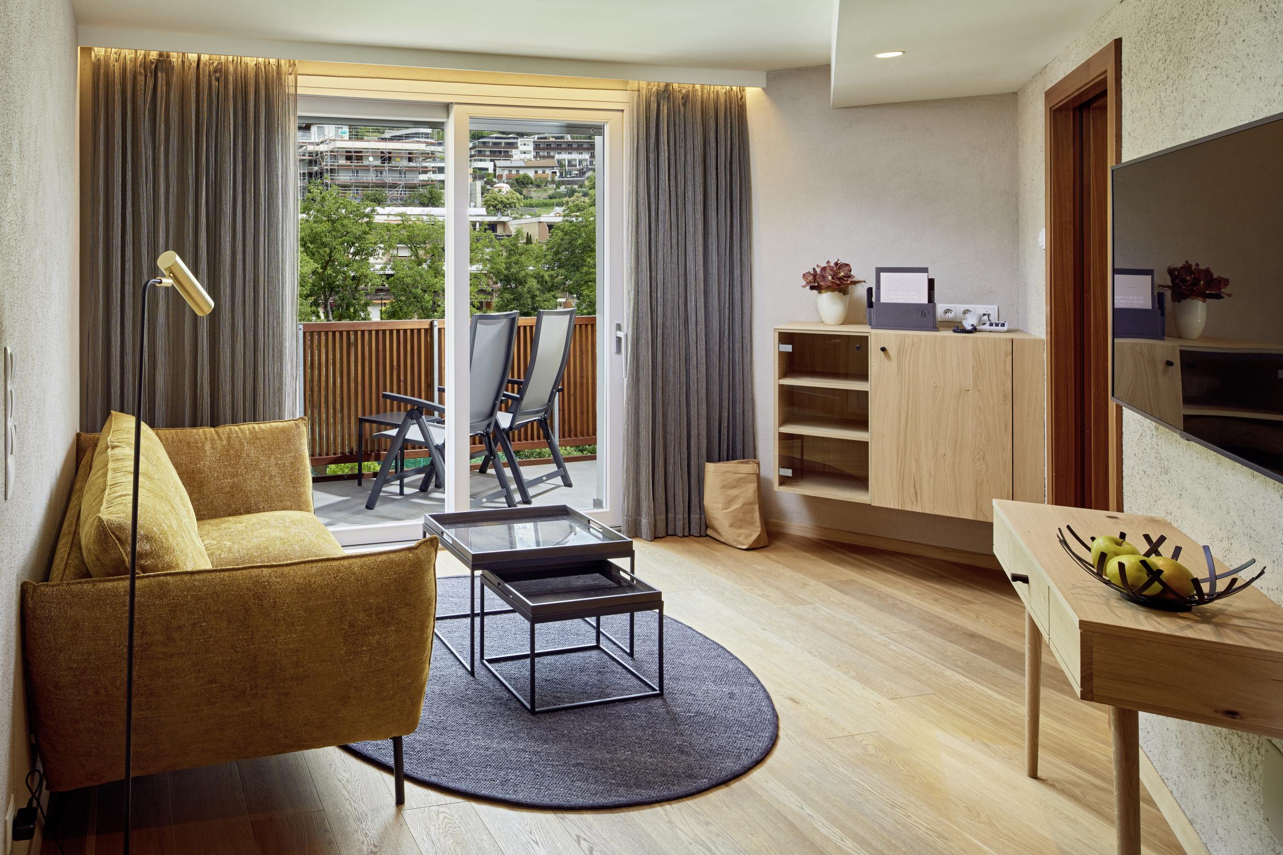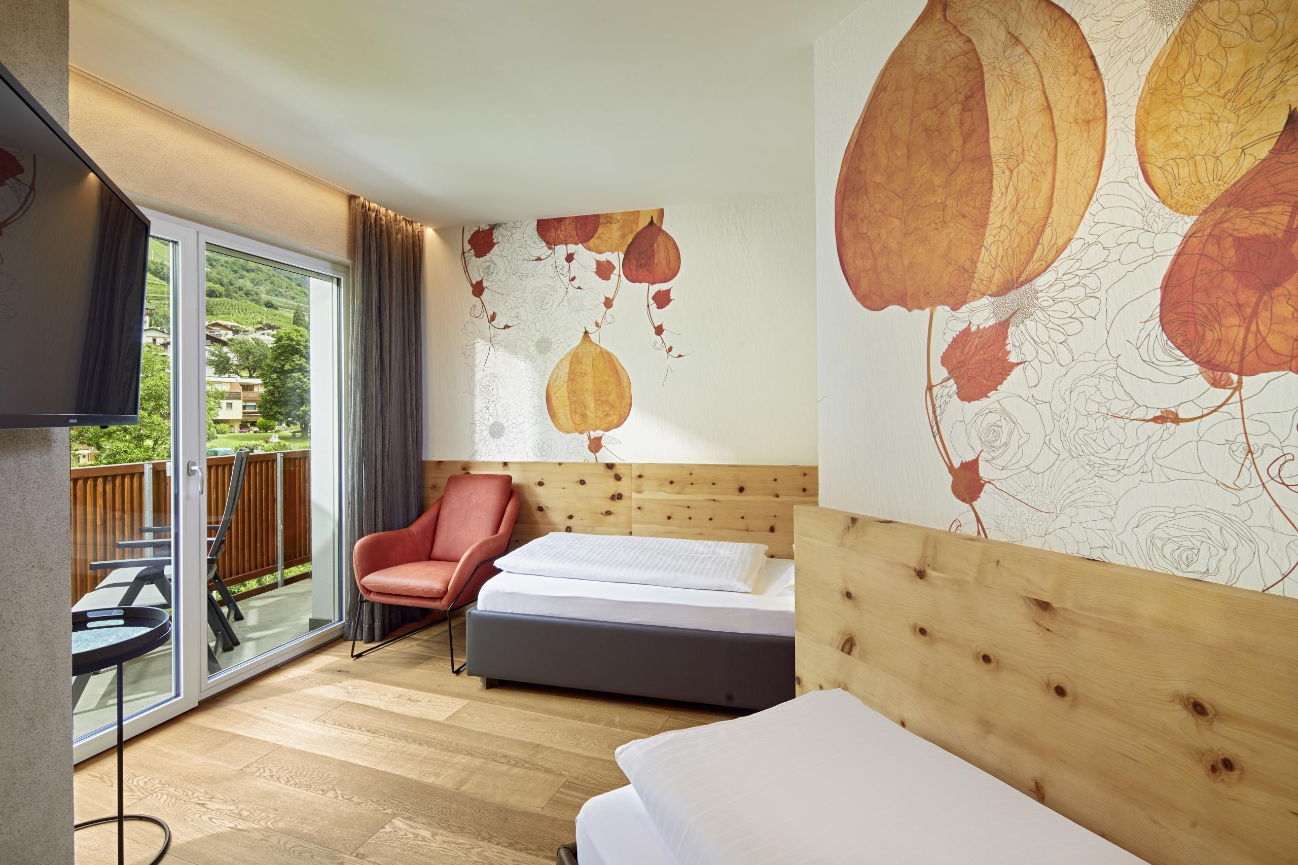 50 m² - Più spazio per più benessere. Con un arredamento esclusivo con accogliente salottino, pavimento in legno, mobili in legno naturale, camera bambini separata con due letti singoli, bagno moderno con grande doccia walk-in, doppio lavabo, WC separato (senza bidet), frigobar, cassaforte, 3 flat screen TV, telefono, WIFI gratuito, balcone rivolto a nord, posto garage e aria condizionata.