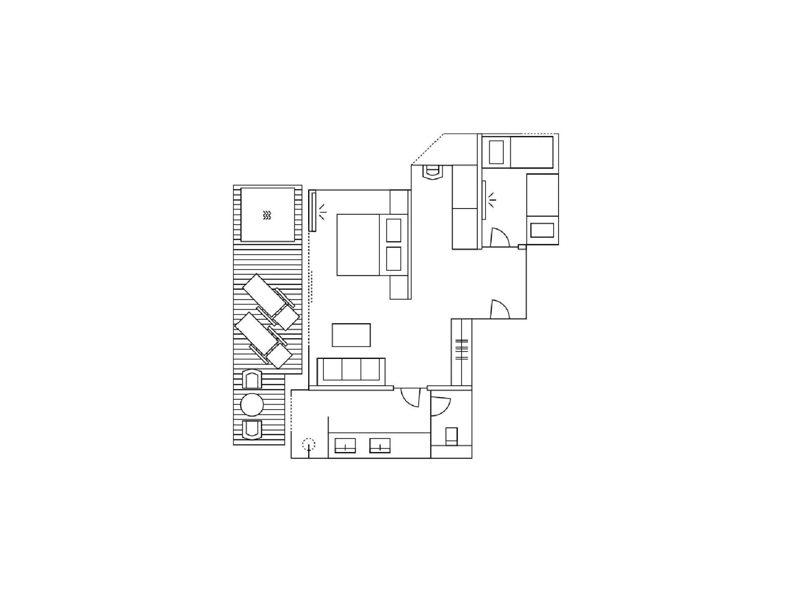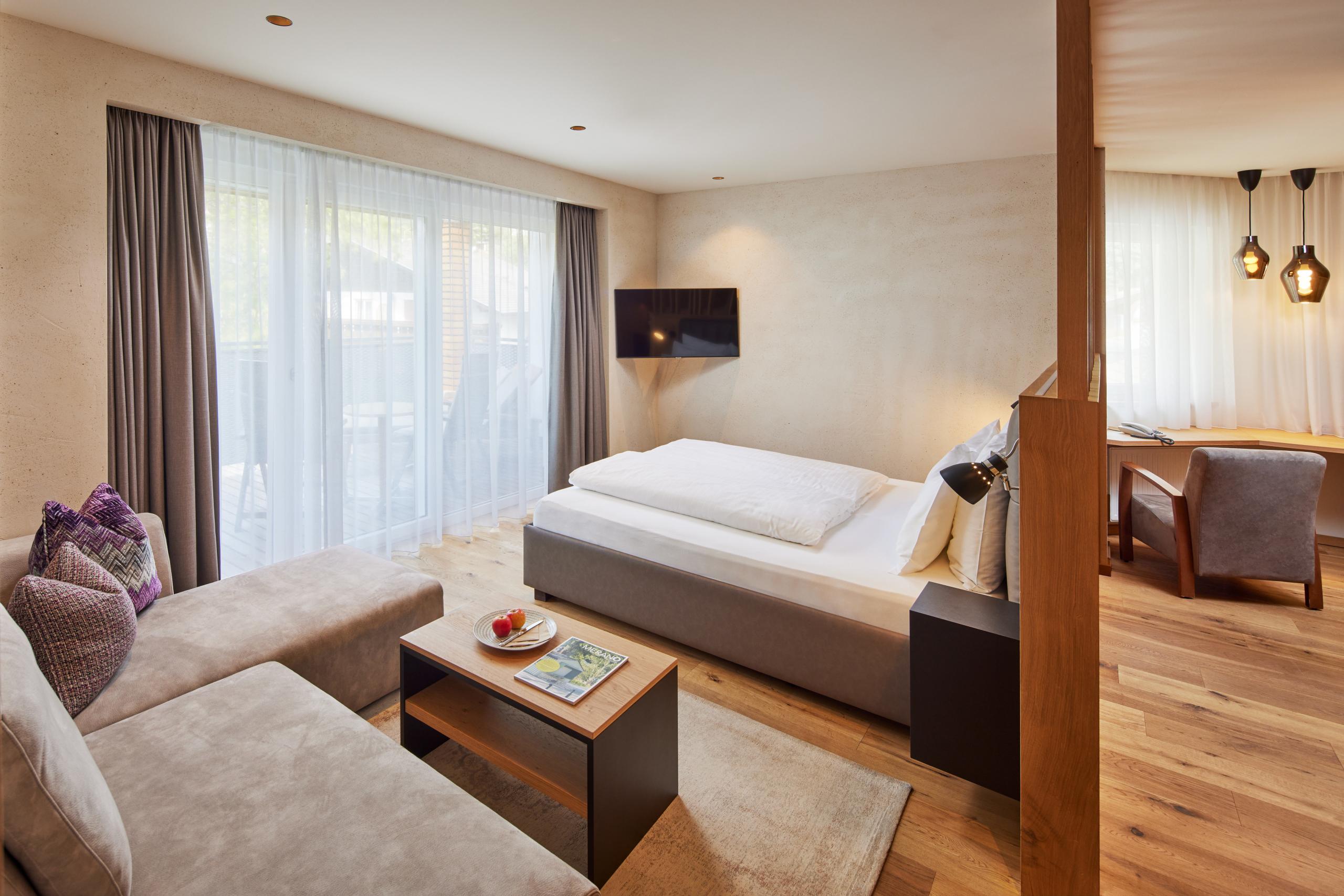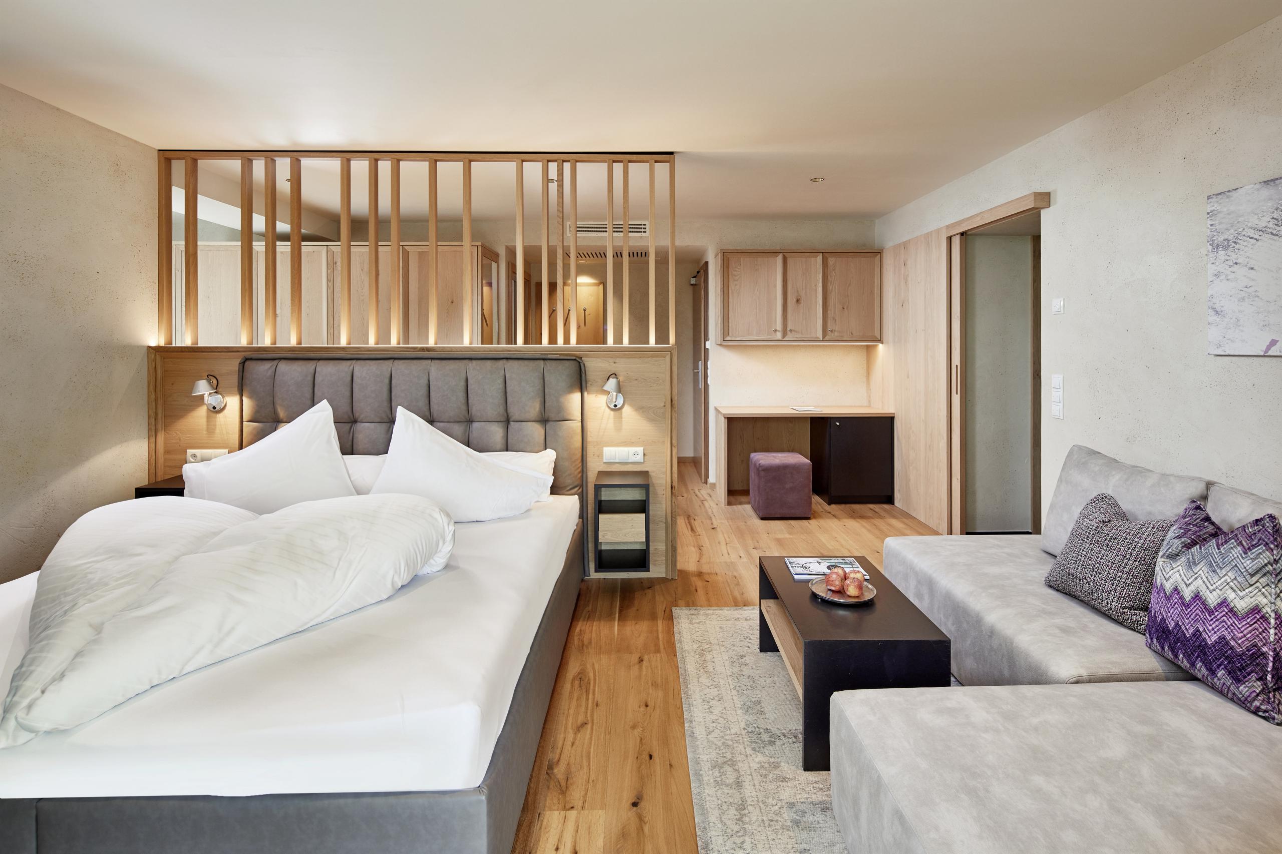 47 m² - Con questa suite, i vostri momenti time out diventano una piacevole esperienza per tutta la famiglia. Con un arredamento esclusivo con accogliente salottino, pavimento in legno, mobili in legno naturale, camera bambini separata con due letti singoli, bagno moderno con grande doccia walk-in, doppio lavabo, WC separato (senza bidet), frigobar, cassaforte, 2 flat screen TV, telefono, WIFI gratuito, grande balcone rivolto a ovest con vasca idromassaggio e daybed, posto garage e aria condizionata.