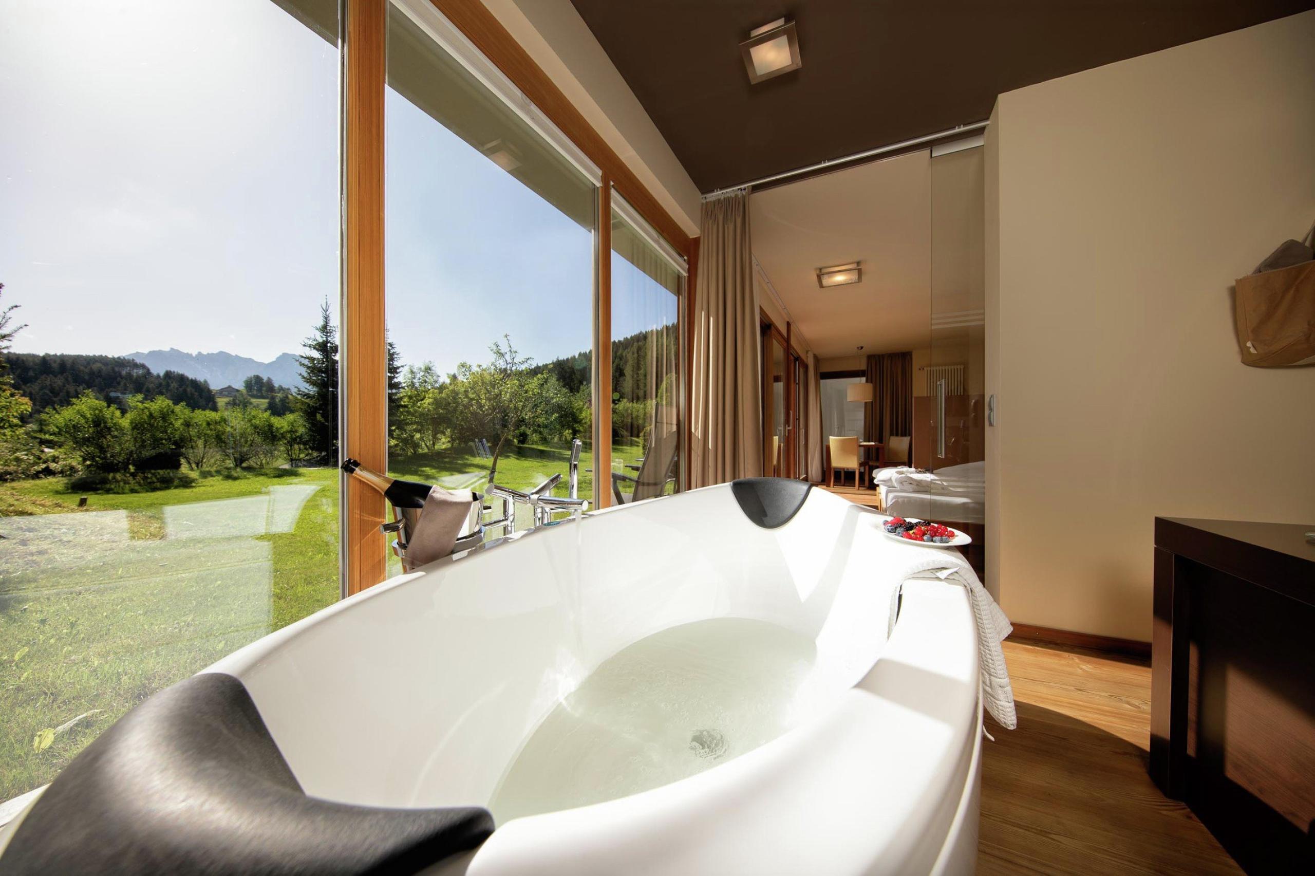 La Suite n. 1375 è una suite estravagante arredata molto modernamente con vista panoramica, soggiorno e stanza sono divise solo indirettamente, tutto con pavimento in legno, stoffe preziose e mobili da design, bagno bellissimo moderno, vasca e doccia, accappatoio, borsa wellness, fon, TV satellitare, wifi, cassaforte, prato privato attorno alla suite.