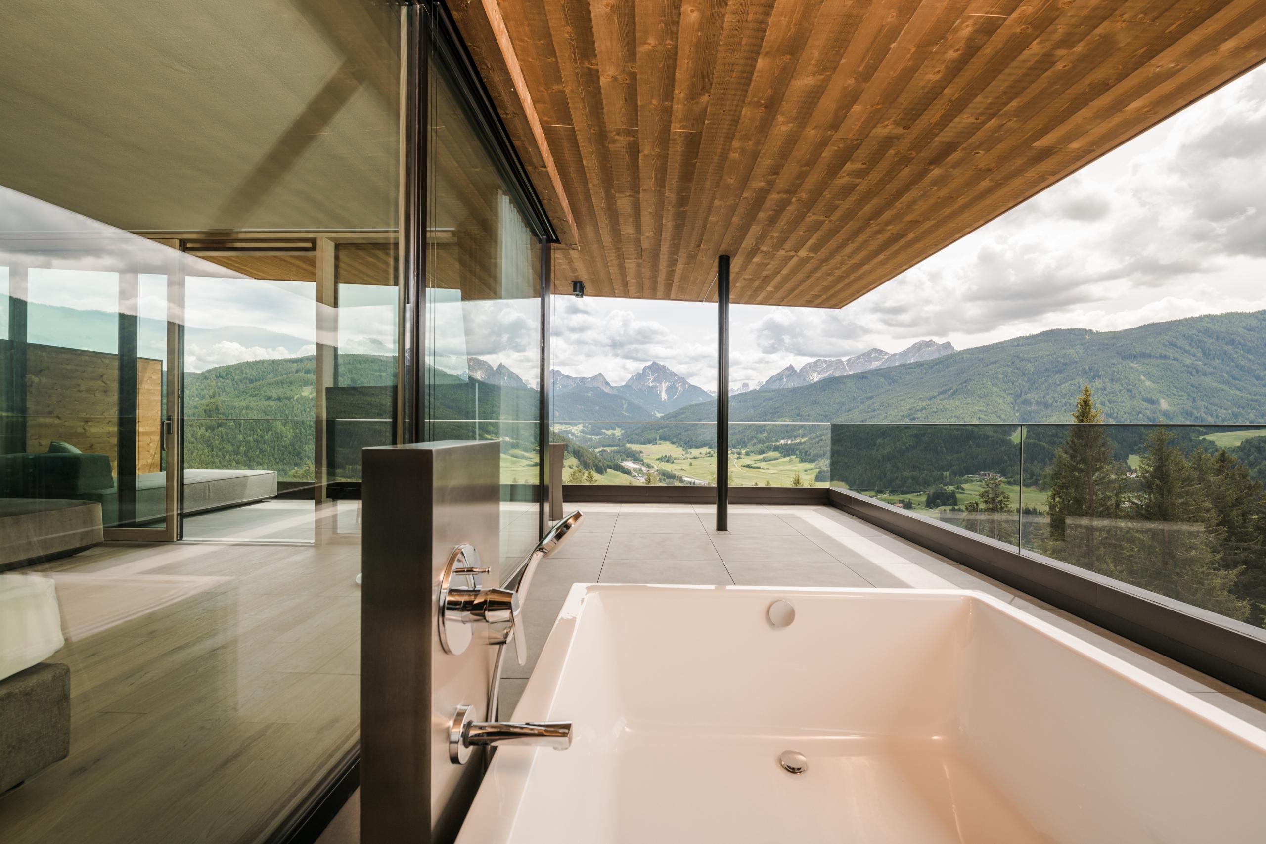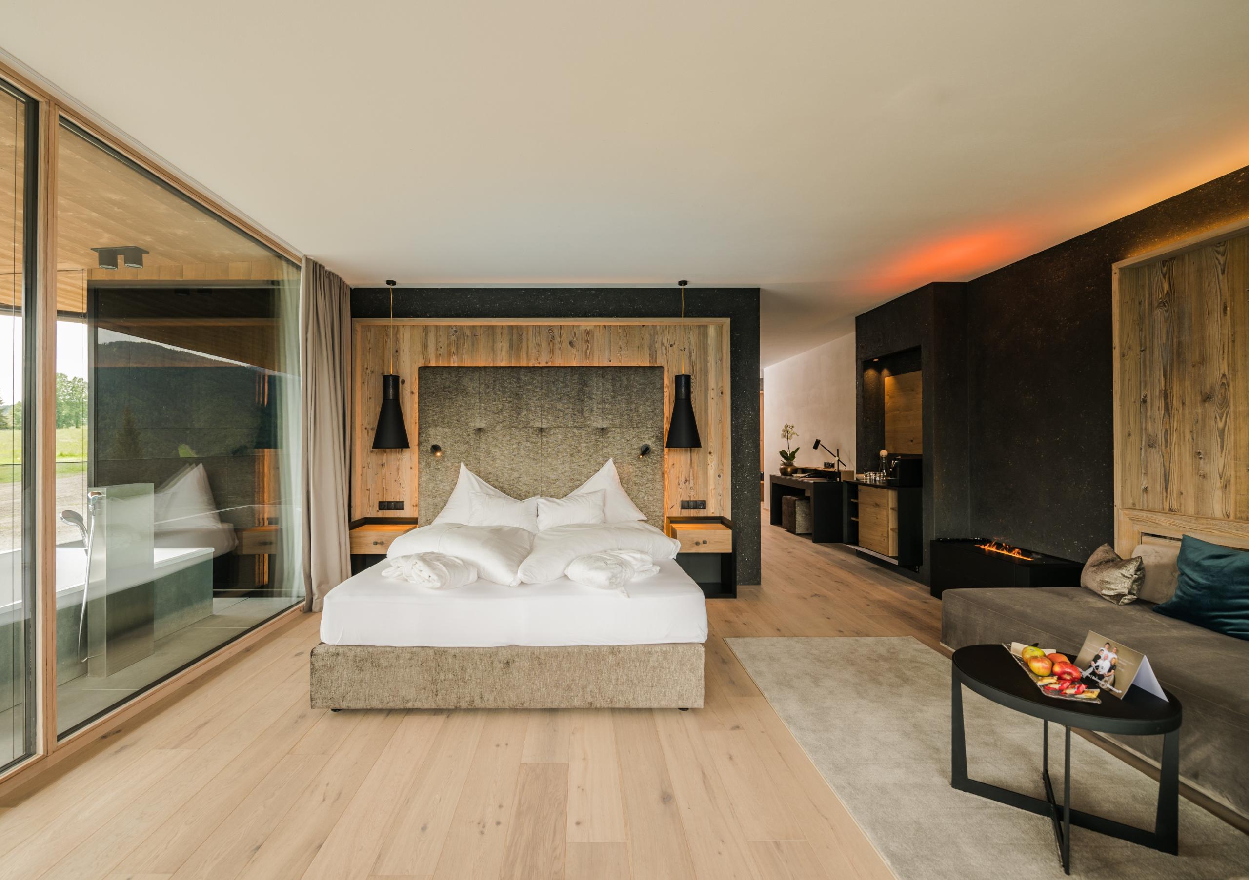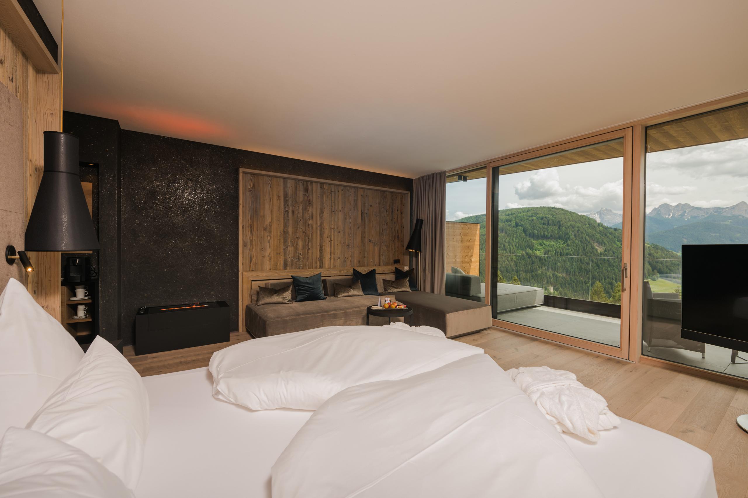 Pavimento in legno. Comodo letto matrimoniale di 2,10 m con spettacolare vista sul mondo alpino. Angolo relax con caminetto “The Flame”. Schermo piatto da 55 pollici. Free WiFi. Cassaforte. Minibar e assortimento di vini. Macchinetta per il caffè Cremesso. Terrazza sul tetto con vasca panoramica e vista da sogno. Lussuoso bagno con doccia partner e vasca. Asciugacapelli e specchio da trucco. WC e bidet separati. Seconda camera da letto con letto matrimoniale, schermo piatto e bagno in camera. Borsa wellness con accappatoi, teli da bagno e ciabattine. Incluso parcheggio sotterraneo.