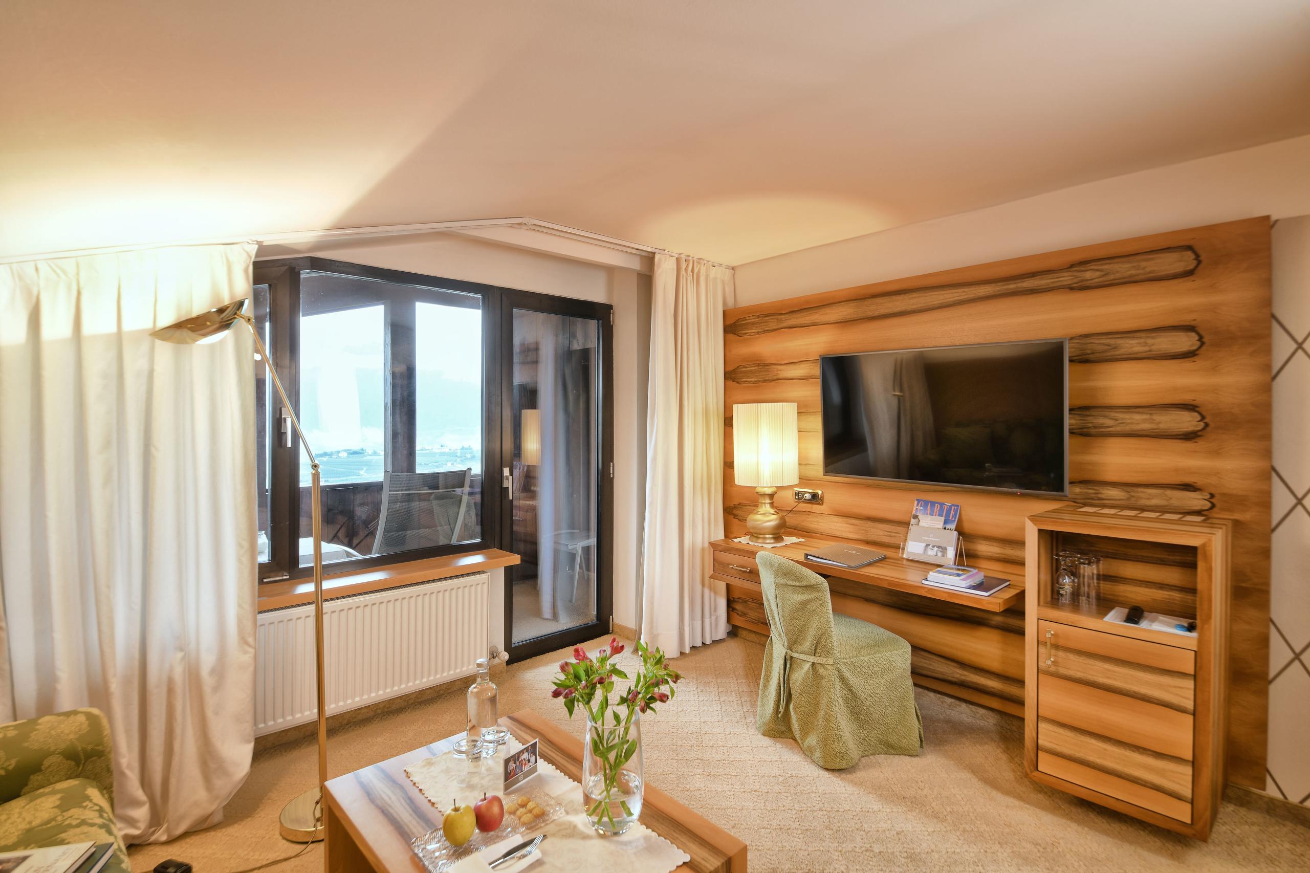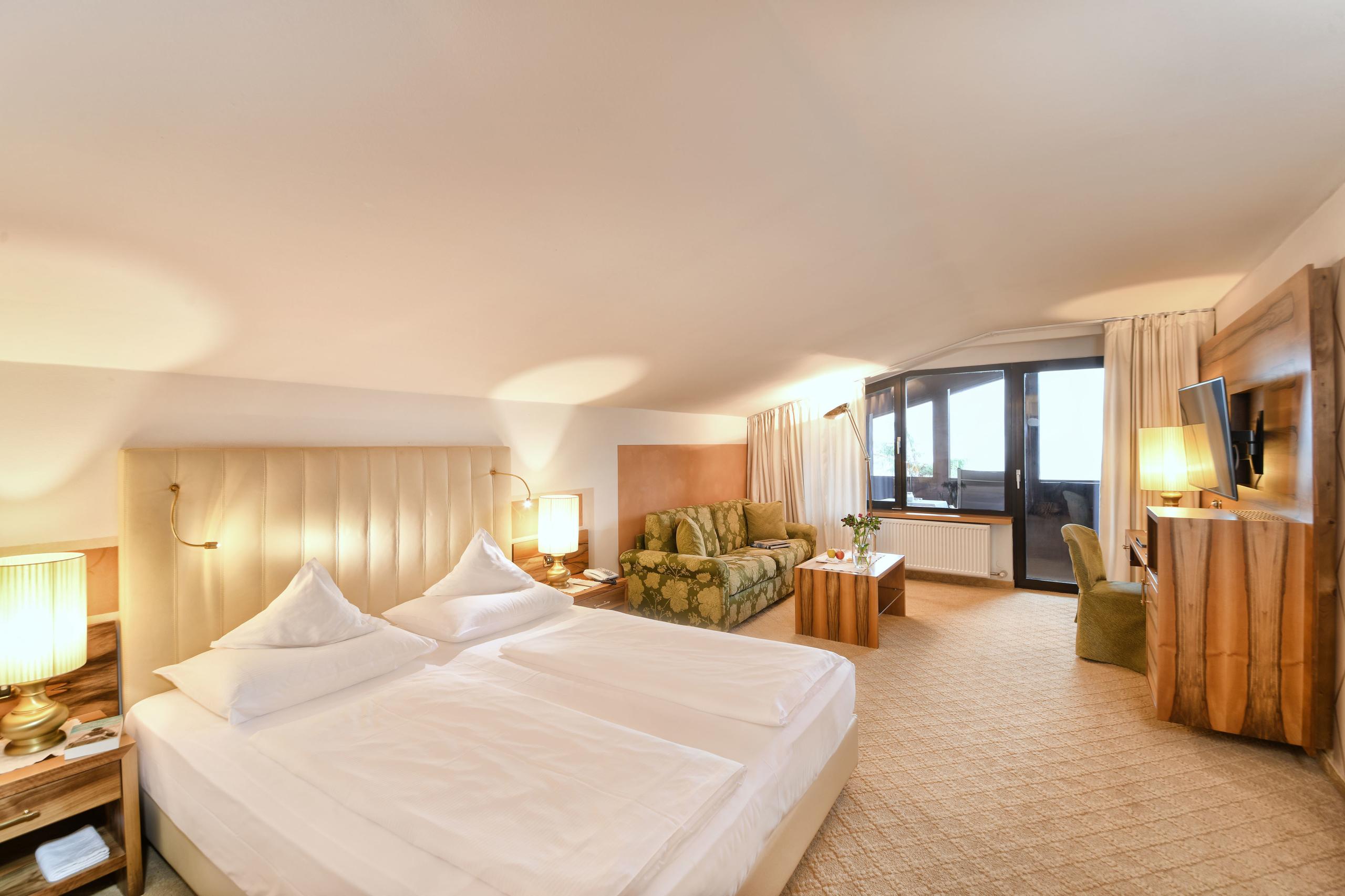 tradizionale balcone in legno con area relax | bagno con finestra, lavandino doppio, vasca e bidet | asciugacapelli e specchio cosmetico | area soggiorno con divano | scrivania con collegamento LAN | telefono, cassaforte e WiFi | TV a schermo piatto | minibar | moquette